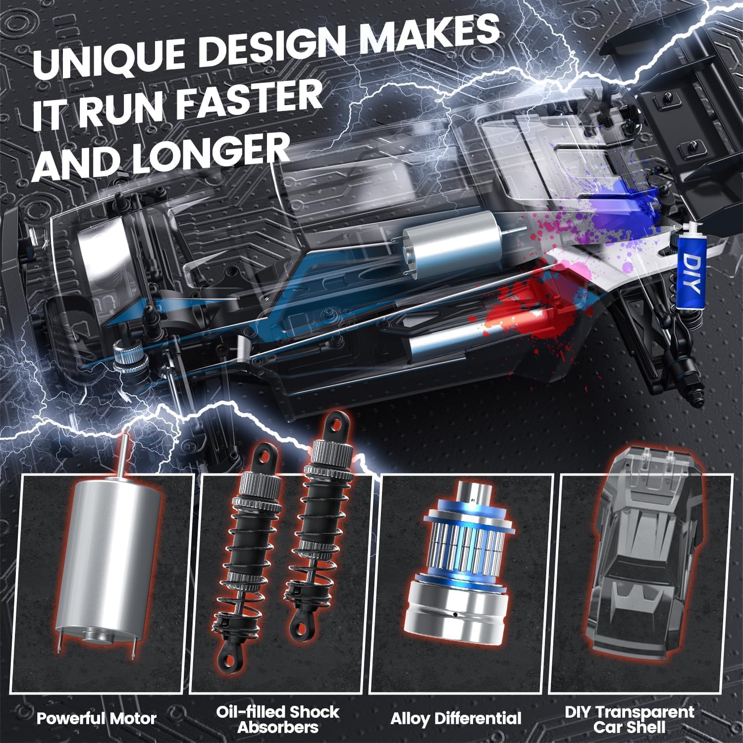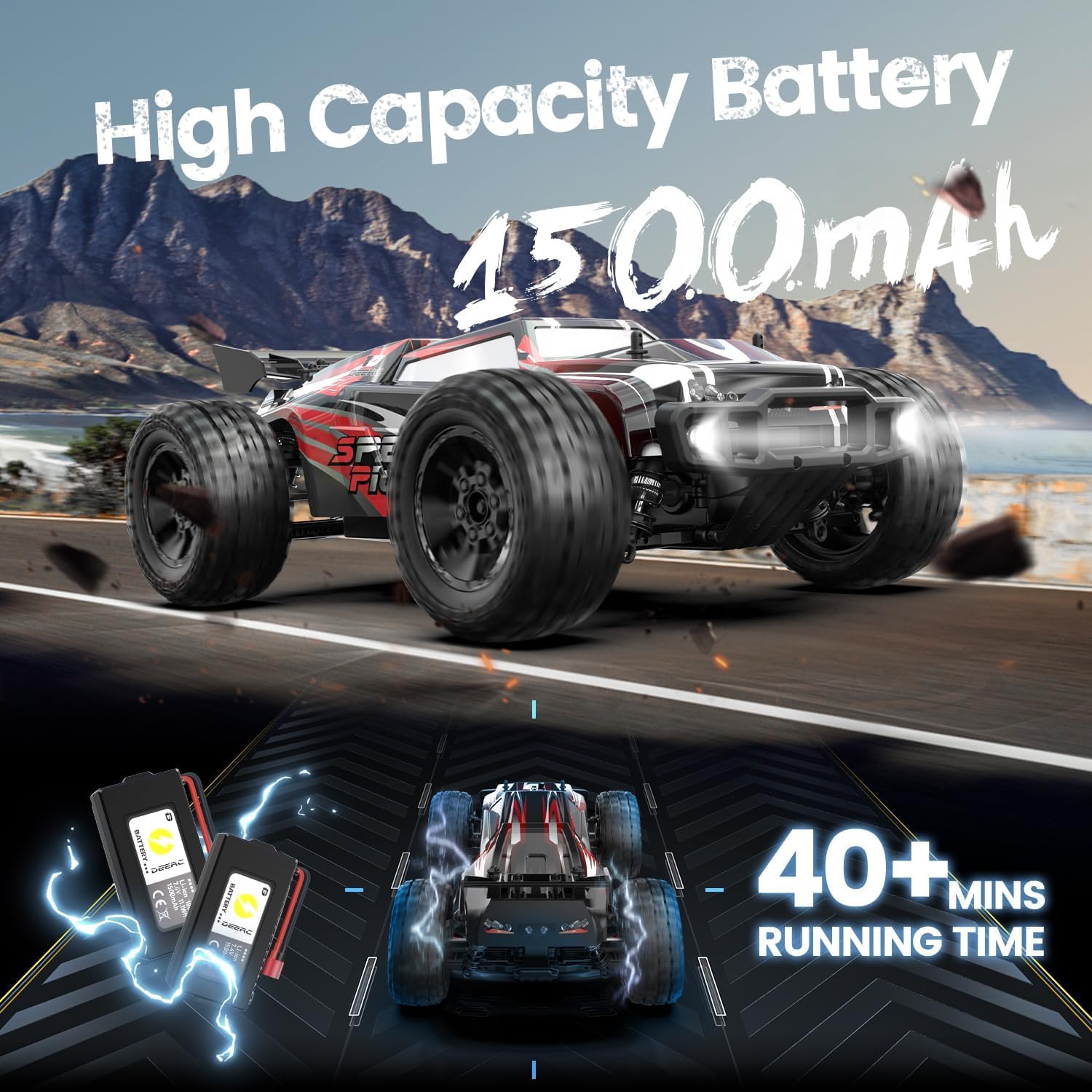 • Високи скорости от 48 км/ч: високоскоростният състезателен автомобил, оборудван със задвижване на четирите колела и издръжливи компоненти, достига скорост от 40 км/ч. Безплатно се предоставя и друг прозрачен корпус, който може да бъде боядисан с аерограф според вашите собствени идеи. За каране по здрач или през нощта, състезателният автомобил предлага два LED фара.