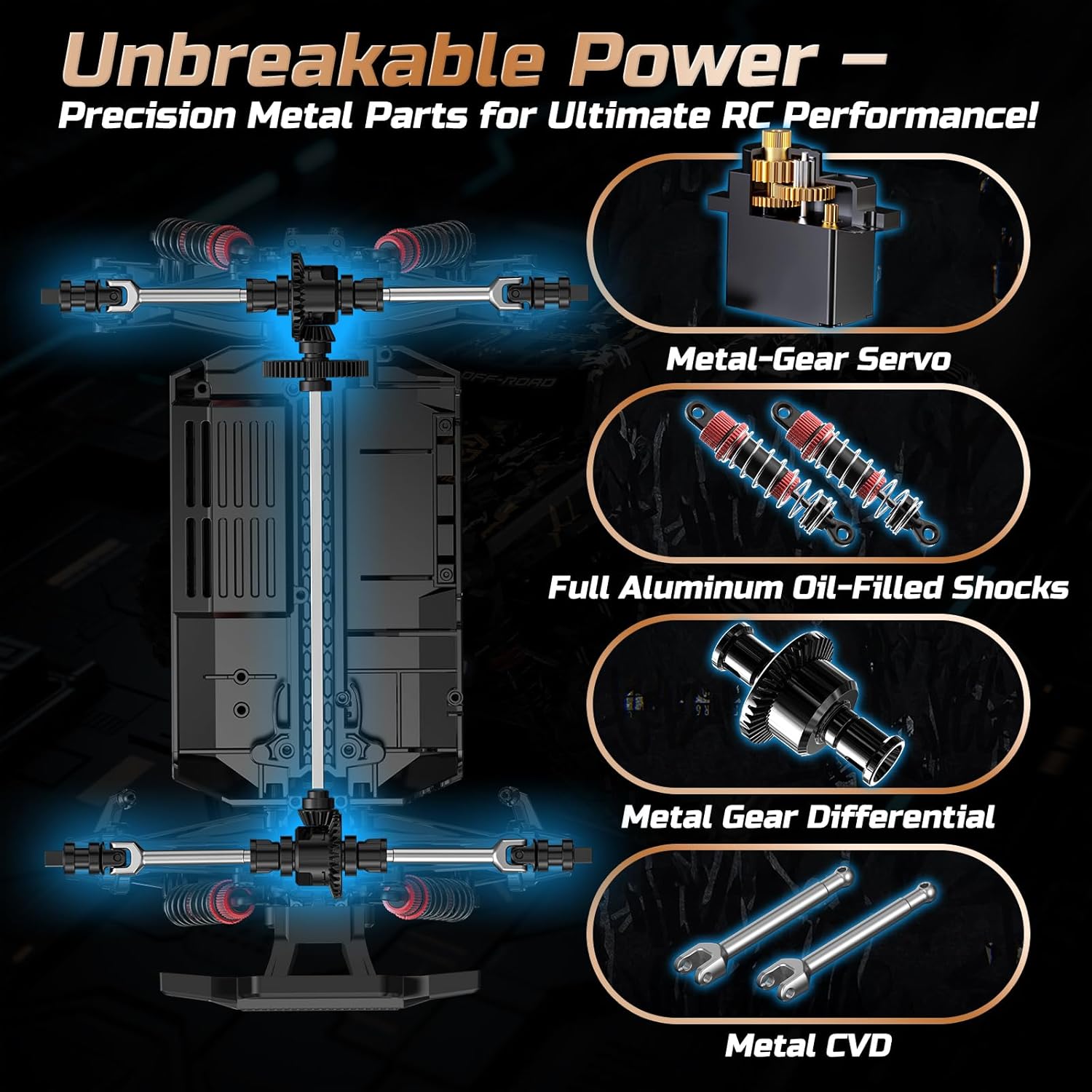 • 【ИЗЦЯЛО МЕТАЛНА ЗАДВИЖВАЩА СИСТЕМА - ИЗРАБОТЕНА ЗА МАКСИМАЛНА ПРОИЗВОДИТЕЛНОСТ】Оборудван с маслени амортисьори, диференциал, карданови валове и сервомотори - всички изработени от метал - този RC камион предлага изцяло метална задвижваща система за изключителна издръжливост и предаване на мощност. Независимо дали е пясък, кал, чакъл или морава, този мощен автомобил овладява всеки терен с лекота. Изживейте тръпката от истинско офроуд състезание отблизо.