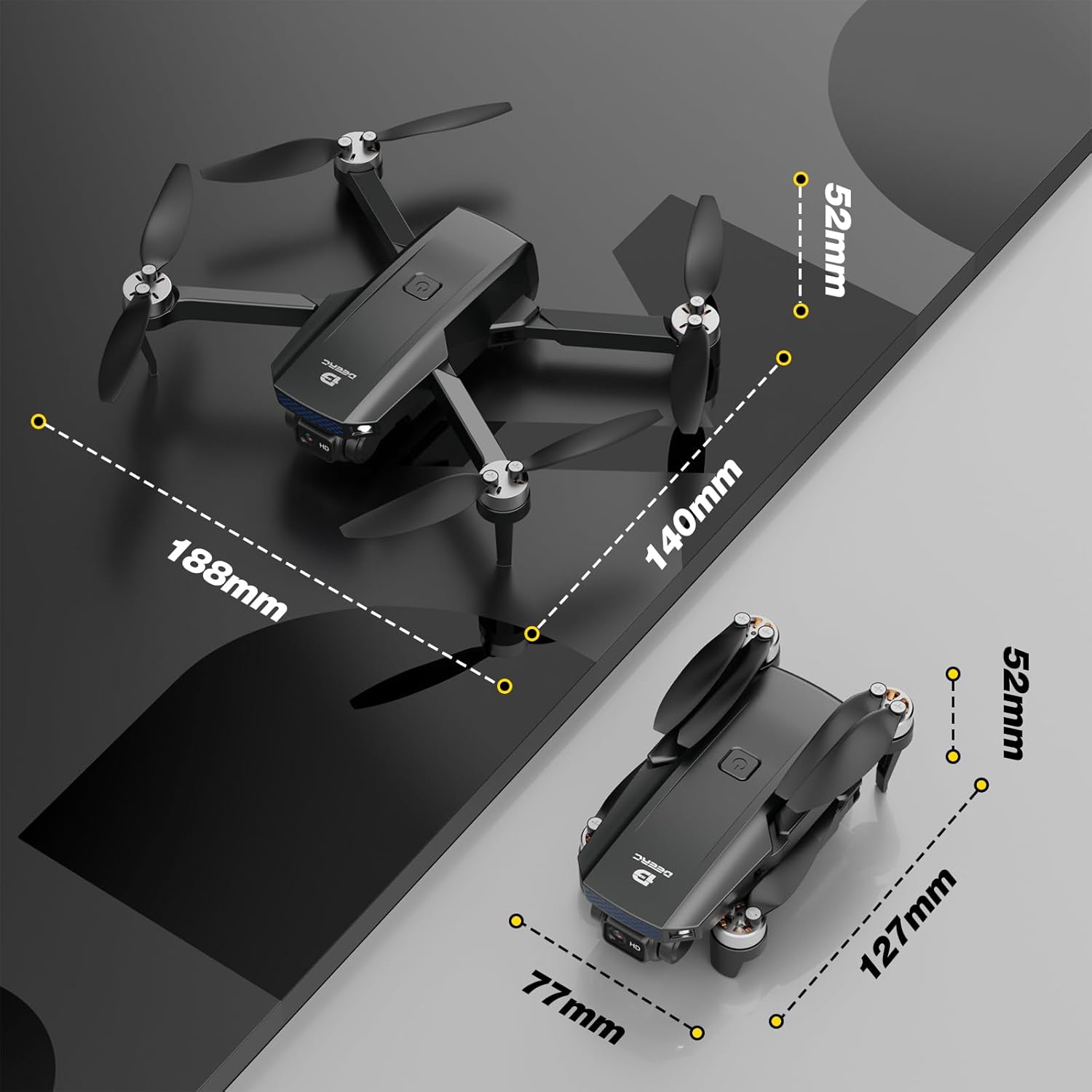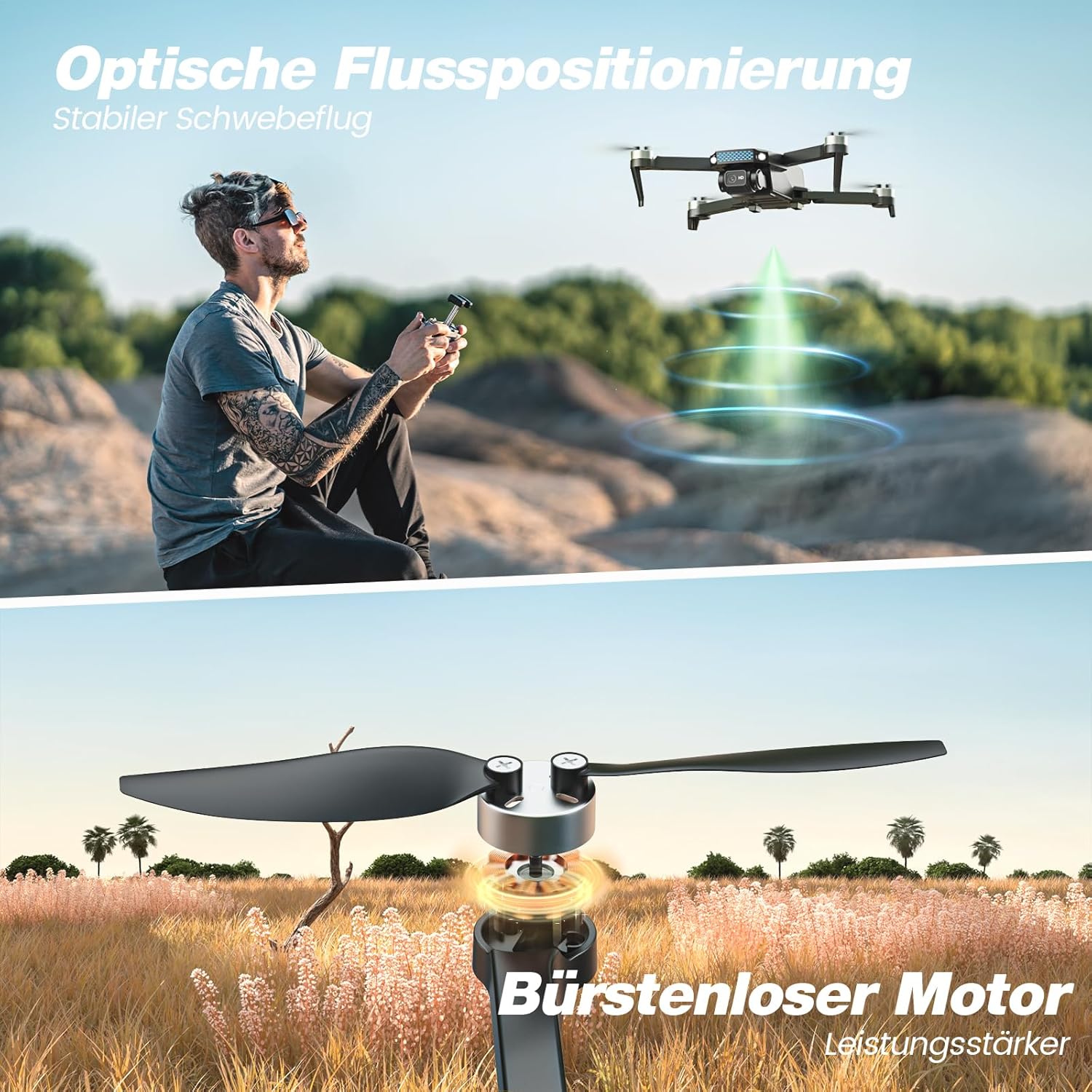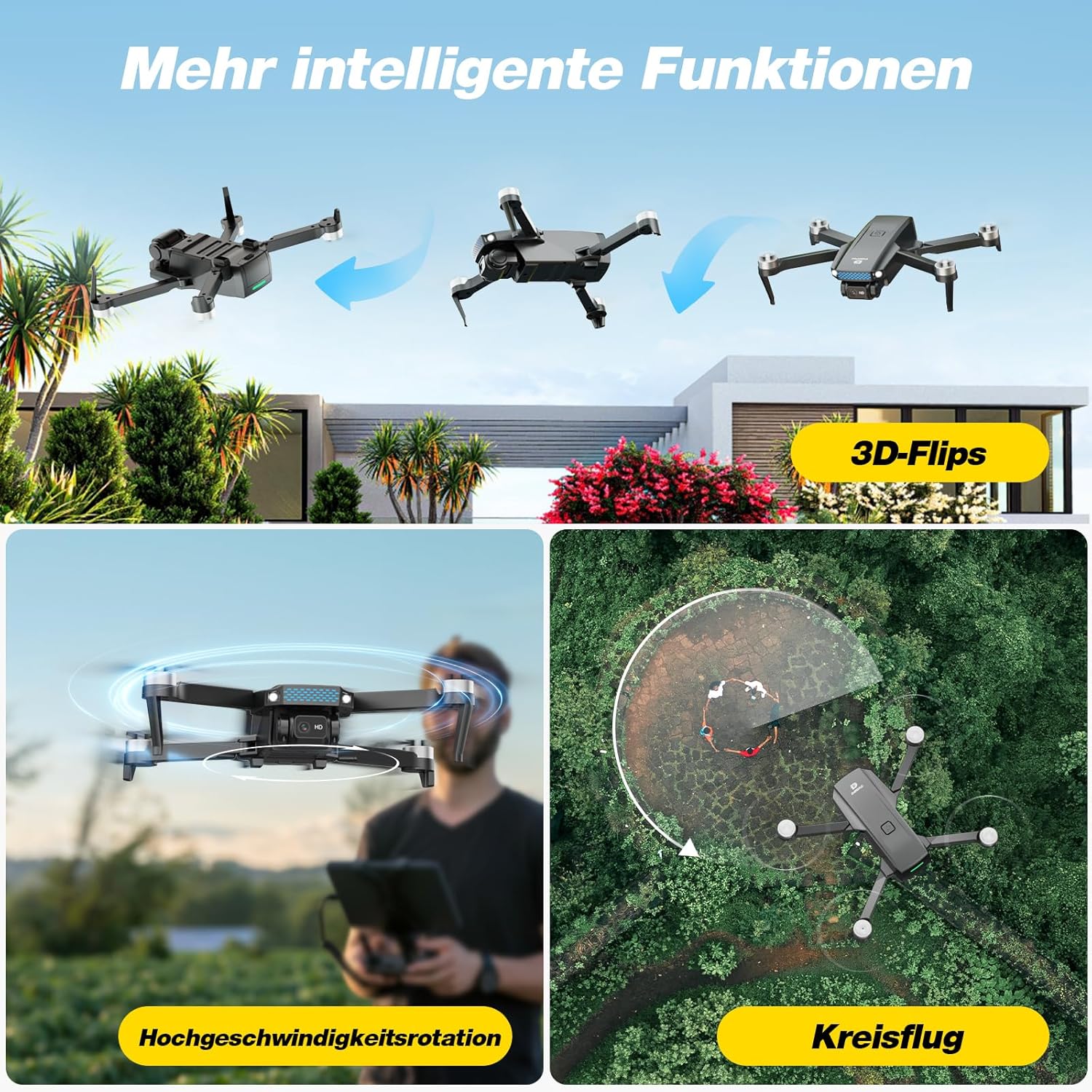• Ясна HD камера и стабилен поток: D20S е оборудван с 1080P HD камера и оптична система за позициониране на потока - идеална за стабилна въздушна фотография с висока резолюция. Благодарение на дистанционно управляваното регулиране на ъгъла на 90° и функцията за жестова фотография, перфектните снимки са детска игра.
