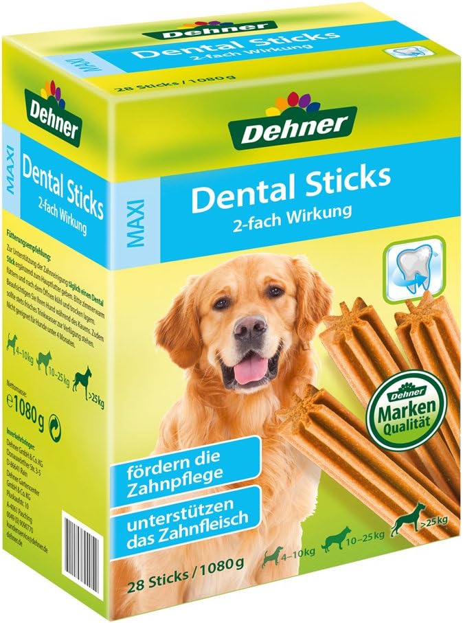 С Dehner Dental Sticks не само предлагате на кучето си вкусна закуска, но и влияете положително на денталното му здраве с двойното си действие . Опаковани в удобна месечна кутия от 28 стикове, Dehner Dental Sticks са идеално допълнение към рутината на вашето куче, както като закуска, така и за грижа за зъбите, и , разбира се, не съдържат захар. Тези висококачествени Dehner Dental Sticks се предлагат в три различни размера (Mini, Medium, Maxi), така че можете да изберете перфектния размер за вашето куче. Вкусна кучешка закуска и грижа за зъбите с двойно действие: Много кучета се борят със зъбни и венци. Dehner Dental Sticks предлагат на вашето куче вкусно дъвчене и редовна грижа за зъбите в едно. Минералът зеолит в закуската помага за премахването на плаката и по този начин може да предотврати натрупването на зъбен камък и кариеси . Освен това, специалната структура и звездообразната форма на Dehner Dental Sticks масажират и укрепват венците по време на дъвчене , като ефективно почистват и зъбите . Калцият в тази вкусна кучешка закуска е известен с положителния си ефект върху зъбите и костите. Денталните пръчици Dehner са толкова вкусни, че кучето ви ще очаква с нетърпение ежедневната си грижа за зъбите. Тези висококачествени Дентални пръчици Dehner се предлагат в размери Mini, Medium и Maxi, съобразени с различните размери на кучетата. Допълнителна храна. Препоръка за хранене: Mini: За кучета между 4 и 10 кг. За подпомагане на денталната хигиена, давайте по един Дентален стик дневно в допълнение към основната им храна. Не е подходящо за кучета под 4 месеца. Medium: За кучета между 10 и 25 кг. За подпомагане на денталната хигиена, давайте по един Дентален стик дневно в допълнение към основната им храна. Не е подходящо за кучета под 4 месеца. Maxi: За кучета над 25 кг. За подпомагане на денталната хигиена, давайте по един Дентален стик дневно в допълнение към основната им храна. Не е подходящо за кучета под 4 месеца. Моля, хранете при стайна температура и съхранявайте на хладно и сухо място след отваряне. Наблюдавайте кучето си, докато дъвче. Винаги трябва да има на разположение прясна питейна вода. Състав: Зърнени храни, месо и животински субпродукти (4% пилешко), растителни субпродукти, масла и мазнини, минерали (1,5% зеолит, 1,5% калций). Аналитични съставки: 11% суров протеин, 3% сурови масла и мазнини, 1,5% сурови фибри, 8% сурова пепел. Сензорни добавки: Ароматизатори. Технологични добавки: Консерванти.