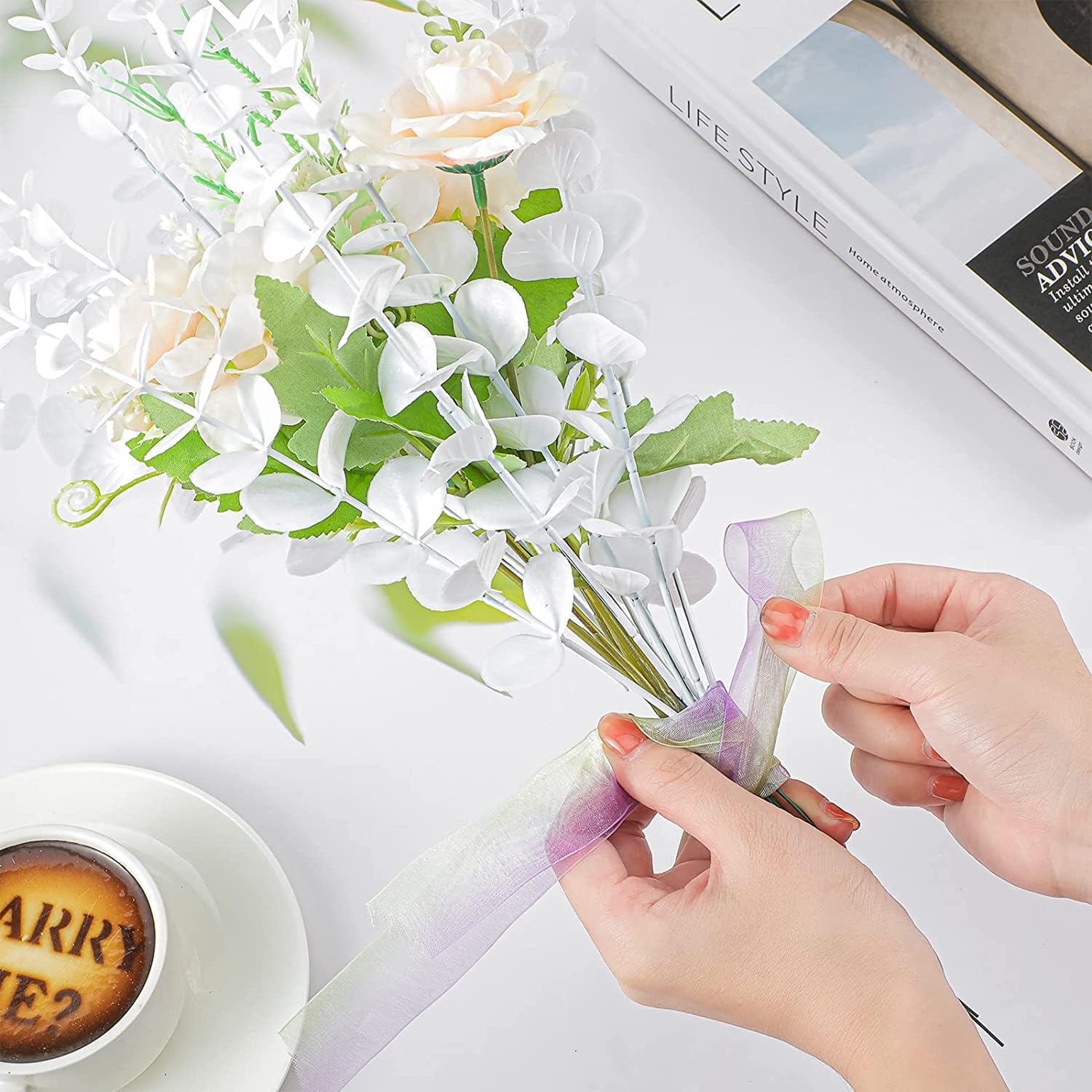 • Размери и материал: тези евкалиптови клонки са изработени от екологична пластмаса. Стъблата са високи около 38 см и имат гъвкава желязна тел вътре. Можете да превърнете евкалиптовите клонки във всяка желана форма или размер.