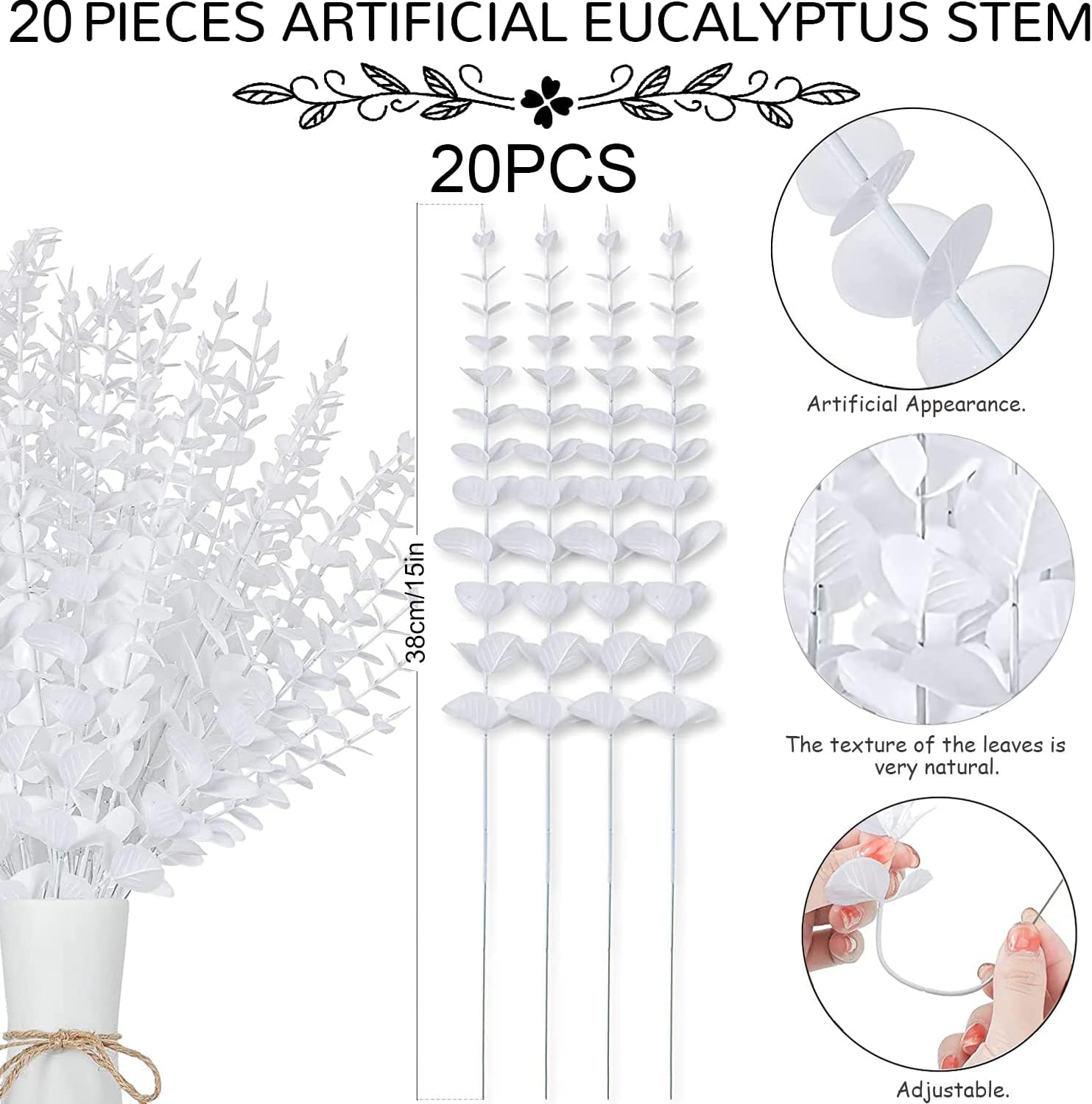 Декорация от изкуствени растения евкалипт, пакет от 20 изкуствени евкалиптови клонки, листа от евкалиптови растения за сватбени тържества, партита, дома, декорация на маса, цветна аранжировка (20, бели)