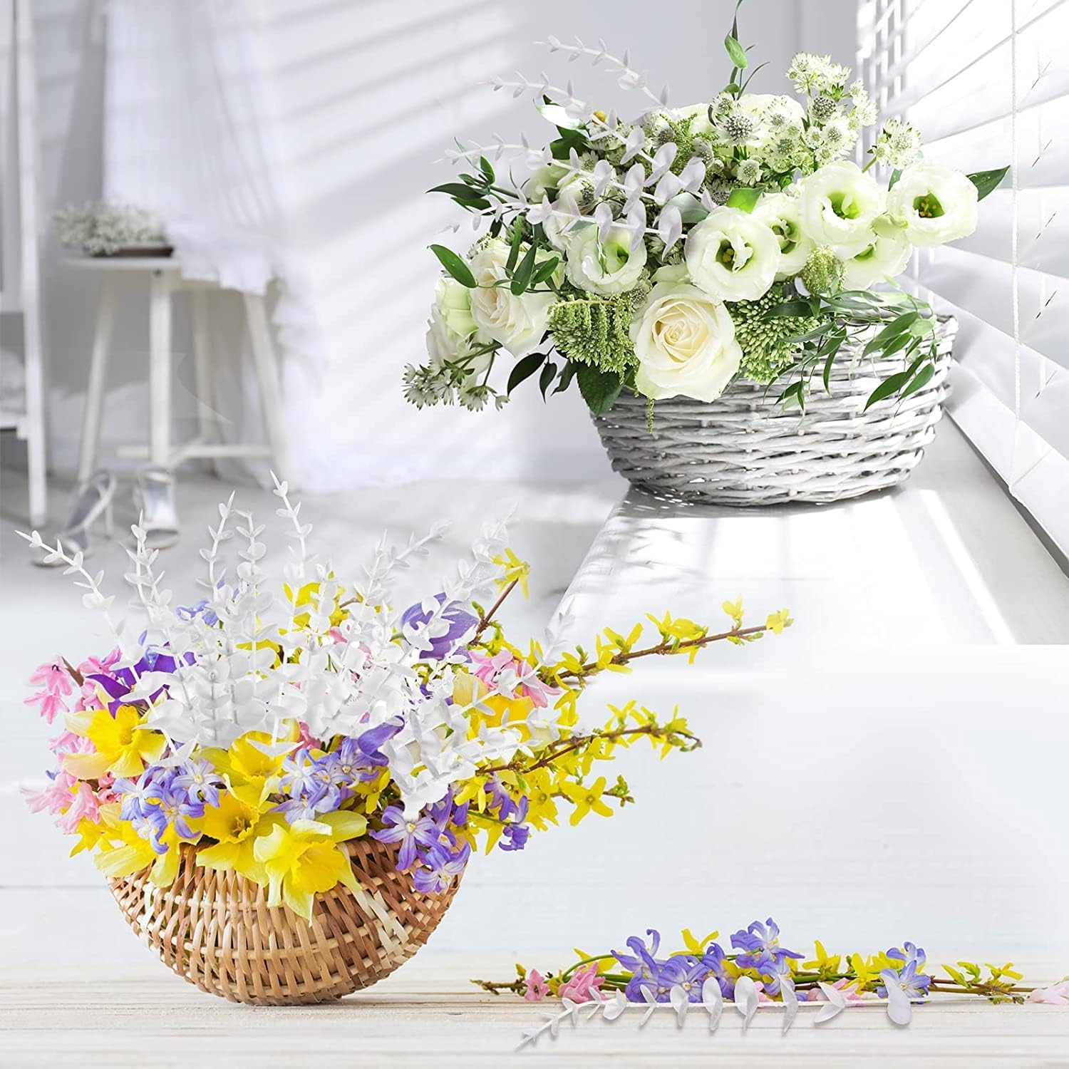 • Реалистичен изкуствен евкалипт: лист от евкалипт има прозрачна текстура и винтидж цвят. Белият прах, който покрива повърхността на листата на евкалипта, не е прах, а бяло зреещо покритие, внимателно проектирано да симулира истински растения. Симулираните евкалиптови лози са безопасни за хора и домашни любимци.