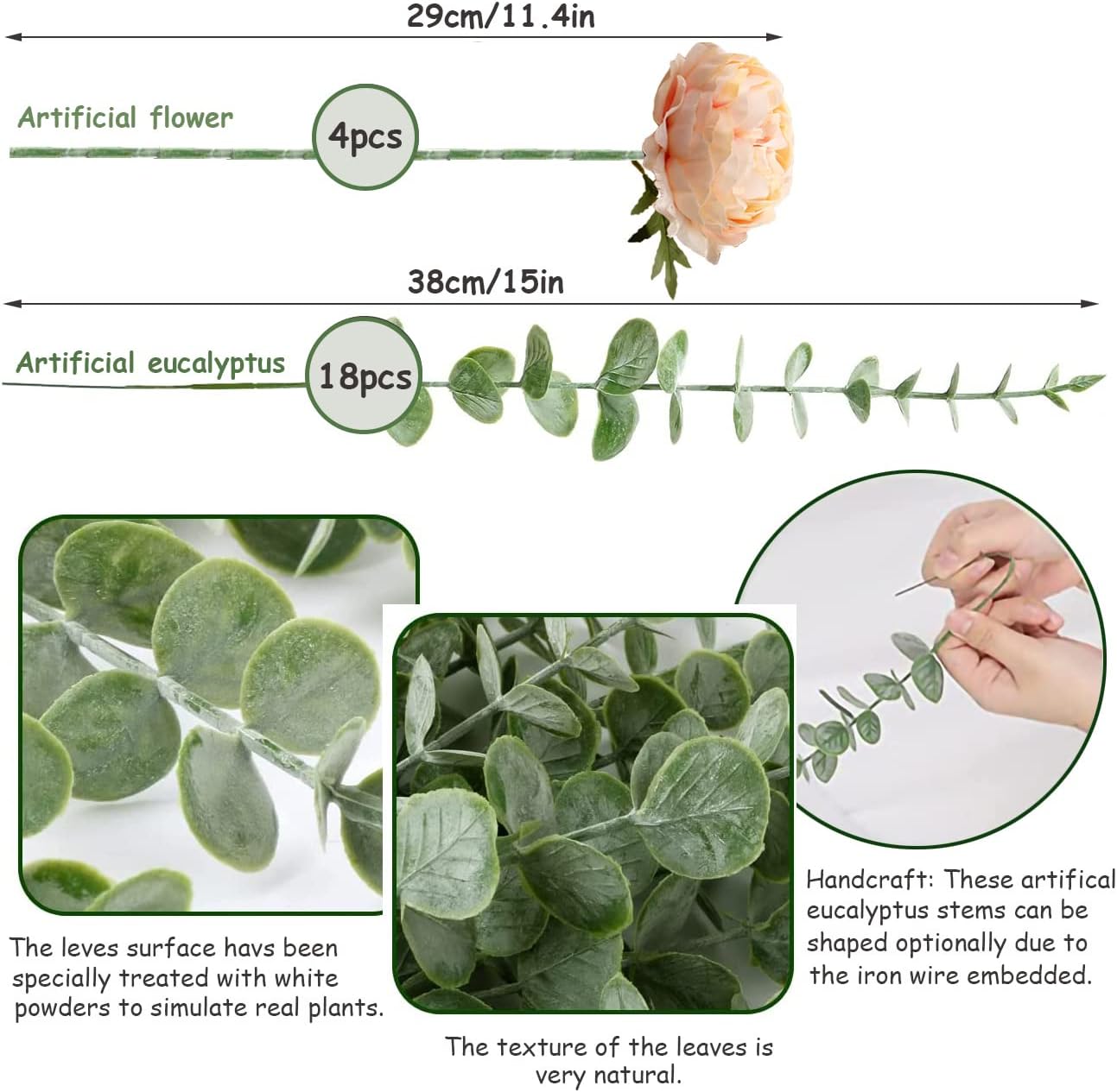 Декорация от изкуствени растения от евкалипт, изкуствени евкалиптови клонки и 4 броя изкуствени цветя за сватбени тържества, парти, декорация на маса за дома, цветна аранжировка