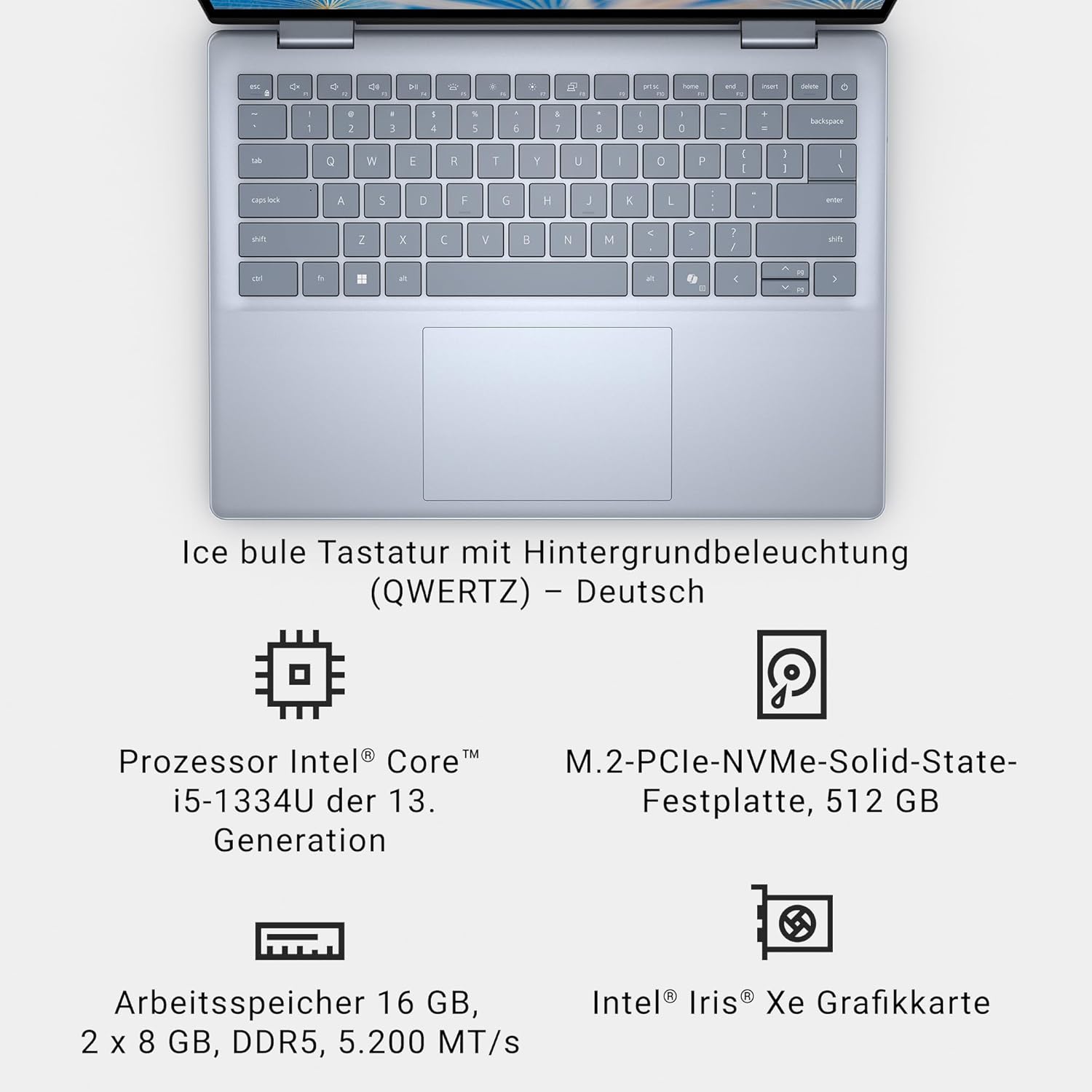 Dell Inspiron 14 7440 2-в-1 лаптоп 14-инчов 16:10 FHD+ сензорен екран, Intel Core i5-1334U, 16 RAM, 512 SSD, Intel Iris Xe, Windows 11 Home, четец на пръстови отпечатъци, подсветка (QWERTZ), немски