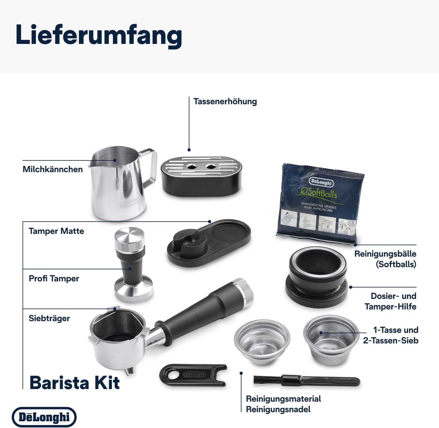 • Пълен комплект за бариста: включени трамбовка от неръждаема стомана, подложка за трамбоване, дозиращо устройство и кана за мляко