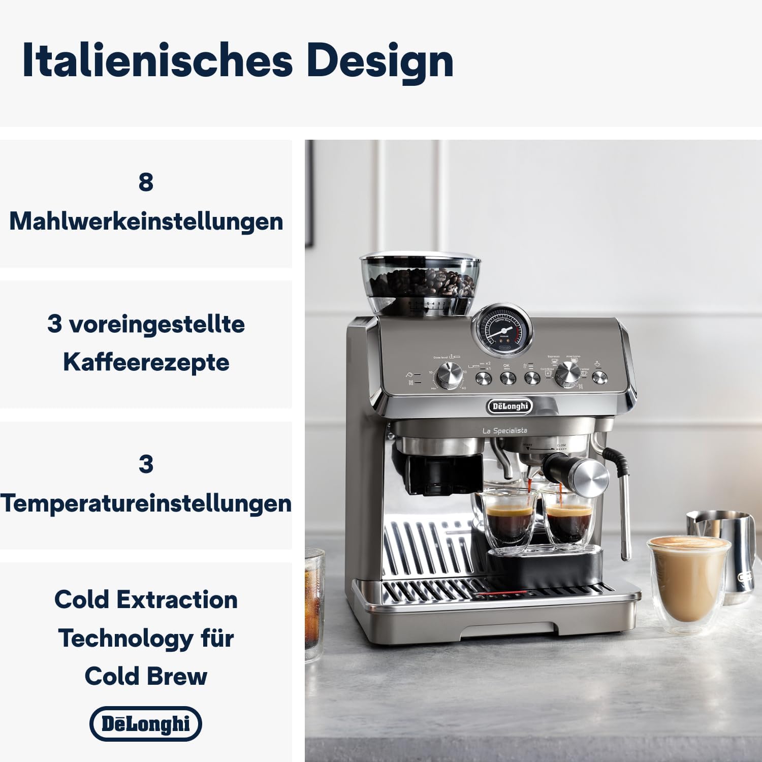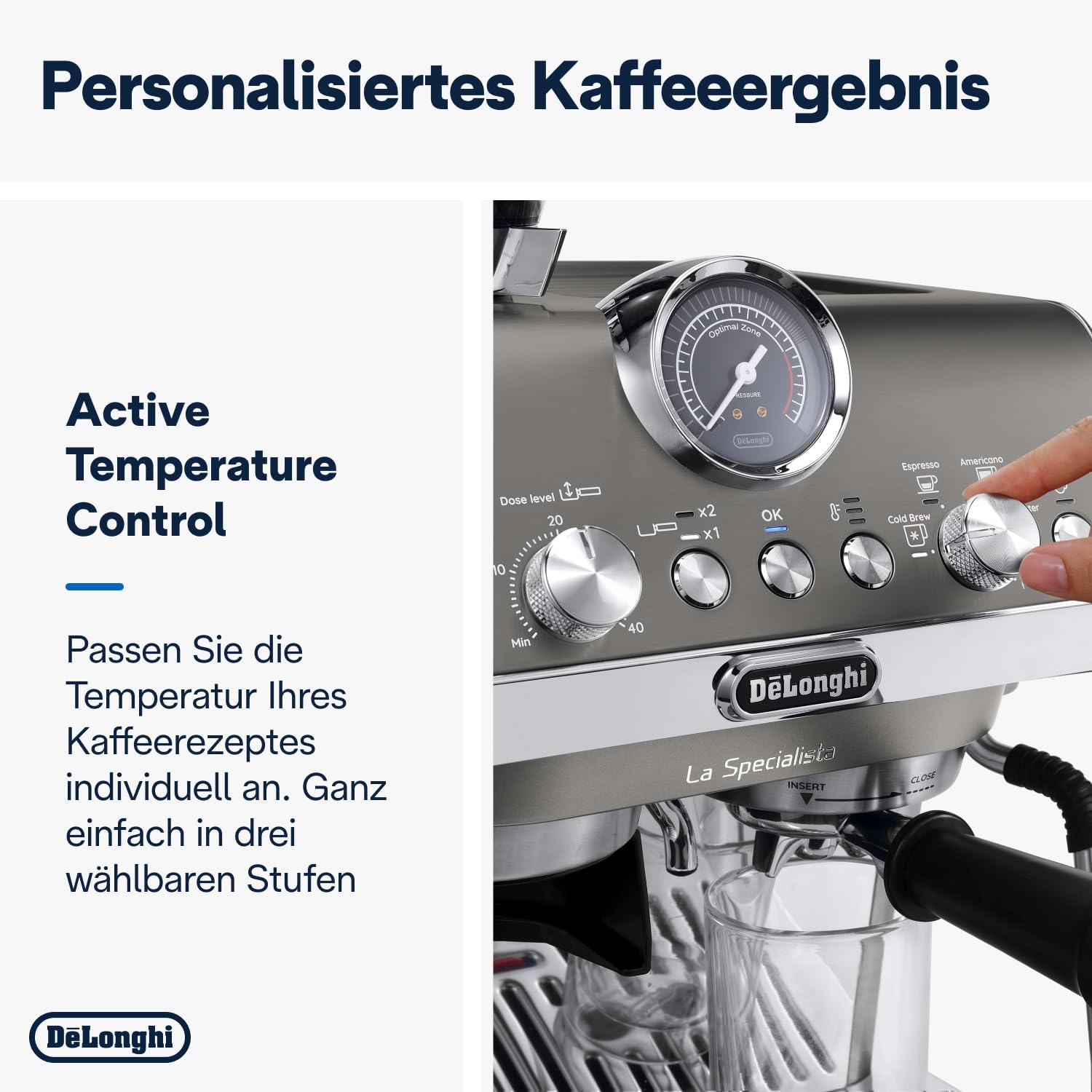 De'Longhi La Specialista Arte Evo Cold Brew EC9255T Еспресо машина с мелачка, включително комплект бариста, функция за студено приготвяне, 8 нива на смилане, 15 бара, 3 температури, дюза за млечна пяна, титаниева