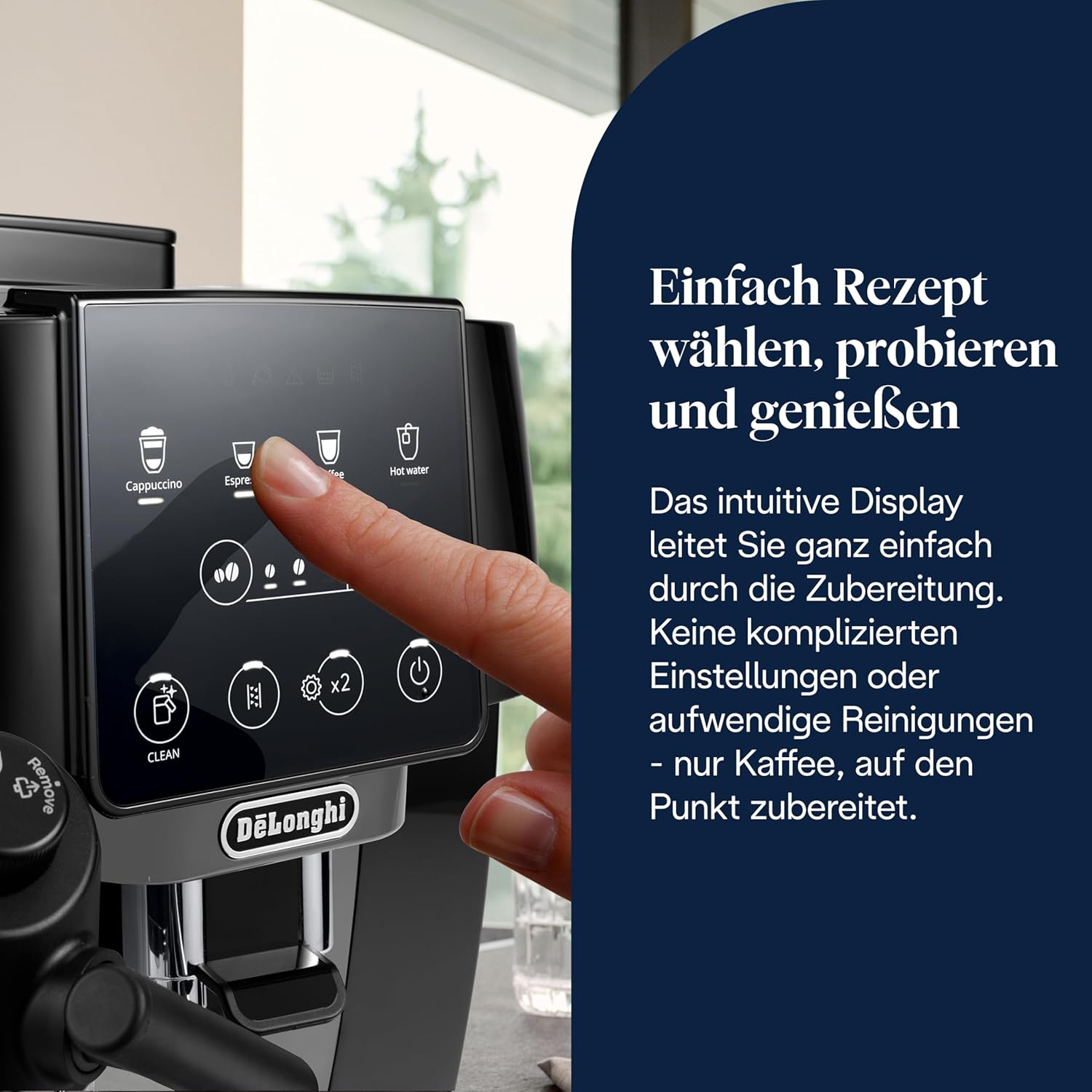 • Контролен панел с мек сензорен панел: Интуитивно и функционално управление благодарение на 5-те цветни бутона за директно набиране за любимите ви напитки. Лесно избирайте между лате макиато, капучино, еспресо, кафе или гореща вода за чай.