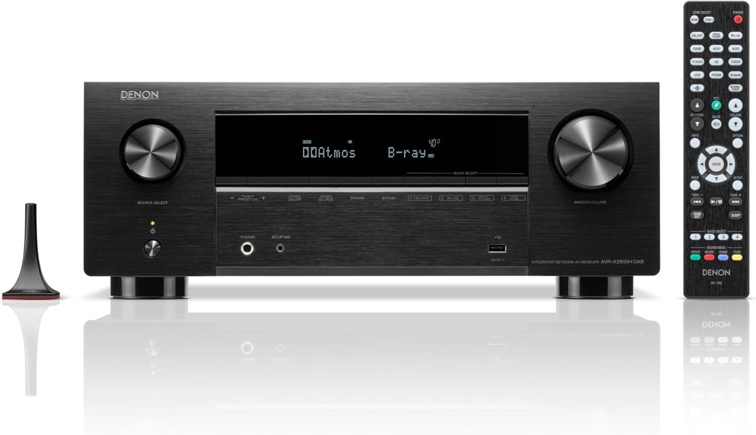 Denon AVR-X2800HDAB 7.2 канален AV ресивър, HiFi усилвател с Dolby Atmos, DTS:X, 6 HDMI входа и 2 изхода, 8K HDMI, Bluetooth, DAB, WiFi, AirPlay 2, HEOS Multiroom, съвместим с Alexa, черен