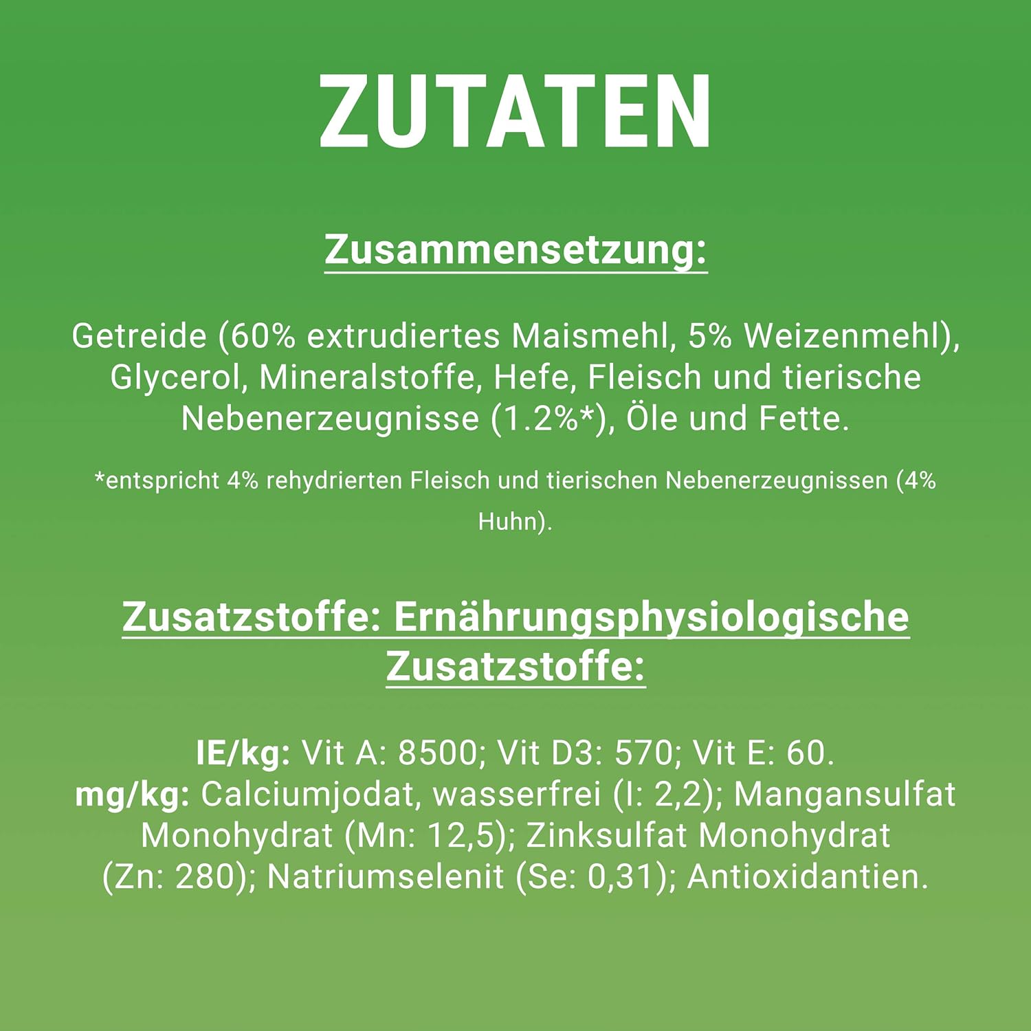 Зърнени храни (60% екструдирано царевично брашно, 5% пшенично брашно), глицерол, минерали, мая, месо и животински субпродукти (1,2%*), масла и мазнини. *еквивалентно на 4% рехидратирано месо и животински субпродукти (4% пилешко).