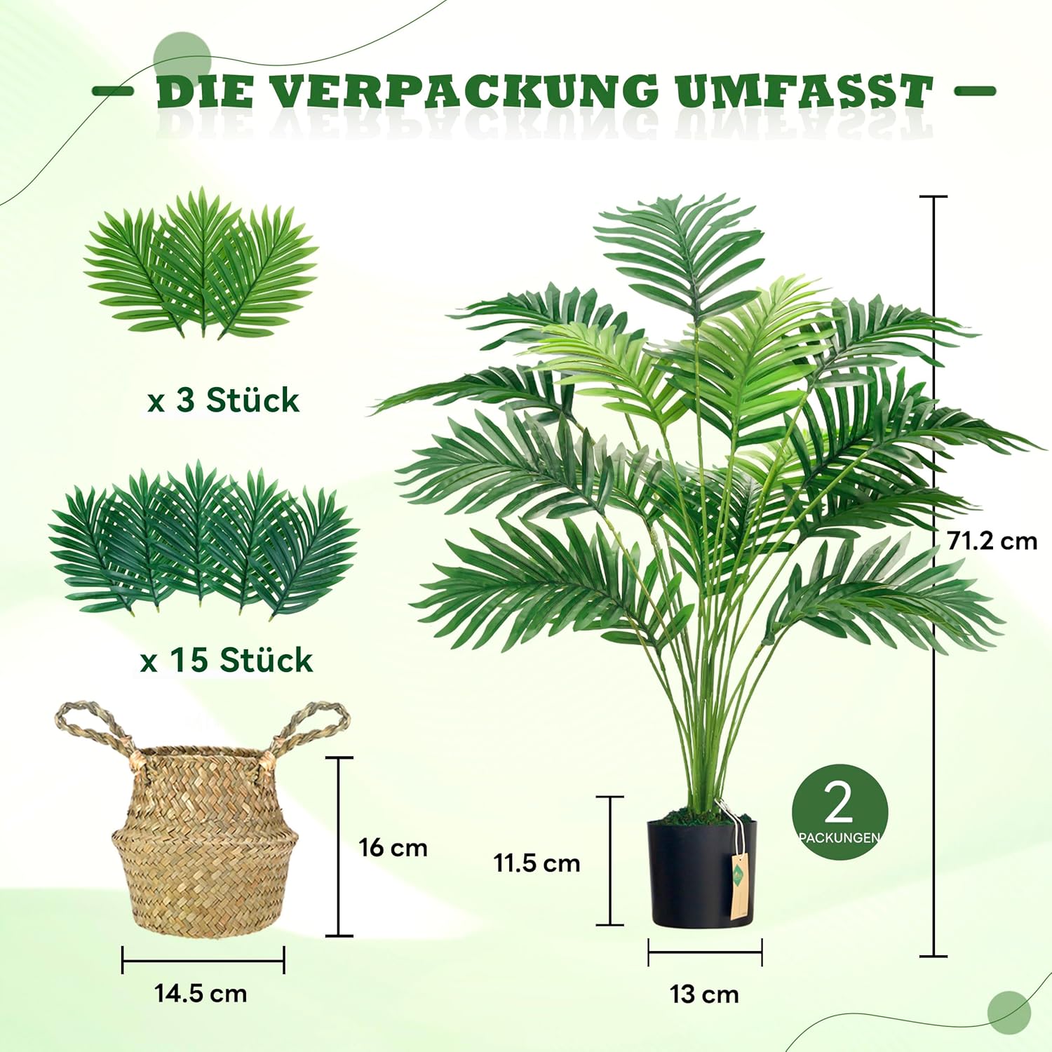 • ПАКЕТЪТ ВКЛЮЧВА 1 x 18 листа изкуствен мъх плюс ръчно изработена кошница с дръжки - височината на кошницата е 16 см, ширината на кошницата е 15 см. Сглобено ще получите изкуствено растение с височина 71,1 см, голямо за декоративна всекидневна.