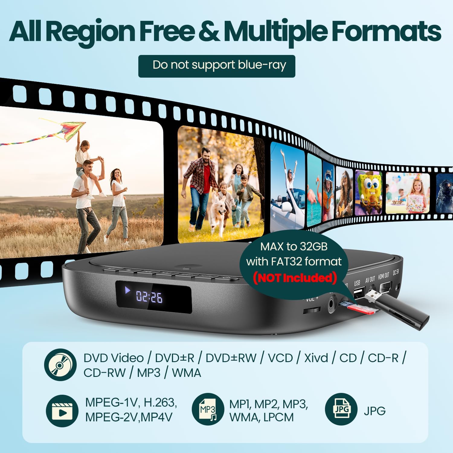 Този DVD плейър е съвместим с различни дискови формати (DVD/SVCD/CD/MP3/Kodak Picture/Photo CD/DivX), така че можете лесно да гледате филми от всички страни.