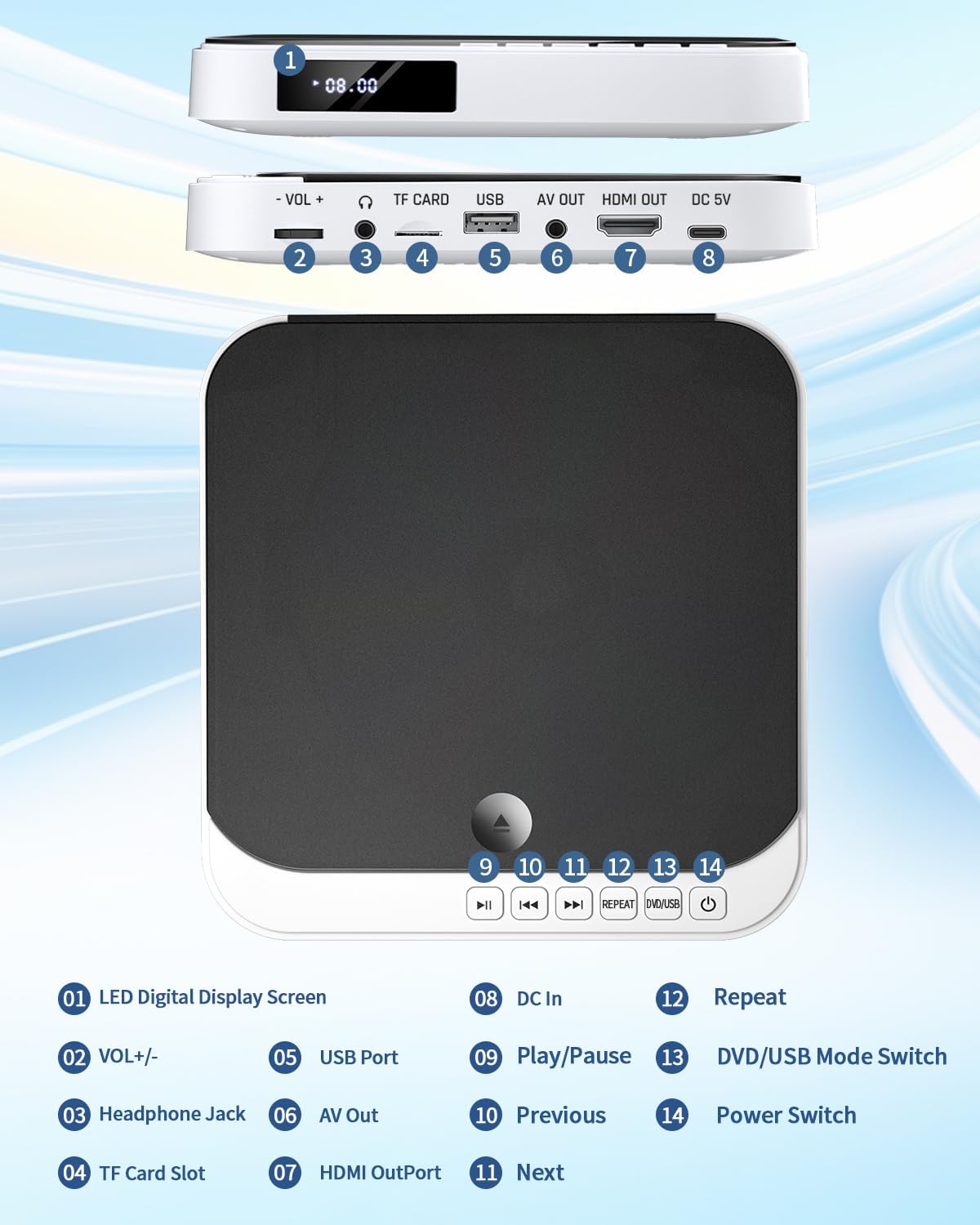 USB/TF вход за карта: DVD плейърите DESOBRY не само възпроизвеждат дискове, но и поддържат широко използвани файлови формати.