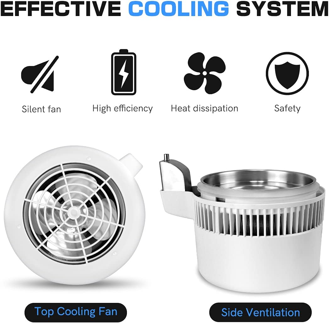 Всички части, които влизат в контакт с течност, са изработени от неръждаема стомана 304, включително вътрешния резервоар, вътрешната капачка, кондензаторната змия, изхода за вода и входа за вода. С пластмасов контейнер без BPA и алуминиев вентилатор.