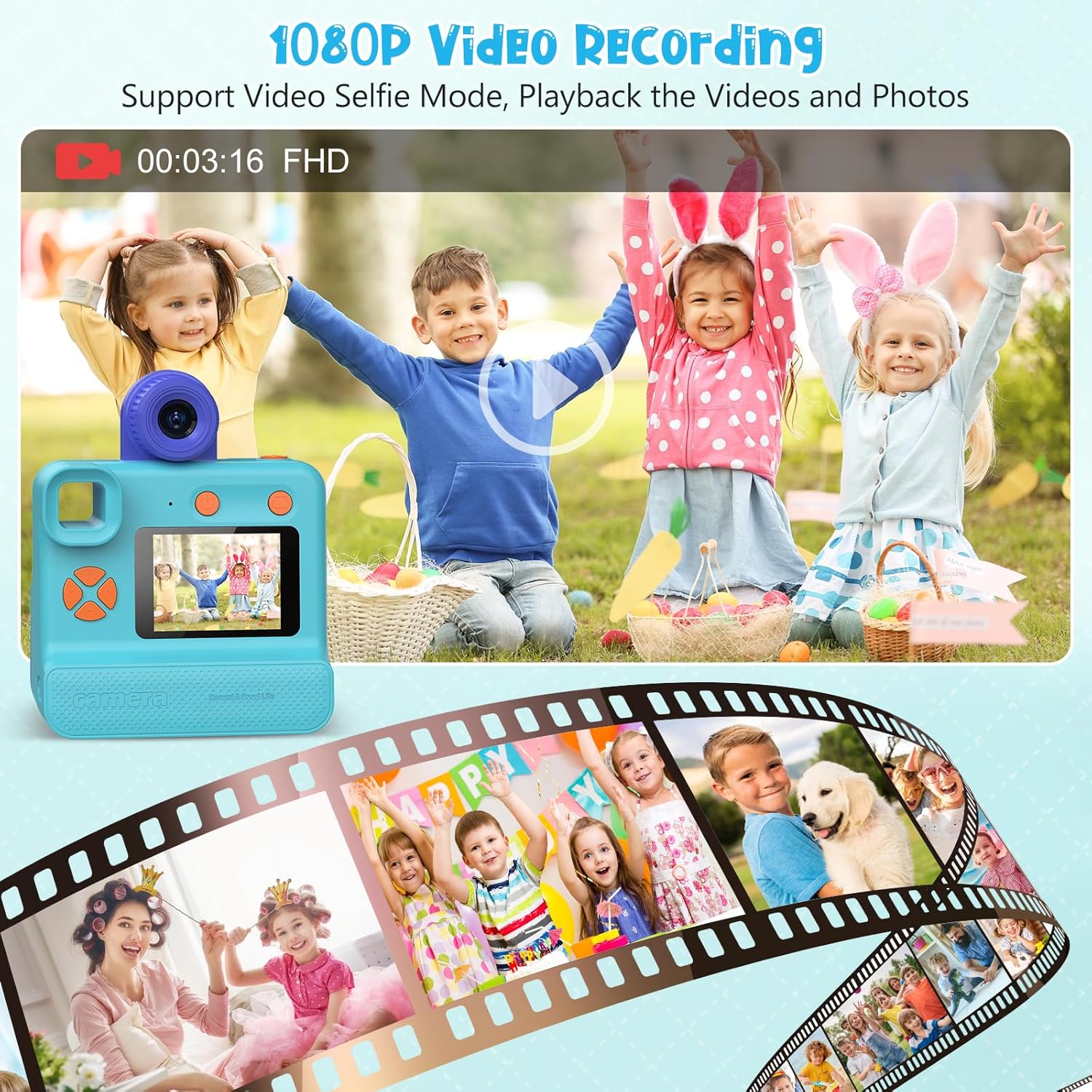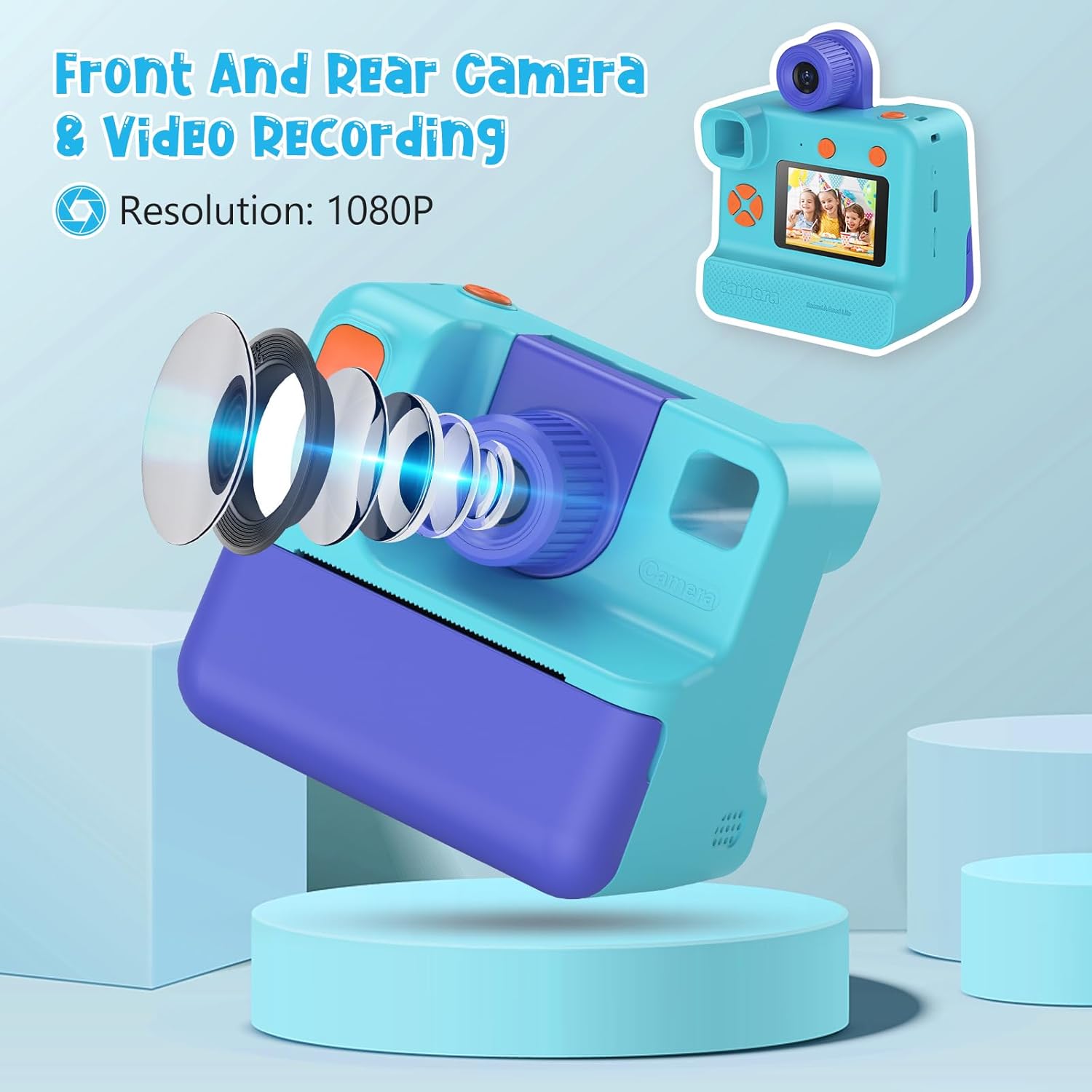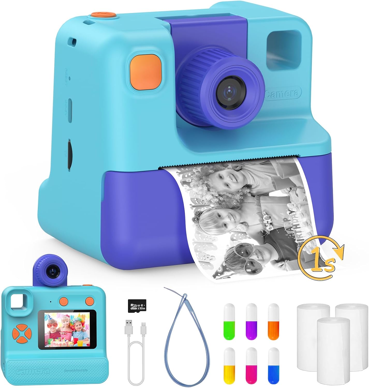 • Предна и задна камера и 1080P HD видео: този детски цифров фотоапарат с обръщаем обектив на 180°. Детският фотоапарат поддържа 5x цифрово увеличение, автофокус и timelapse. Този фотоапарат за моментални снимки за деца се предлага с хартия за печат, върху която могат да се отпечатат 180 изображения. Той ефективно насърчава интереса на децата ви към фотографията.