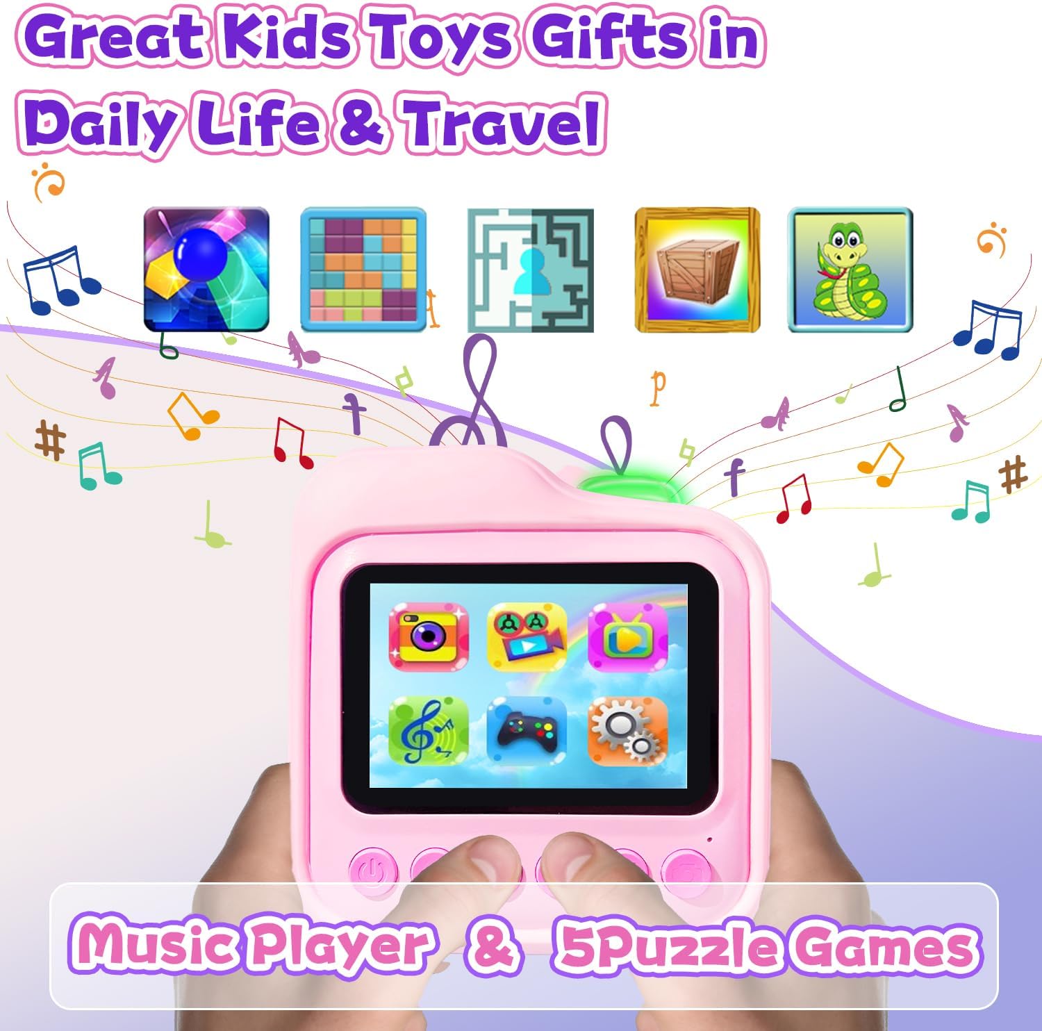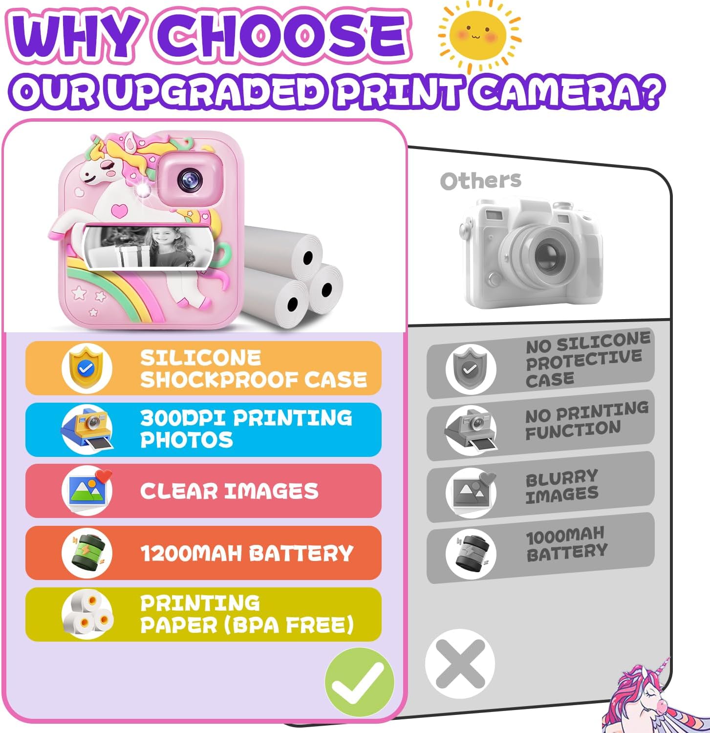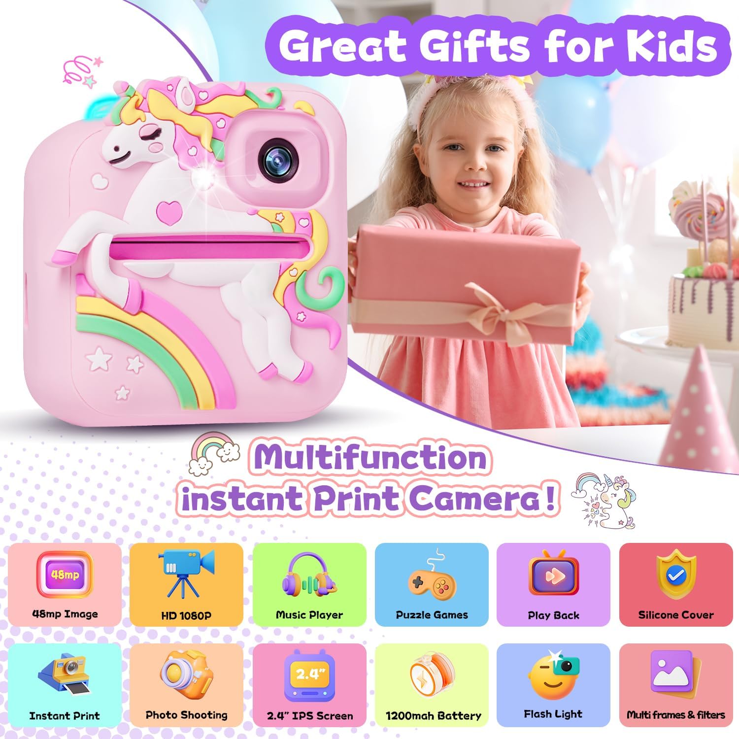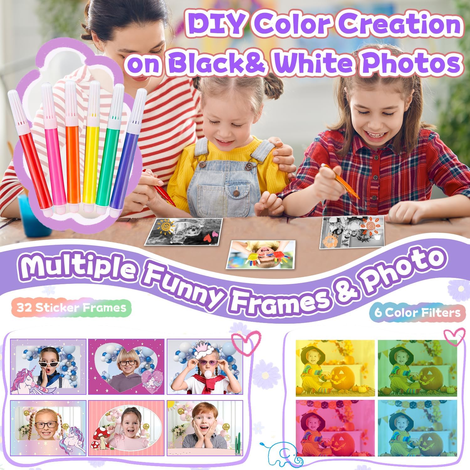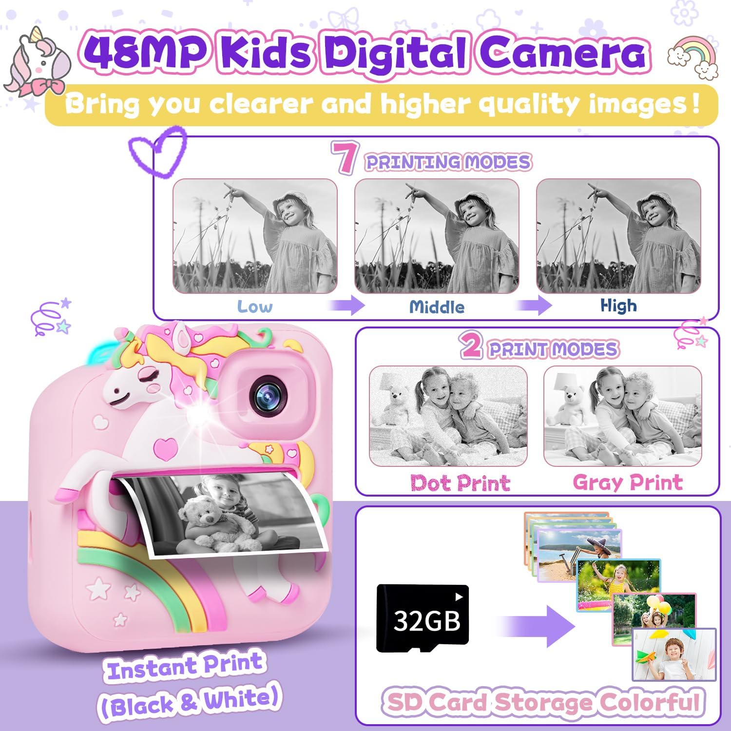 • Многофункционален детски цифров фотоапарат: Този детски фотоапарат е не само фотоапарат за моментални снимки, но и цифров фотоапарат. Осигурява 2,4-инчов голям екран, поддържа 1080P HD видеозапис и 8MP обектив, което позволява на децата да правят ясни видеоклипове и снимки. Повече функции, които интересуват децата, като MP3 плейъри, timelapse фотография, възпроизвеждане, игри и др. Мощният детски фотоапарат не е просто играчка, а помага на децата да заснемат красиви и смислени моменти.