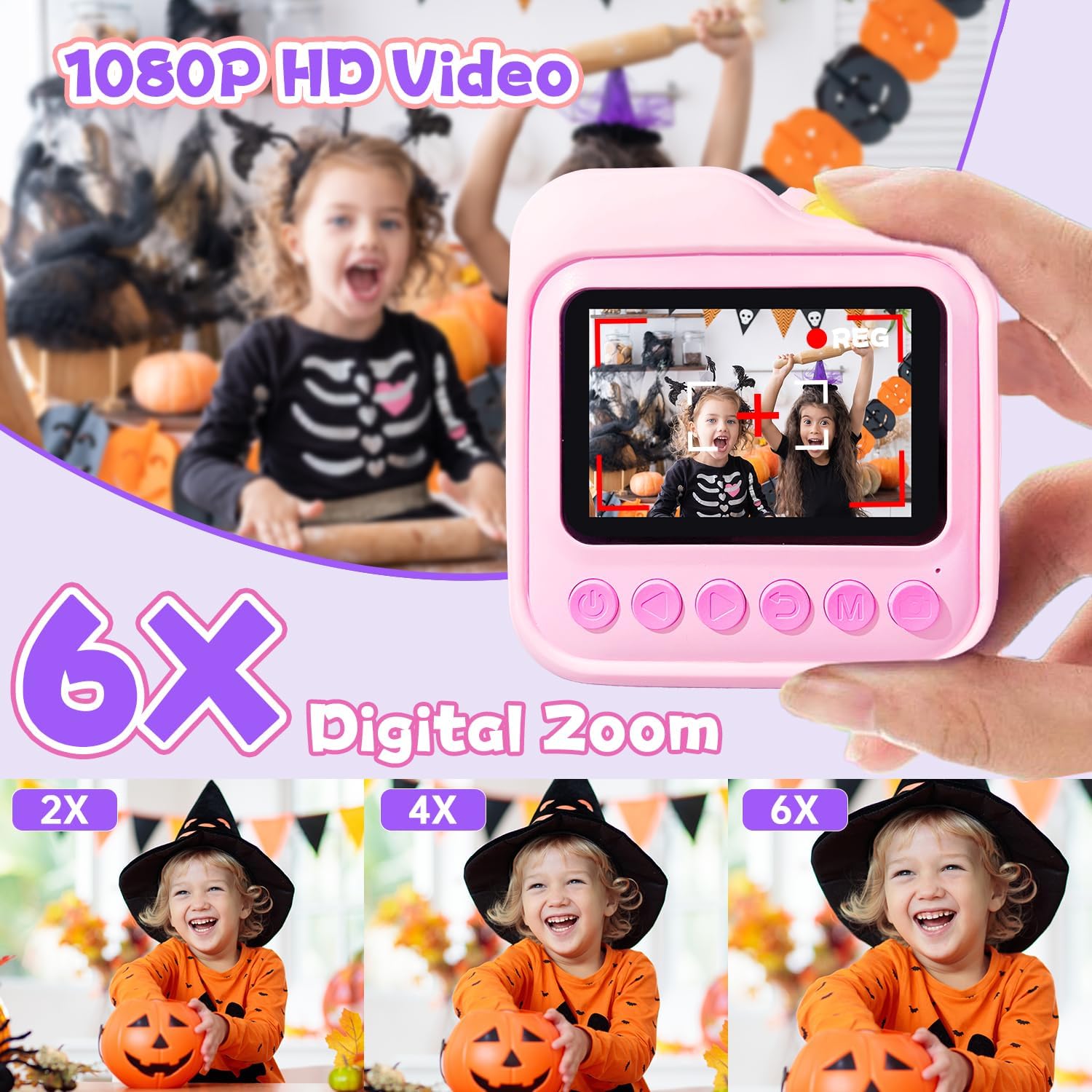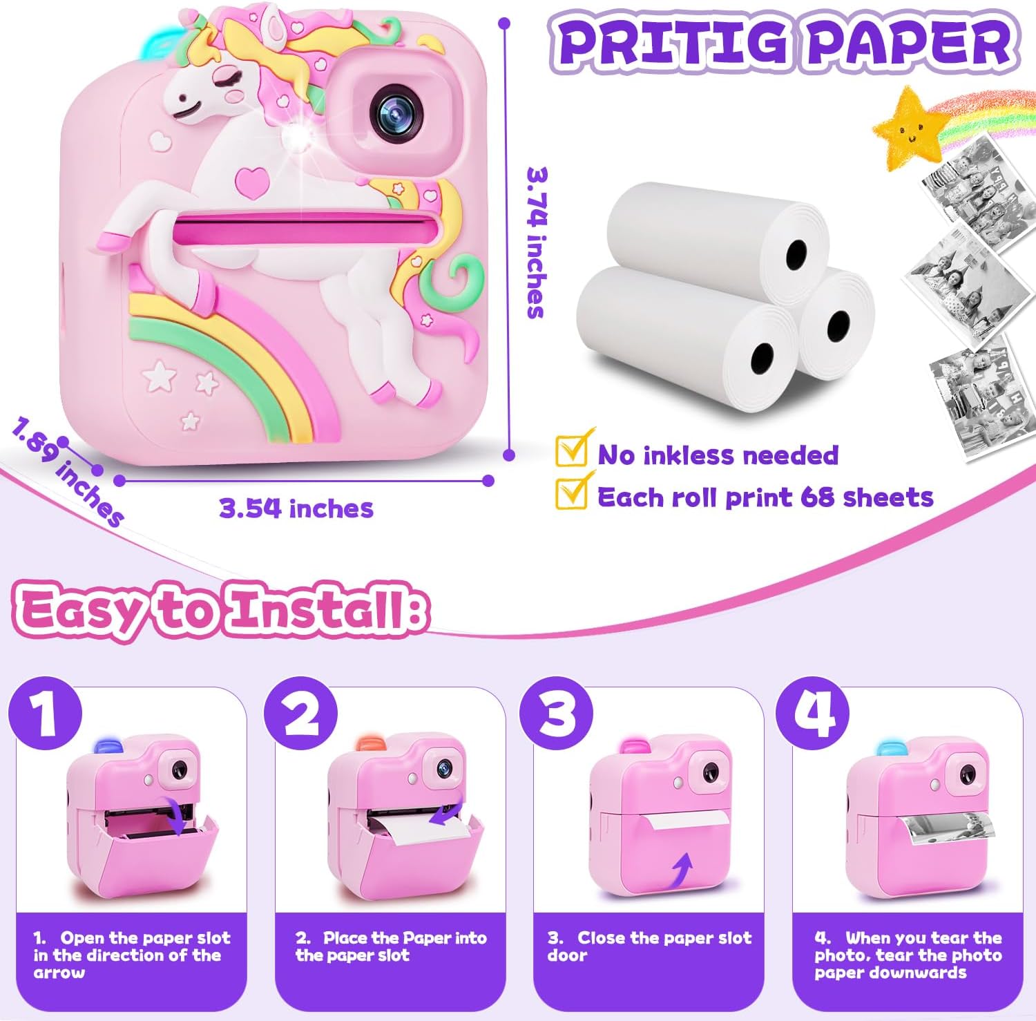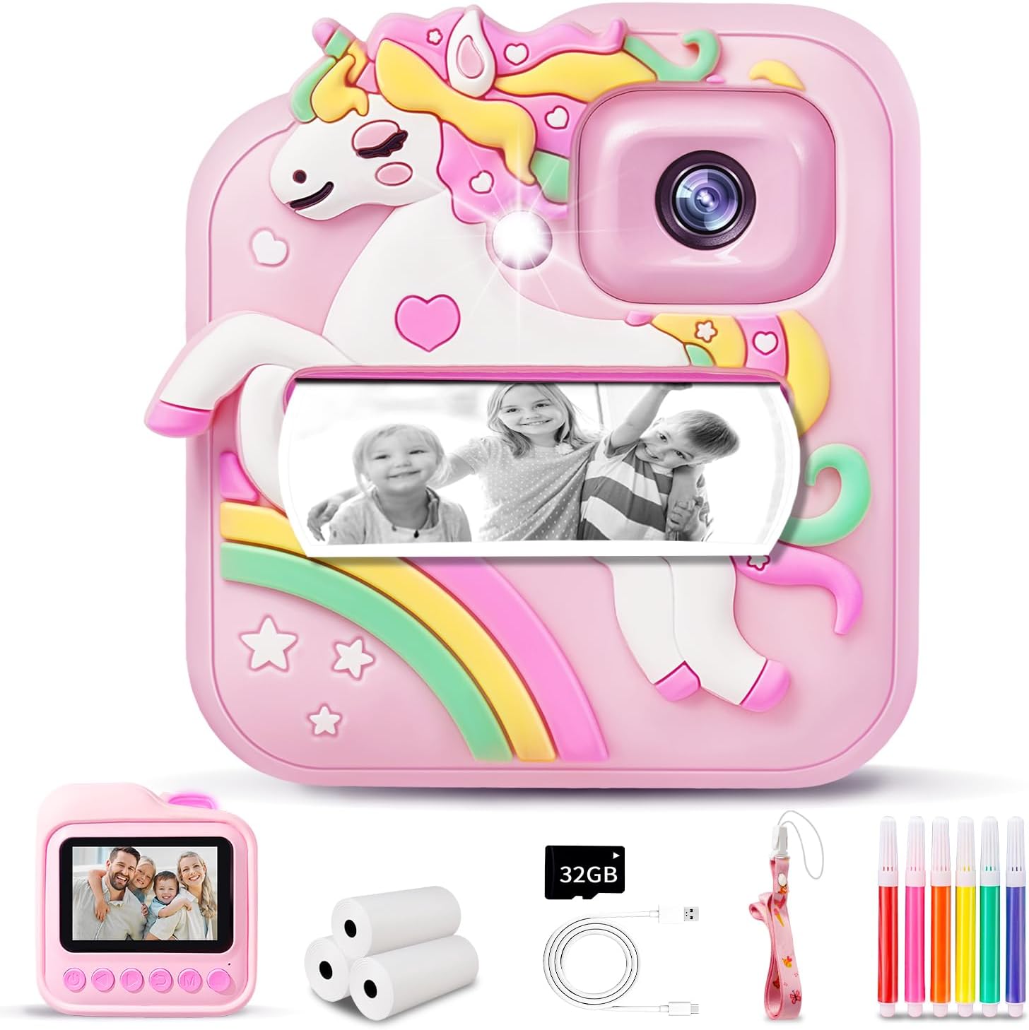 • ИДЕАЛЕН ПОДАРЪК ЗА МОМИЧЕТА И МОМЧЕТА С този фотоапарат за моментално печатане за деца, насърчавайте креативността на децата, дръжте ги далеч от смартфоните и им позволявайте да правят снимки/селфита/видеоклипове по всяко време и навсякъде, като им позволявате да създават скъпи спомени със собствения си фотоапарат. Лекият и преносим дизайн е идеален за къмпинг, партита и пътуване. Като перфектна идея за подарък за рожден ден, Коледа, Нова година, Деня на благодарността за деца на възраст 3-12 години.
