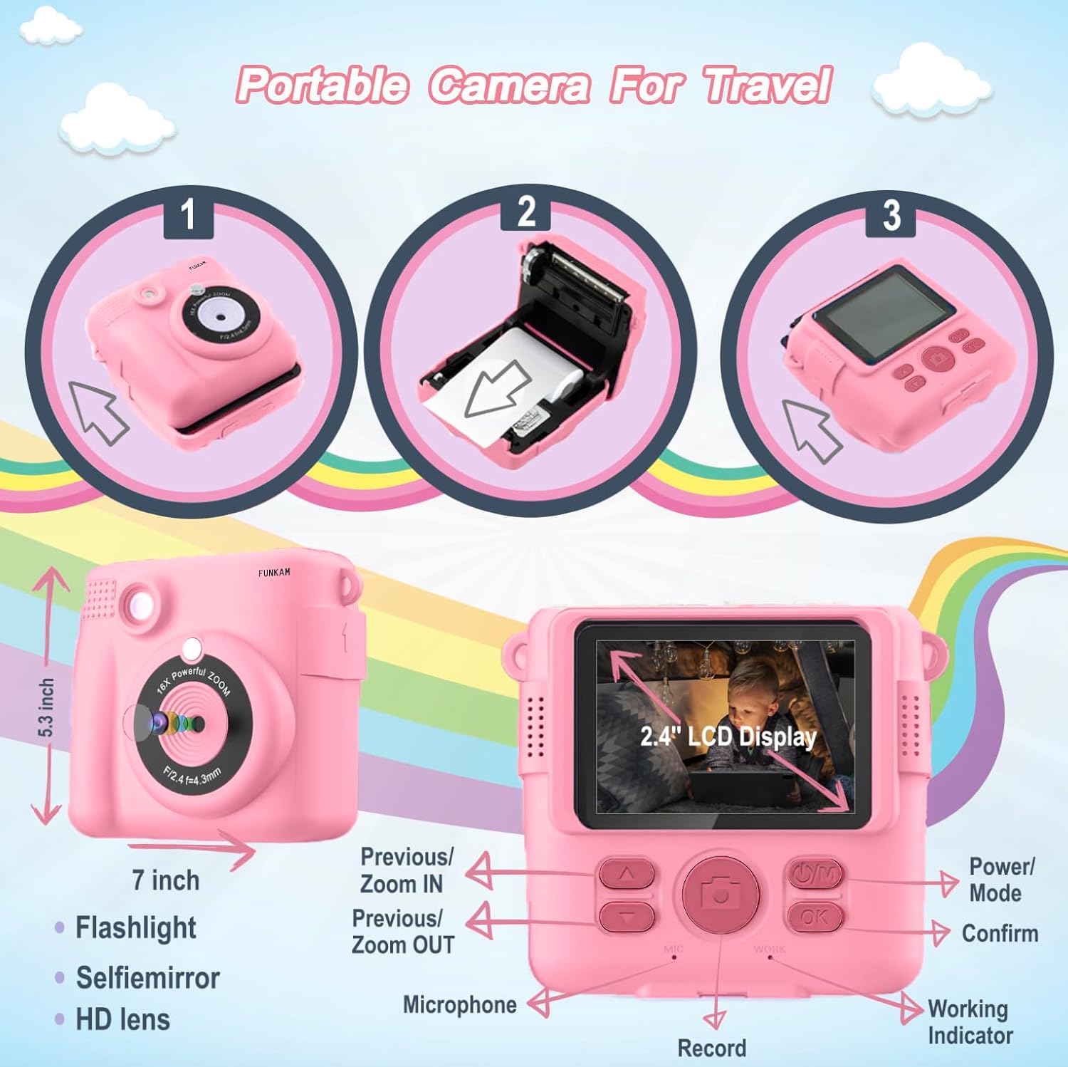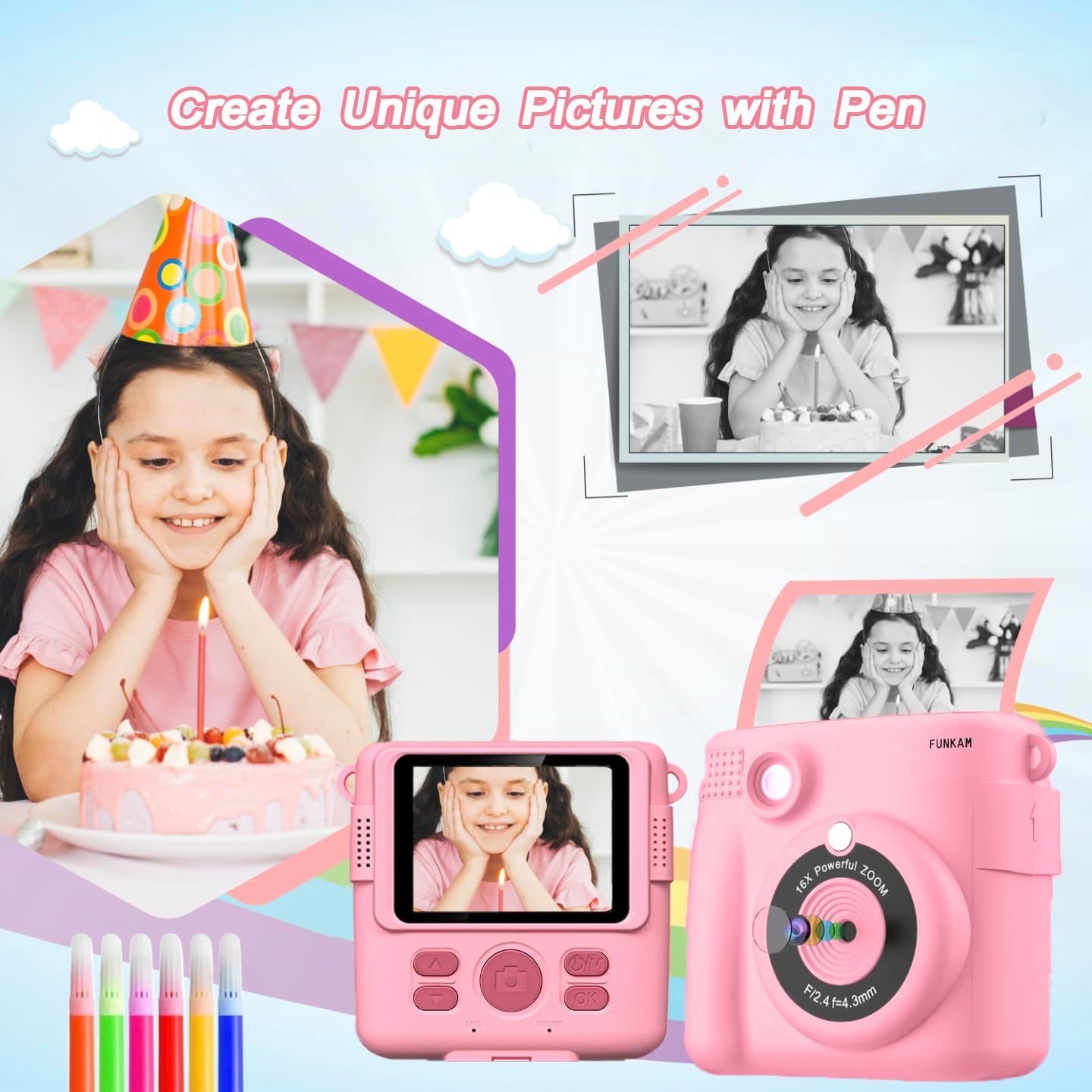 Детска камера Funkam: Камера за моментални снимки с 1080P, 2.4-инчов екран, хартия за печат и 32GB TF карта, цифрова камера с цветни химикалки - подарък за деца 3-12 години (розов)