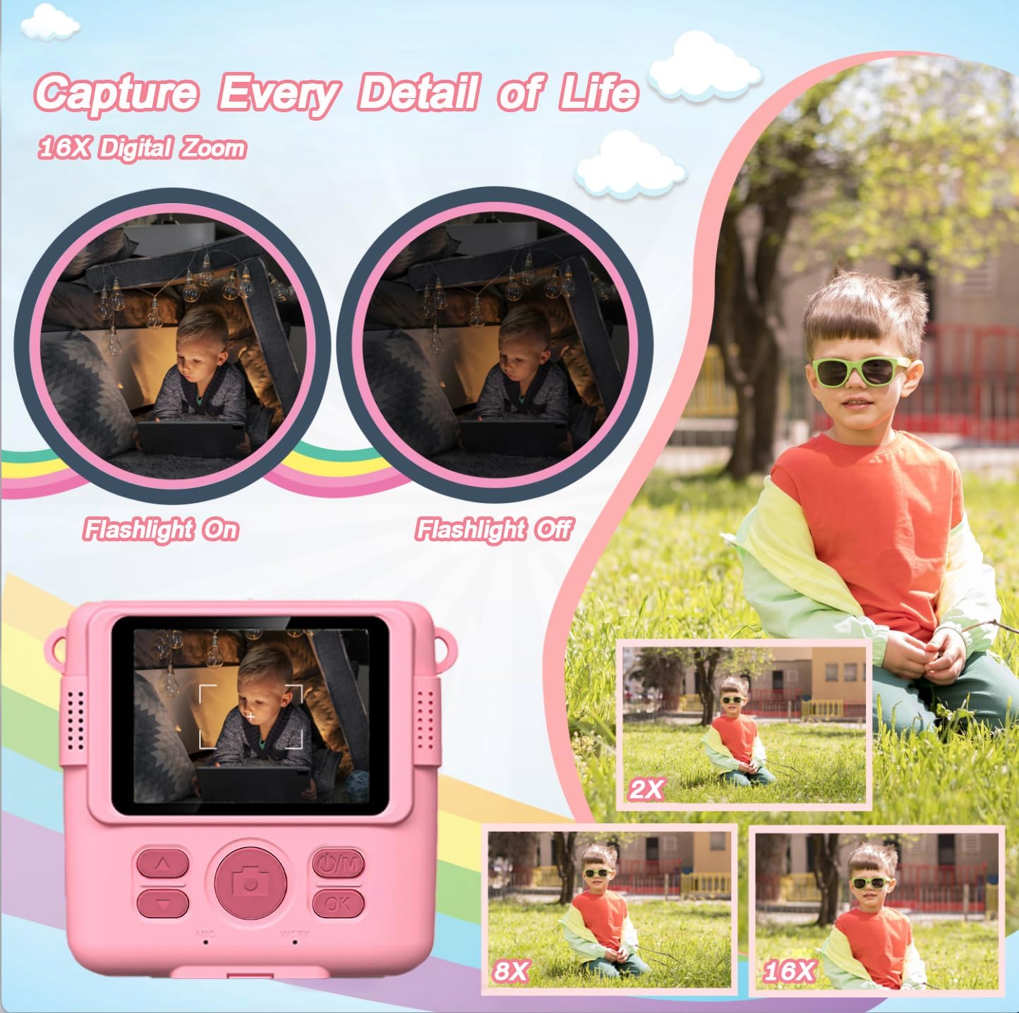 • Многофункционален цифров фотоапарат за деца: този мини фотоапарат с незабавен печат, 2,4-инчов голям екран, 1080P видео, 16x цифрово увеличение, светкавица, timelapse, непрекъснато снимане, игри, филтърна рамка, MP3. Той може да отговори на различните нужди на децата. Той е добър избор да придружите децата и да ги накарате да растат щастливо. Донесете прекрасни моменти за вас и вашето семейство.