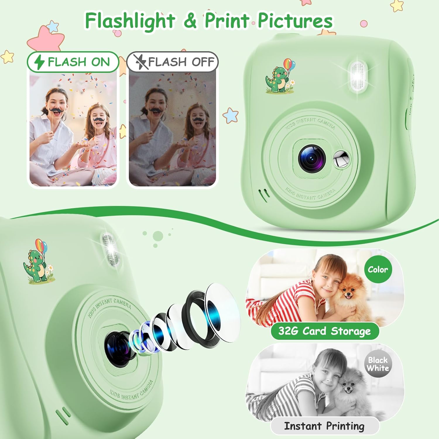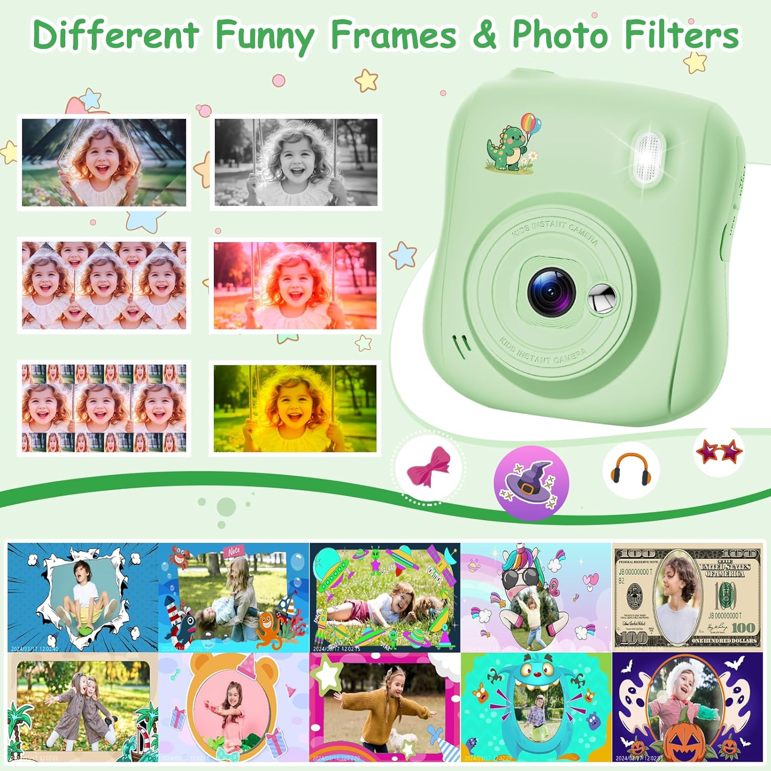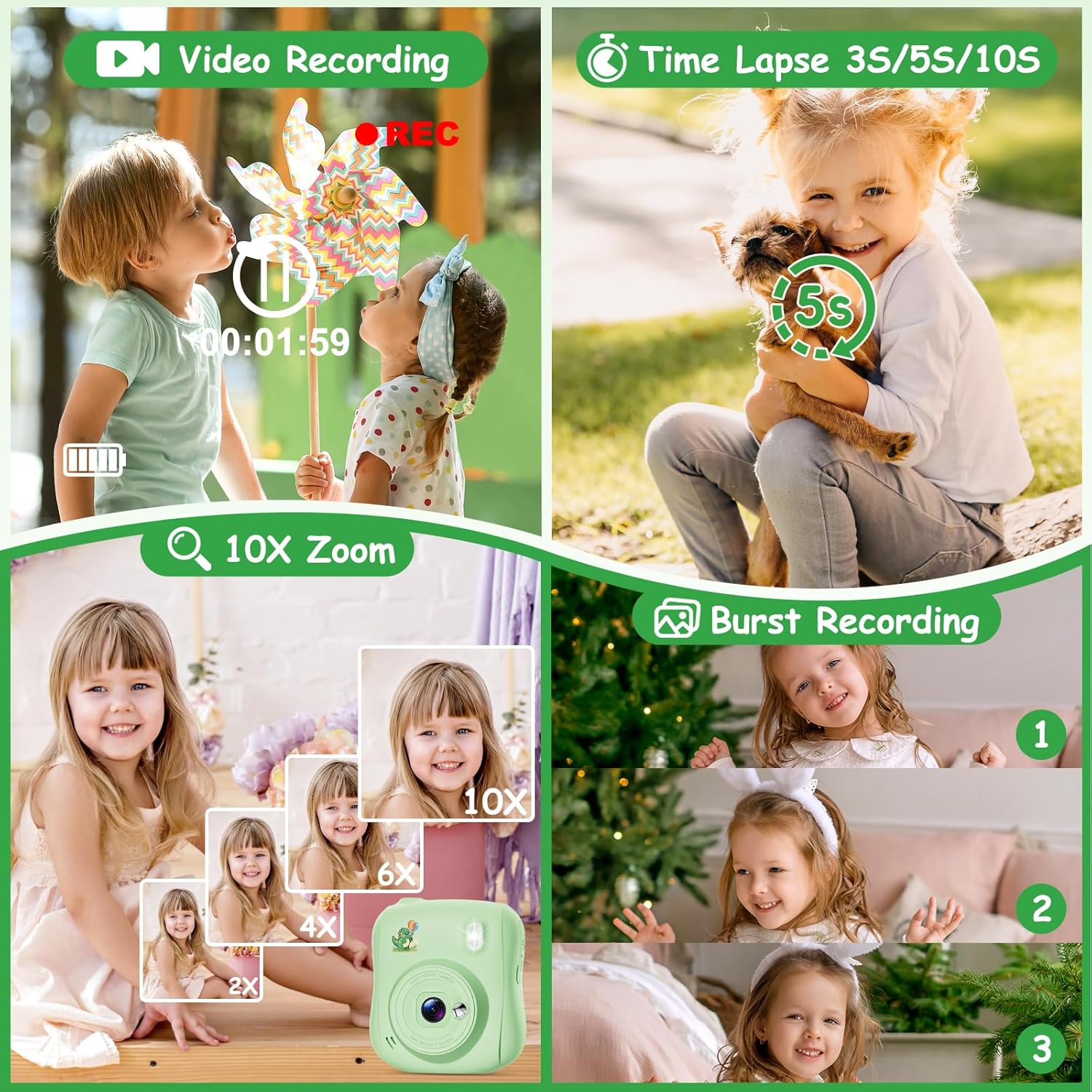 • Многофункционален детски фотоапарат за моментални снимки: Този детски фотоапарат предлага моментално отпечатване, 2.0-инчов екран, 1080P видео, 10x цифрово увеличение, осветяване на екрана, timelapse, непрекъснато снимане, забавни стикери, MP3 функция и още - той има всичко! С предварително инсталирана 32GB карта могат да се съхраняват хиляди снимки и видеоклипове. Той носи на децата повече вдъхновение и забавление при снимане и помага да запечатат детството си.