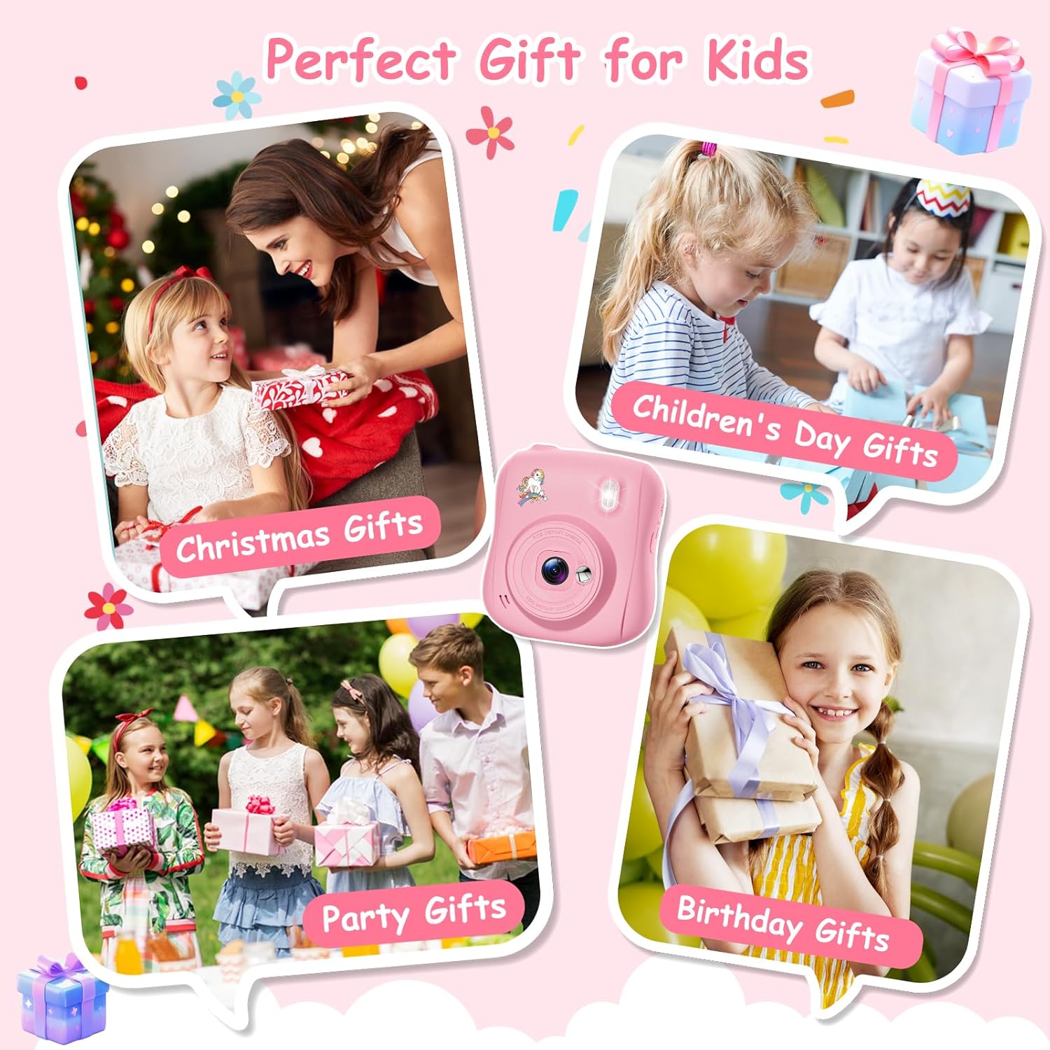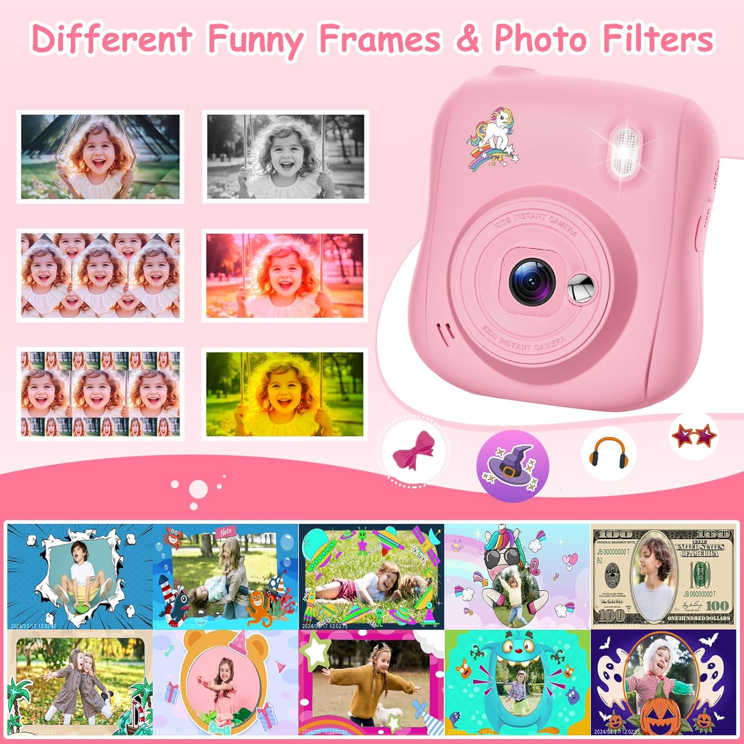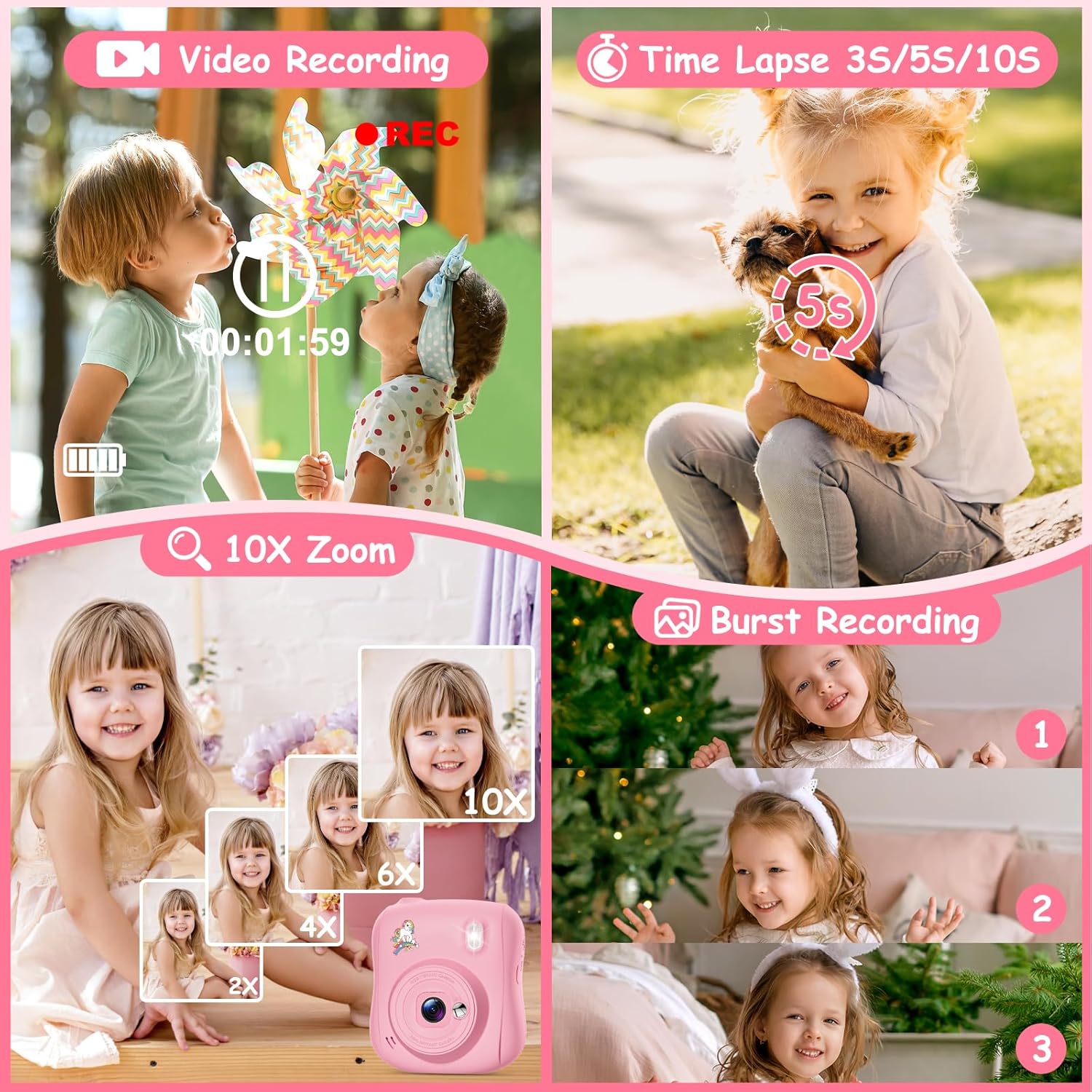 • Многофункционален детски фотоапарат за моментални снимки: Този детски фотоапарат предлага моментално отпечатване, 2.0-инчов екран, 1080P видео, 10x цифрово увеличение, осветяване на екрана, timelapse, непрекъснато снимане, забавни стикери, MP3 функция и още - той има всичко! С предварително инсталирана 32GB карта могат да се съхраняват хиляди снимки и видеоклипове. Той носи на децата повече вдъхновение и забавление при снимане и помага да запечатат детството си.