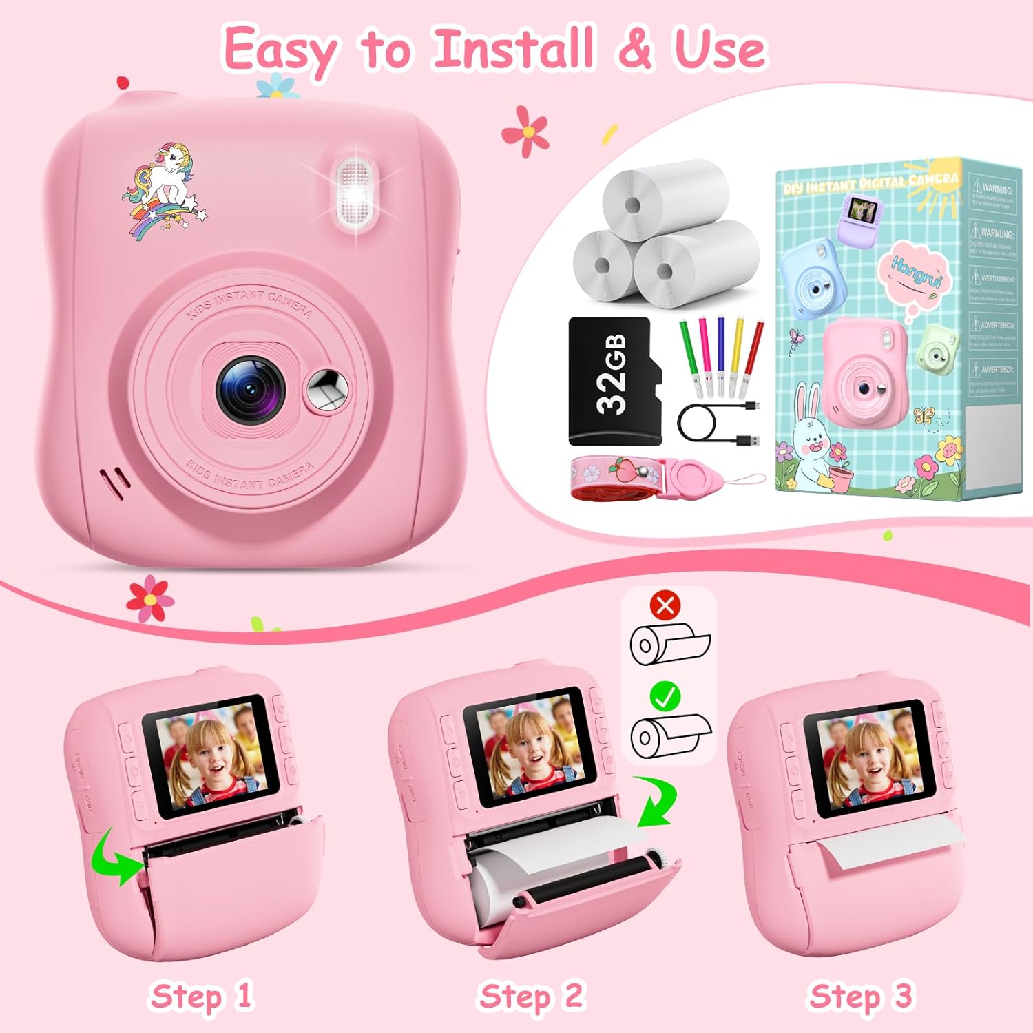 Детска камера Hangrui, 14MP камера за моментално снимане, 32G карта и хартия за печат, 1080P камера, детска камера за моментално снимане с цветни химикалки, подарък за момчета и момичета от 3 до 12 години