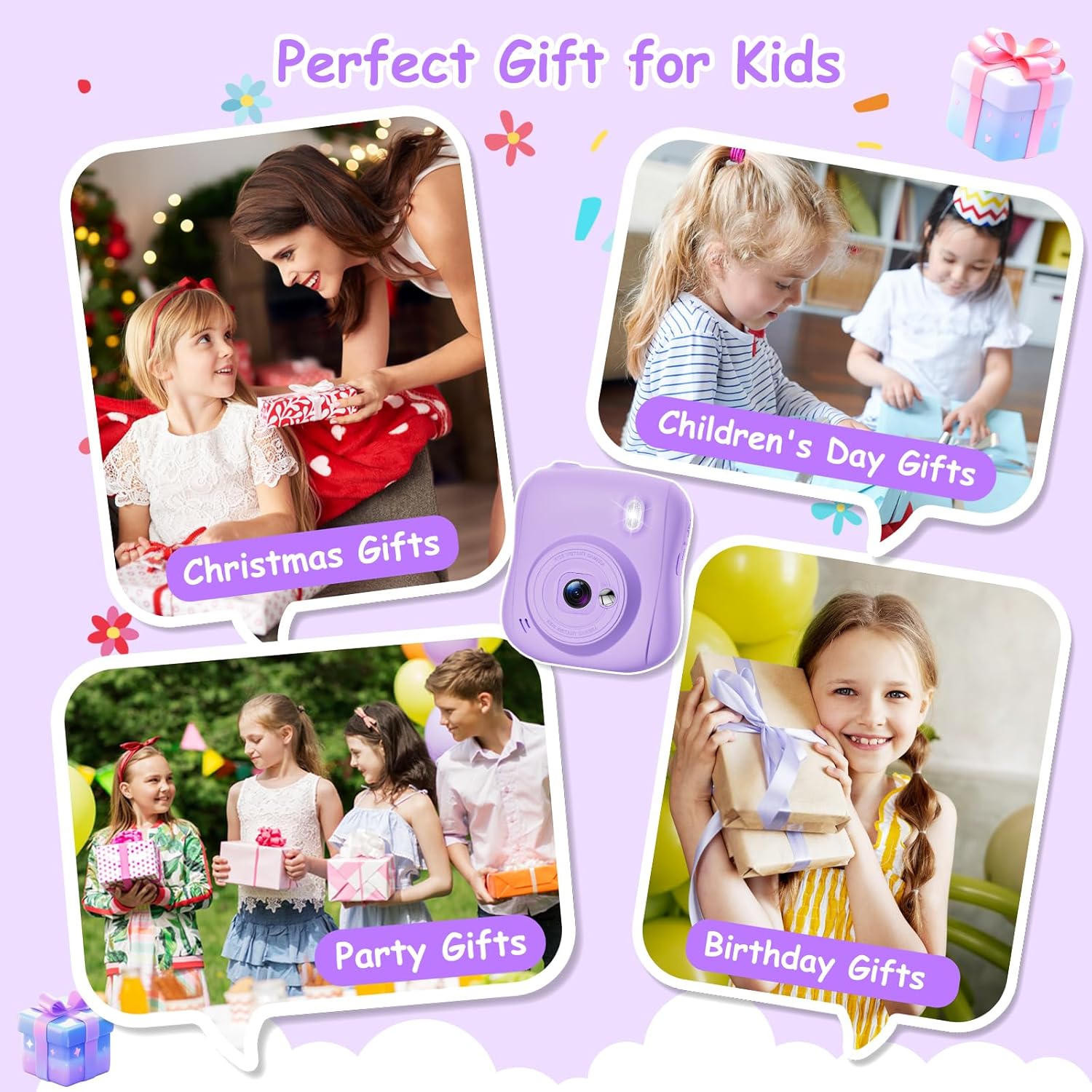 Детска камера Hangrui, 14MP камера за моментално снимане, детска камера с 32G карта и хартия за печат, 1080P камера, детска камера за моментално снимане с цветни химикалки, подарък за 3-12 момчета и момичета, лилаво
