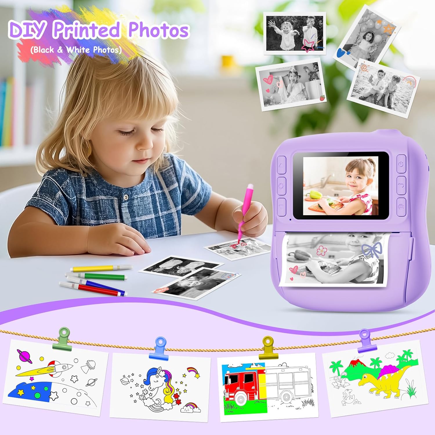 • Детска камера с едно докосване: Детската камера за моментално снимане позволява незабавно и автоматично отпечатване на висококачествени, ярки „черно-бели“ снимки, които децата могат да споделят с приятели и семейство. С опростен потребителски интерфейс, лек дизайн и 3 ролки хартия за печат, децата могат лесно да правят снимки и да ги отпечатват без никакви затруднения.