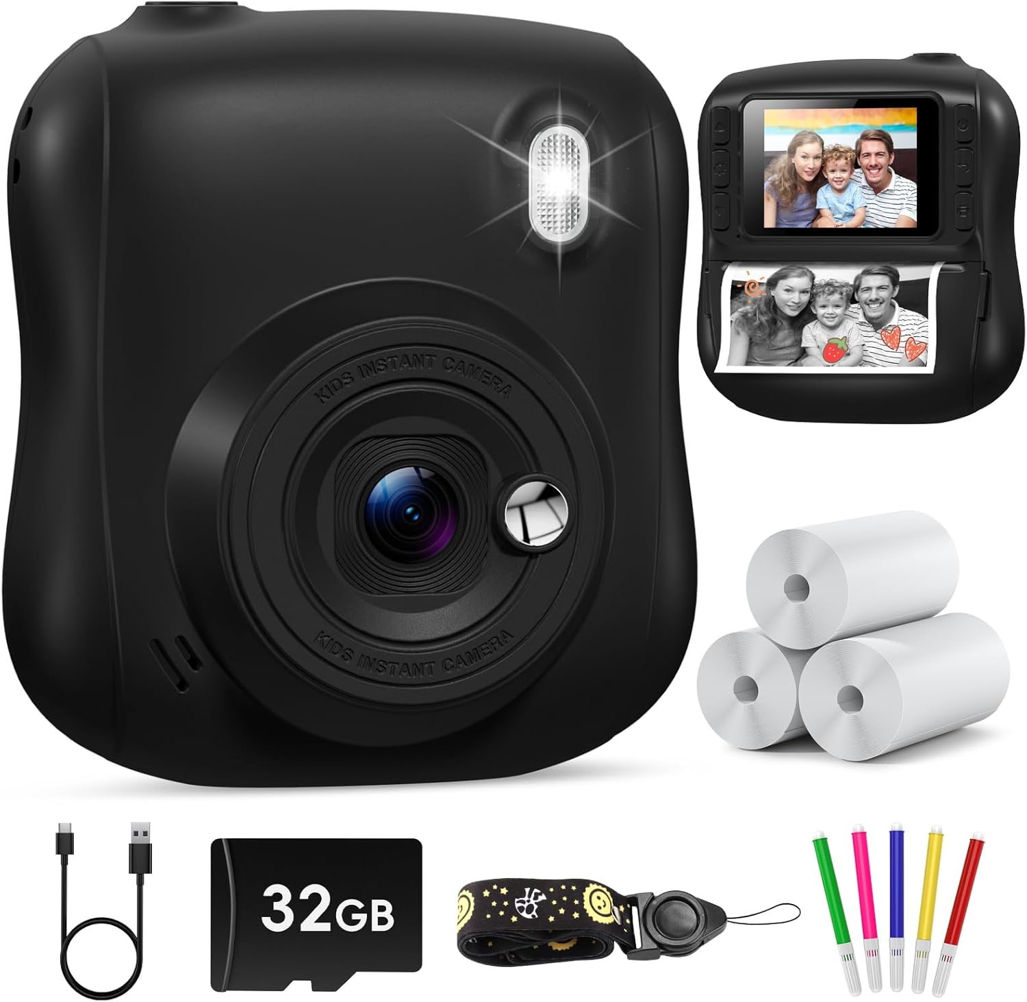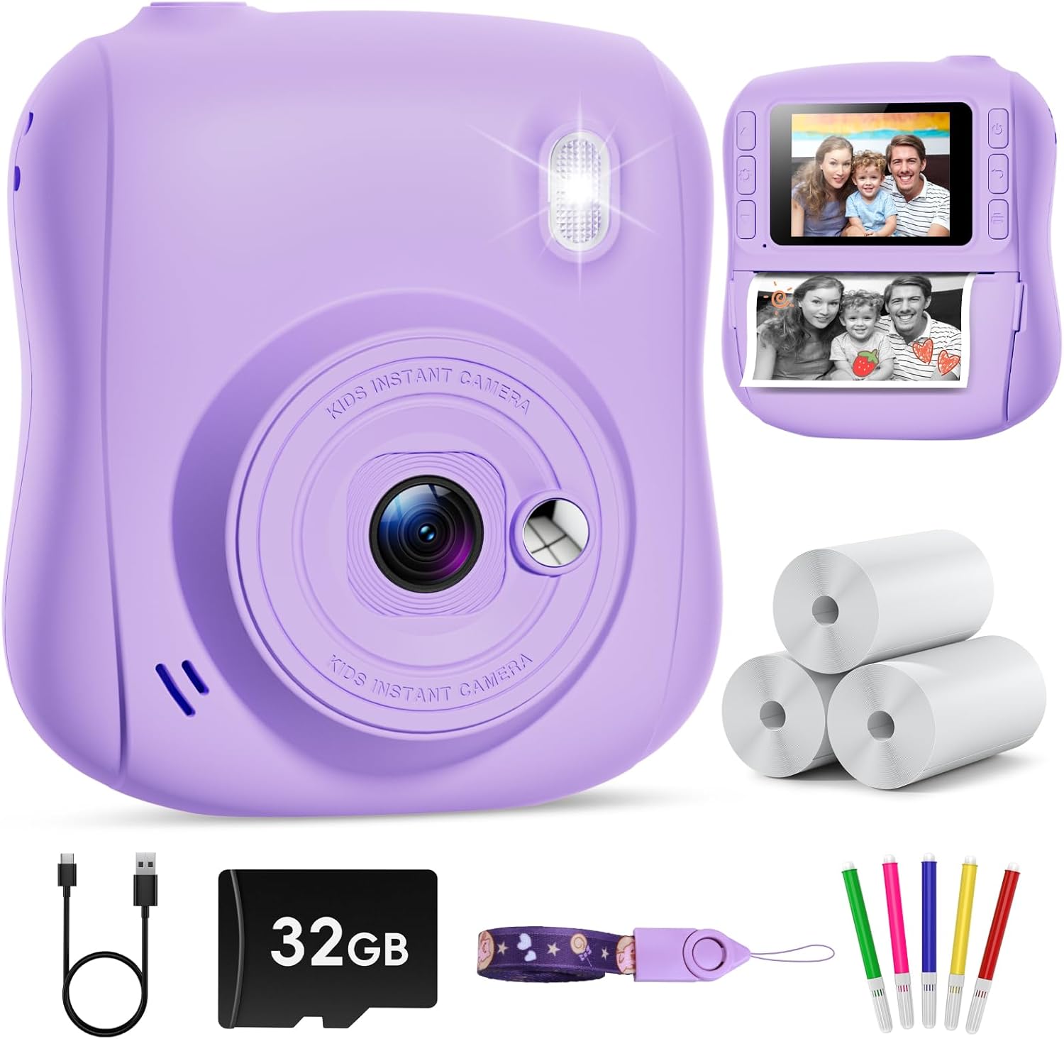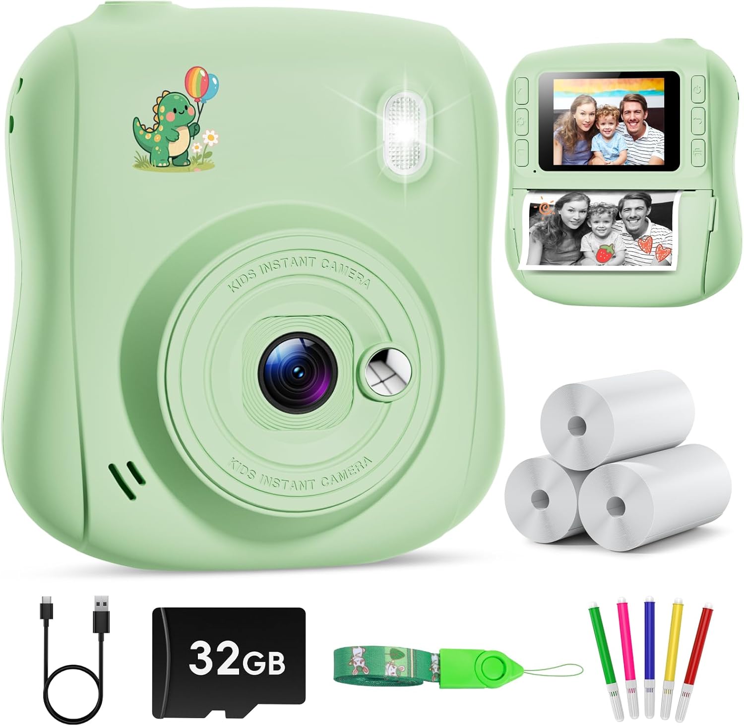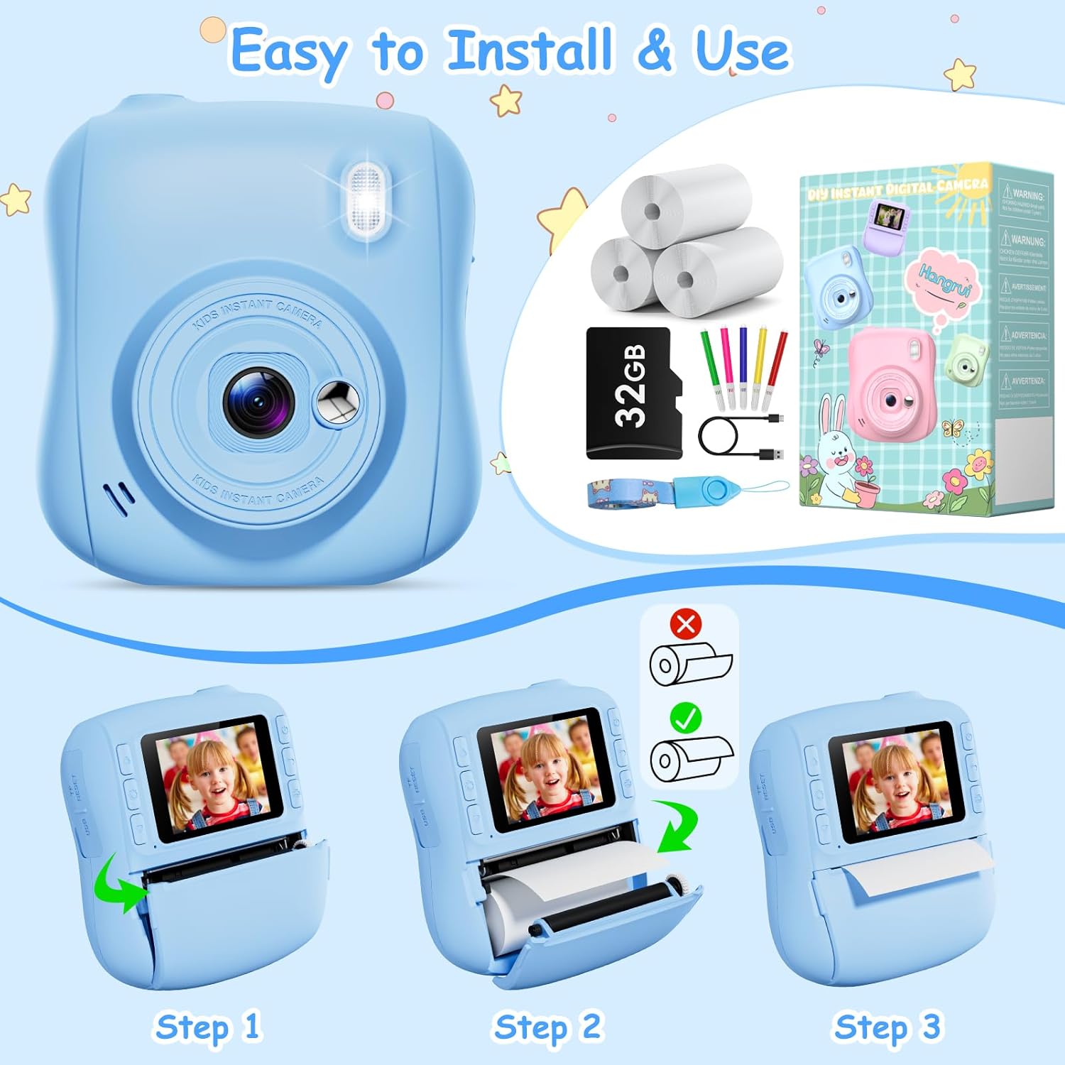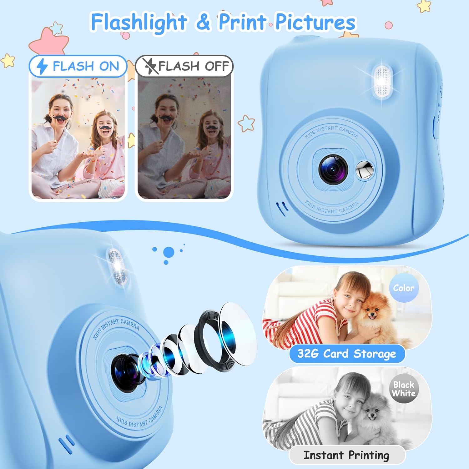 • Многофункционален детски фотоапарат за моментални снимки: Този детски фотоапарат предлага моментално отпечатване, 2.0-инчов екран, 1080P видео, 10x цифрово увеличение, осветяване на екрана, timelapse, непрекъснато снимане, забавни стикери, MP3 функция и още - той има всичко! С предварително инсталирана 32GB карта могат да се съхраняват хиляди снимки и видеоклипове. Той носи на децата повече вдъхновение и забавление при снимане и помага да запечатат детството си.