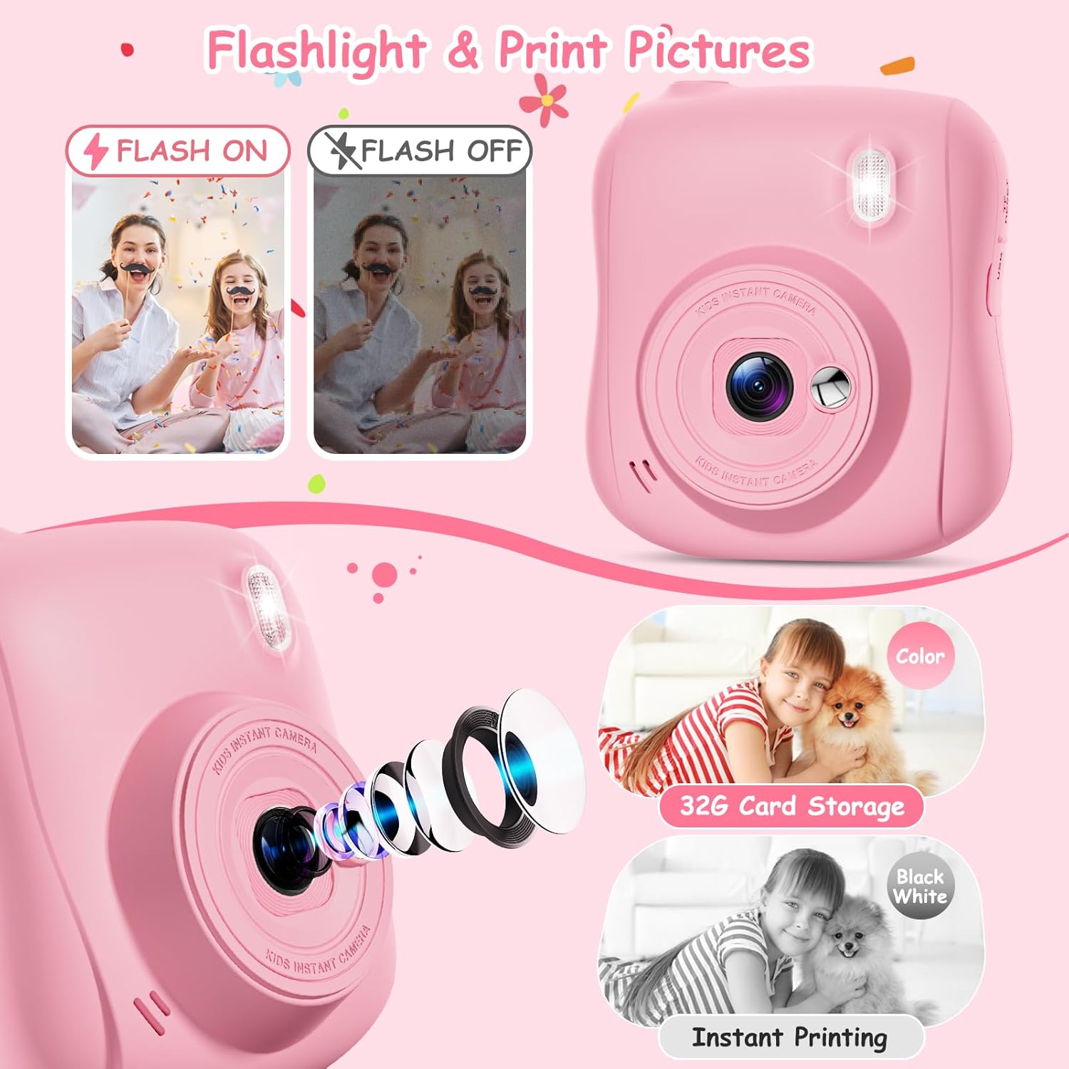 • Многофункционален детски фотоапарат за моментални снимки: Този детски фотоапарат предлага моментално отпечатване, 2.0-инчов екран, 1080P видео, 10x цифрово увеличение, осветяване на екрана, timelapse, непрекъснато снимане, забавни стикери, MP3 функция и още - той има всичко! С предварително инсталирана 32GB карта могат да се съхраняват хиляди снимки и видеоклипове. Той носи на децата повече вдъхновение и забавление при снимане и помага да запечатат детството си.
