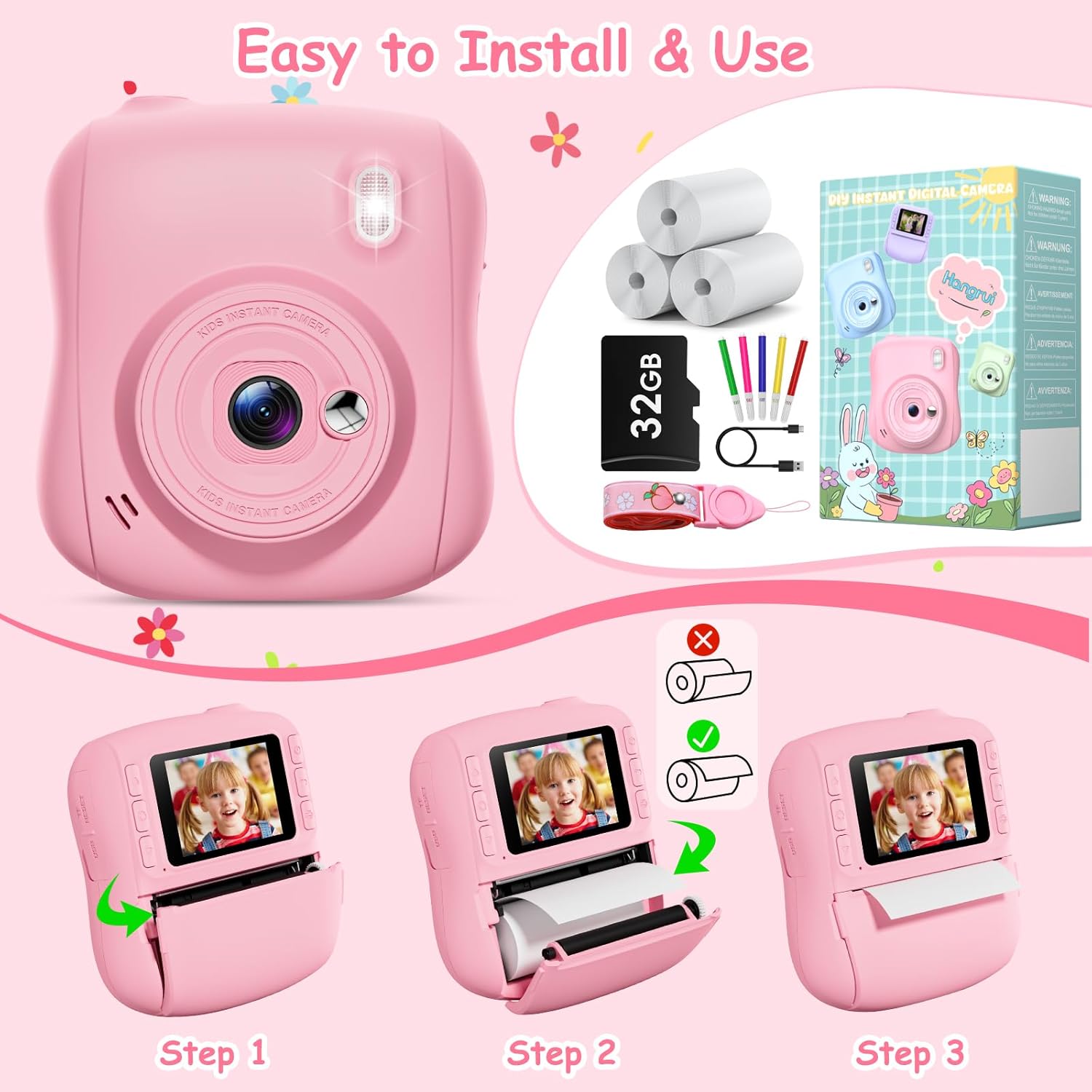 Детска камера Hangrui, 14MP камера за моментално снимане, с 32G карта и хартия за печат, 1080P камера, детска камера за моментално снимане с цветни химикалки, подарък за момчета и момичета от 3 до 12 години