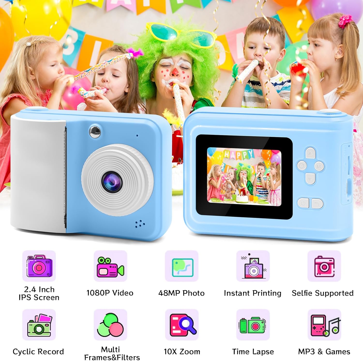 Instant camera for children with 48 megapixels and 1080P HD video, 2.4 inch IPS display. The kids camera supports original photo shooting, video recording, playback, continuous shooting, 5 classic filters, 8 special effects, 20 cute cartoon frames, 20 languages available.