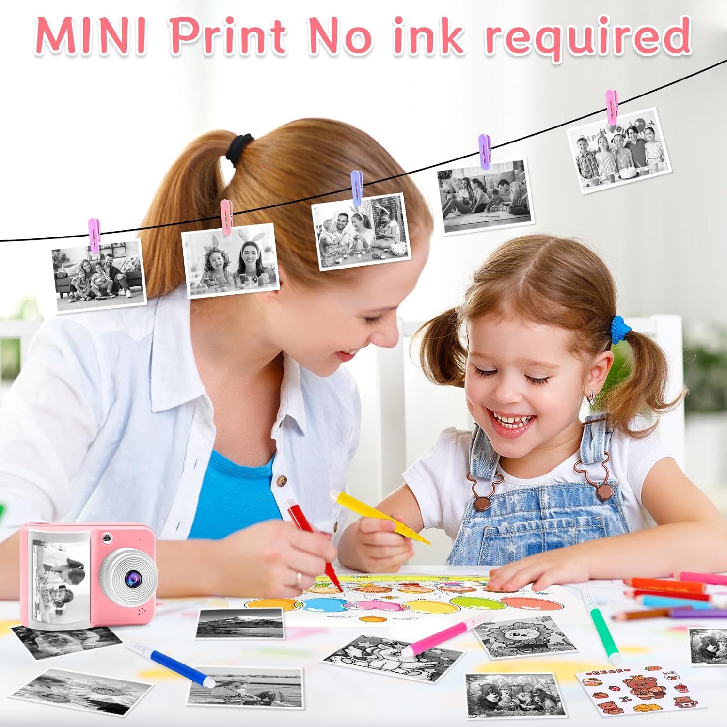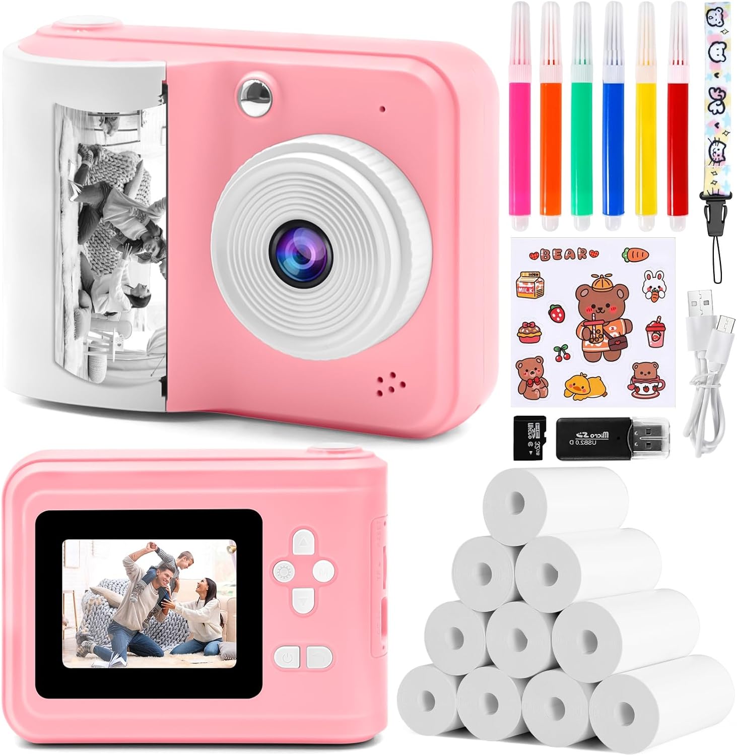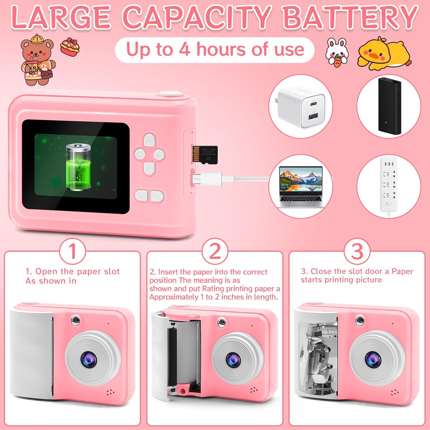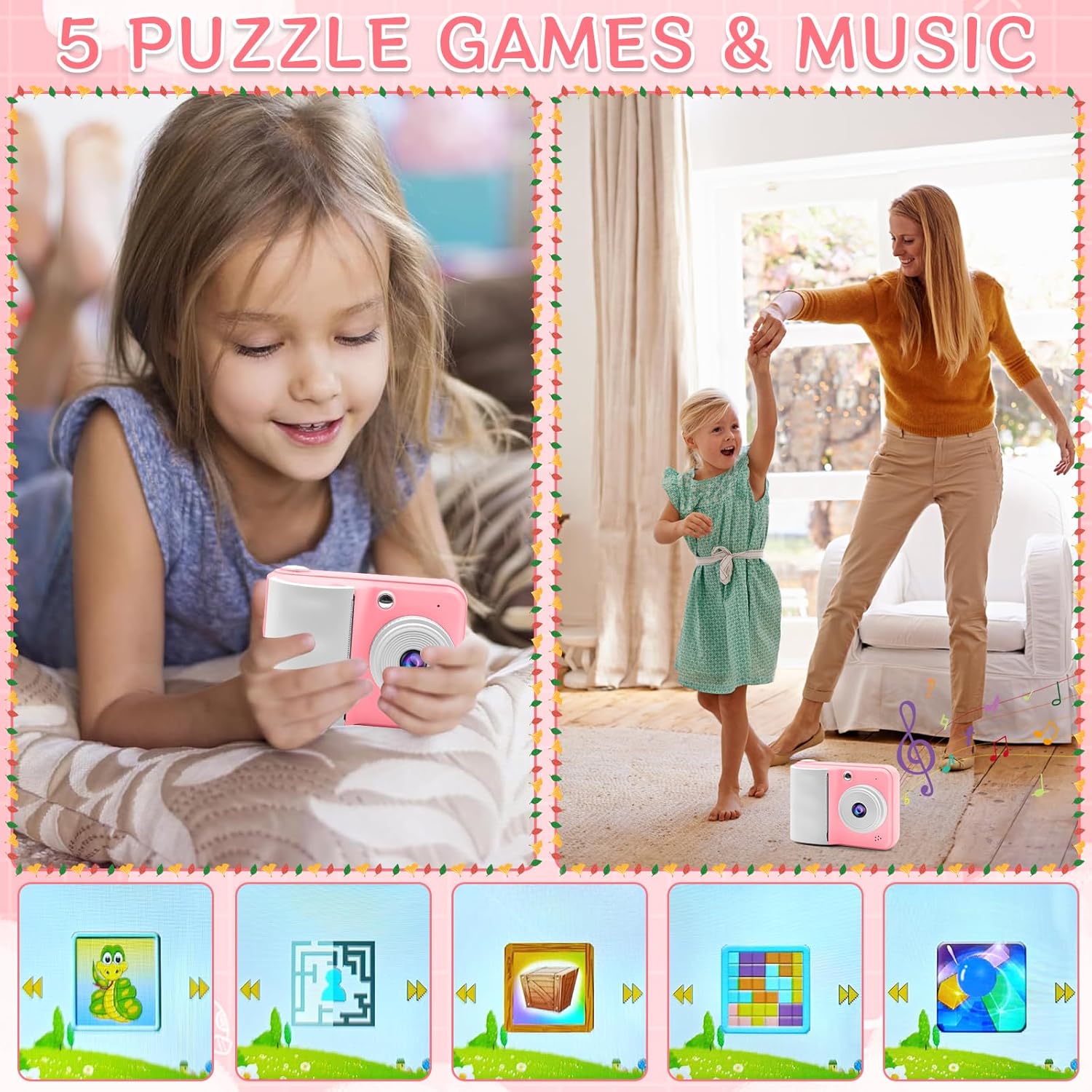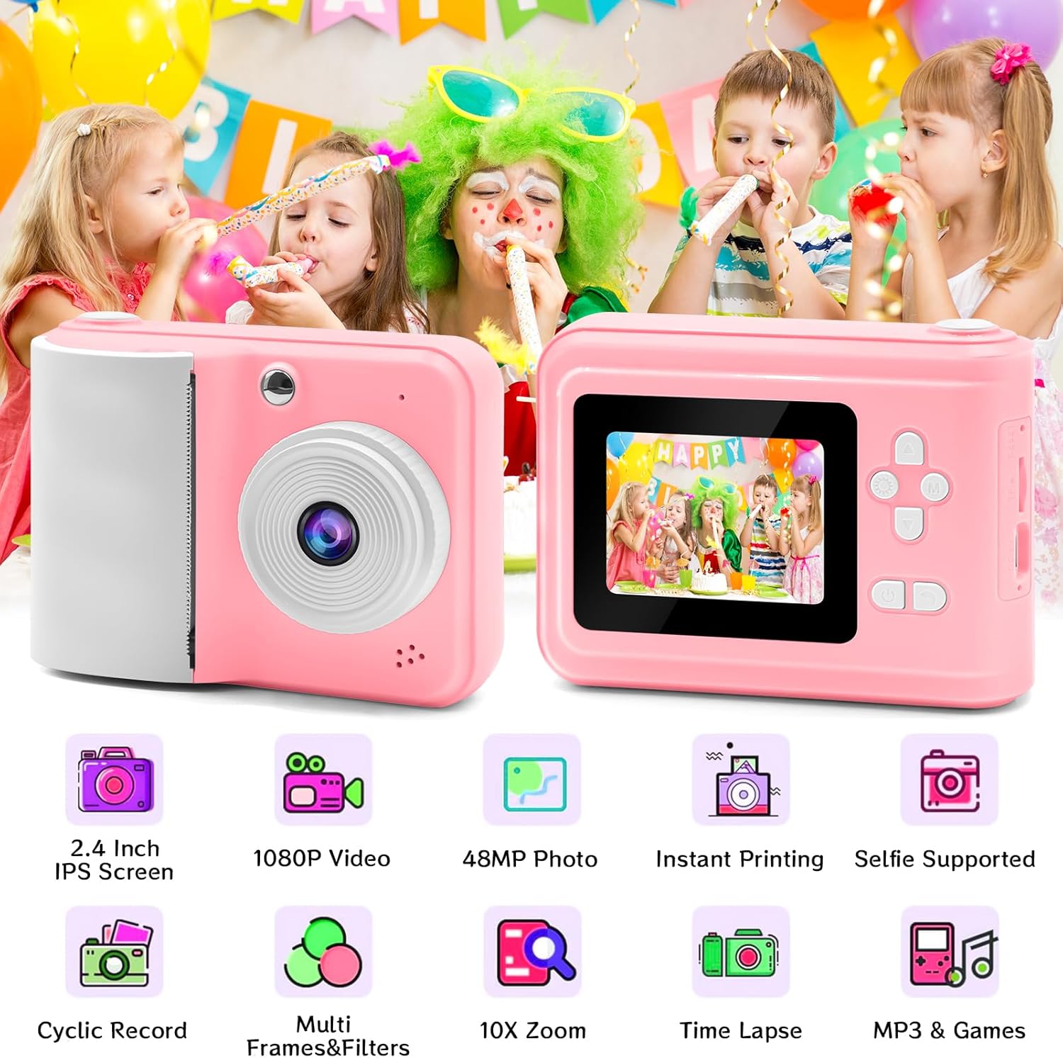 Детска камера за моментални снимки 1080P 2.4-инчов екран с хартия за печат и 32GB TF карта, цифров фотоапарат с цветни химикалки - подарък за деца 3-12 години