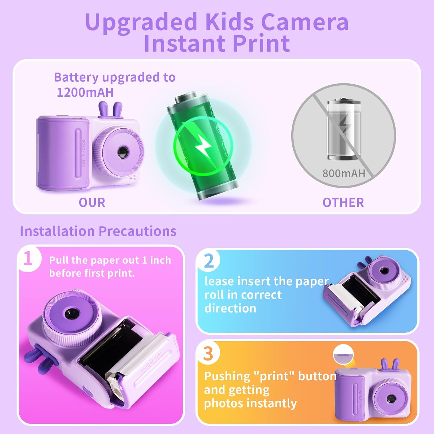 Детска камера за моментални снимки с хартия за печат и SD карта, 1080P цифрова видеокамера, детски подаръци за момичета и момчета 3-12 години, камера за деца, коледна играчка (лилава)