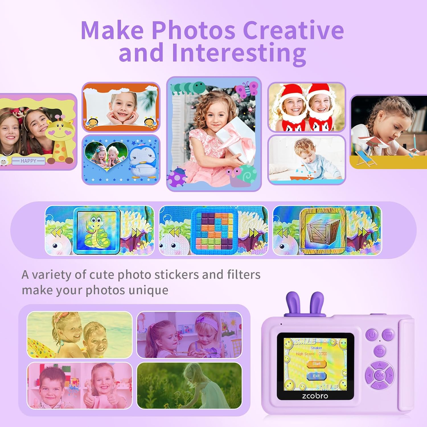 • Многофункционална детска камера за моментално печатане: zcobro KC5 детска камера за моментално печатане с 2.4-инчов IPS голям екран, цветна фотография/видеозапис, черно-бял печат, timelapse, непрекъснато снимане, MP3 игри, автоматично изключване, 8x увеличение, 3 пъзел игри, 29 анимационни фоторамки/фото филтри и огледални ефекти, подходяща за деца за правене на снимки/видеоклипове с голяма креативност, запечатайте всеки щастлив момент с тази детска камера за моментално печатане. Донесете на децата повече забавление, развийте въображението им и подобрете интелигентността им.