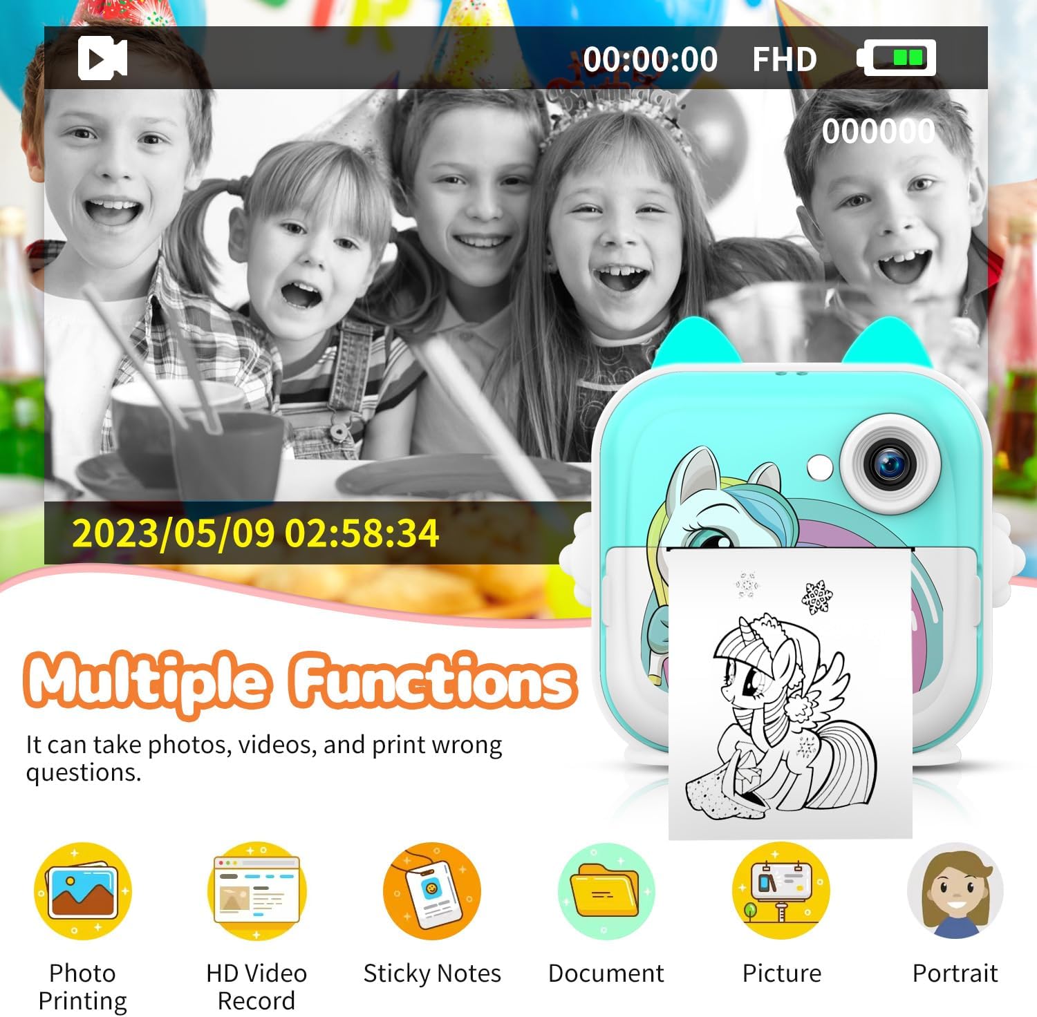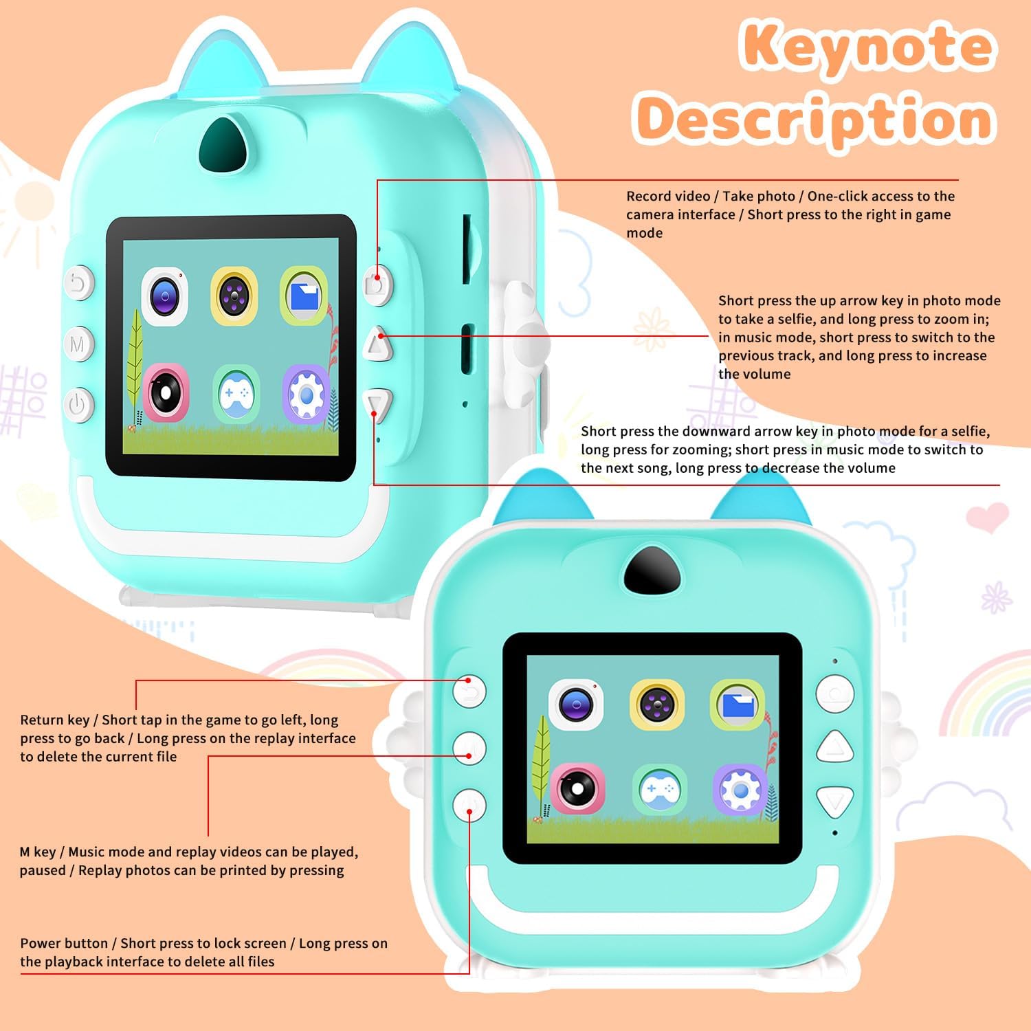 • Многофункционален детски дигитален фотоапарат: Нашият детски дигитален фотоапарат има 2,4-инчов IPS екран и други функции. Като например незабавен черно-бял печат, цветно фотозаснемане, 1080P видеозапис, 6x цифрово увеличение, time-lapse фотография, непрекъснато заснемане, игри и възпроизвеждане на MP3 и други функции. Това е добър избор да придружите децата си, за да растат щастливи и да дадете на вас и вашето семейство прекрасни моменти.