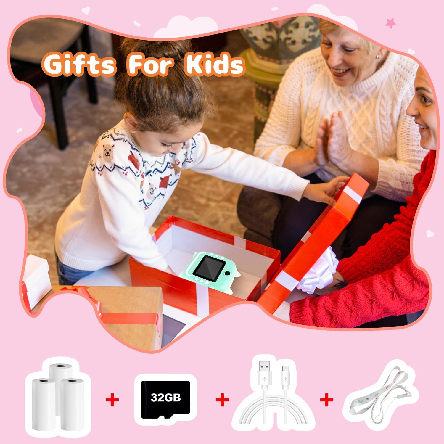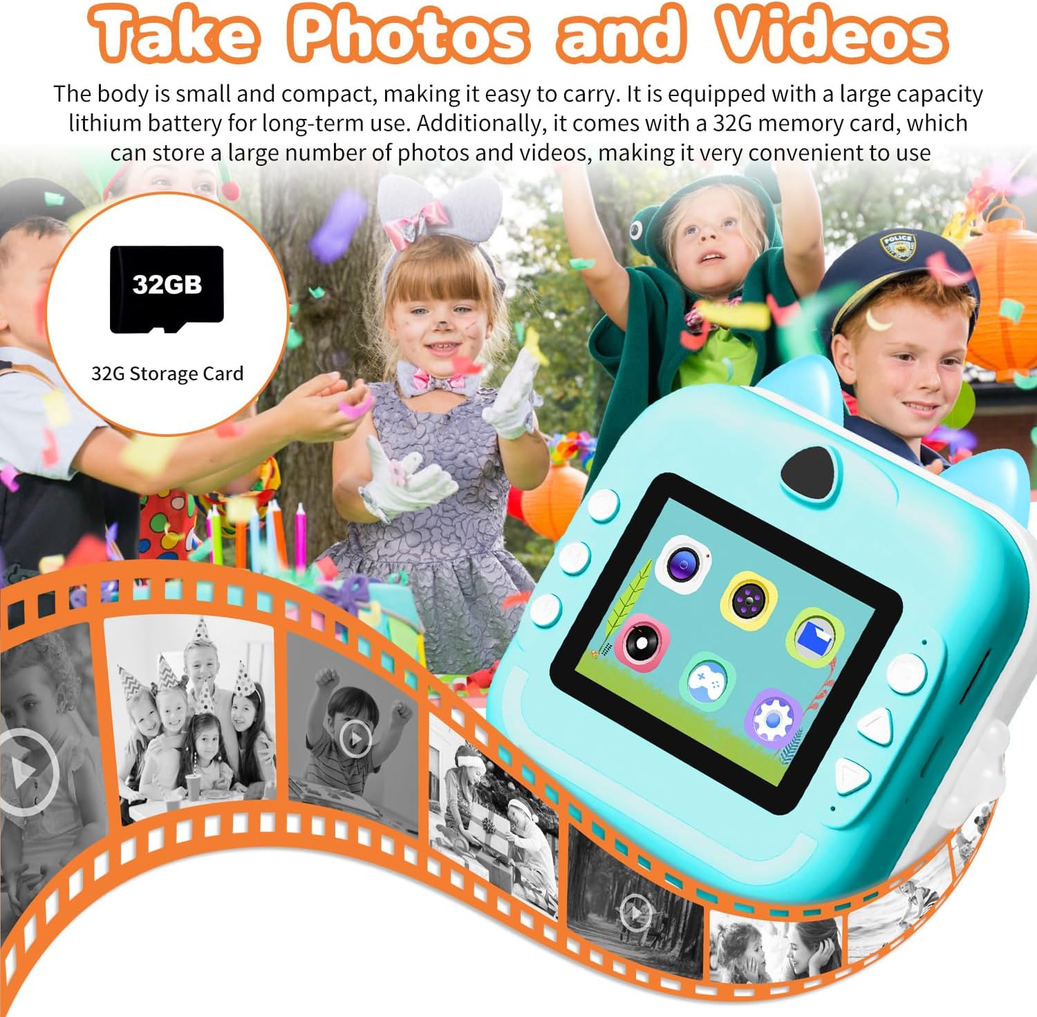 Детска камера за моментално снимане, 2.4-инчов дисплей, цифров фотоапарат и видеокамера за деца с 3 ролки термохартия и 32G карта, коледна играчка, подаръци за момчета и момичета над 6 години