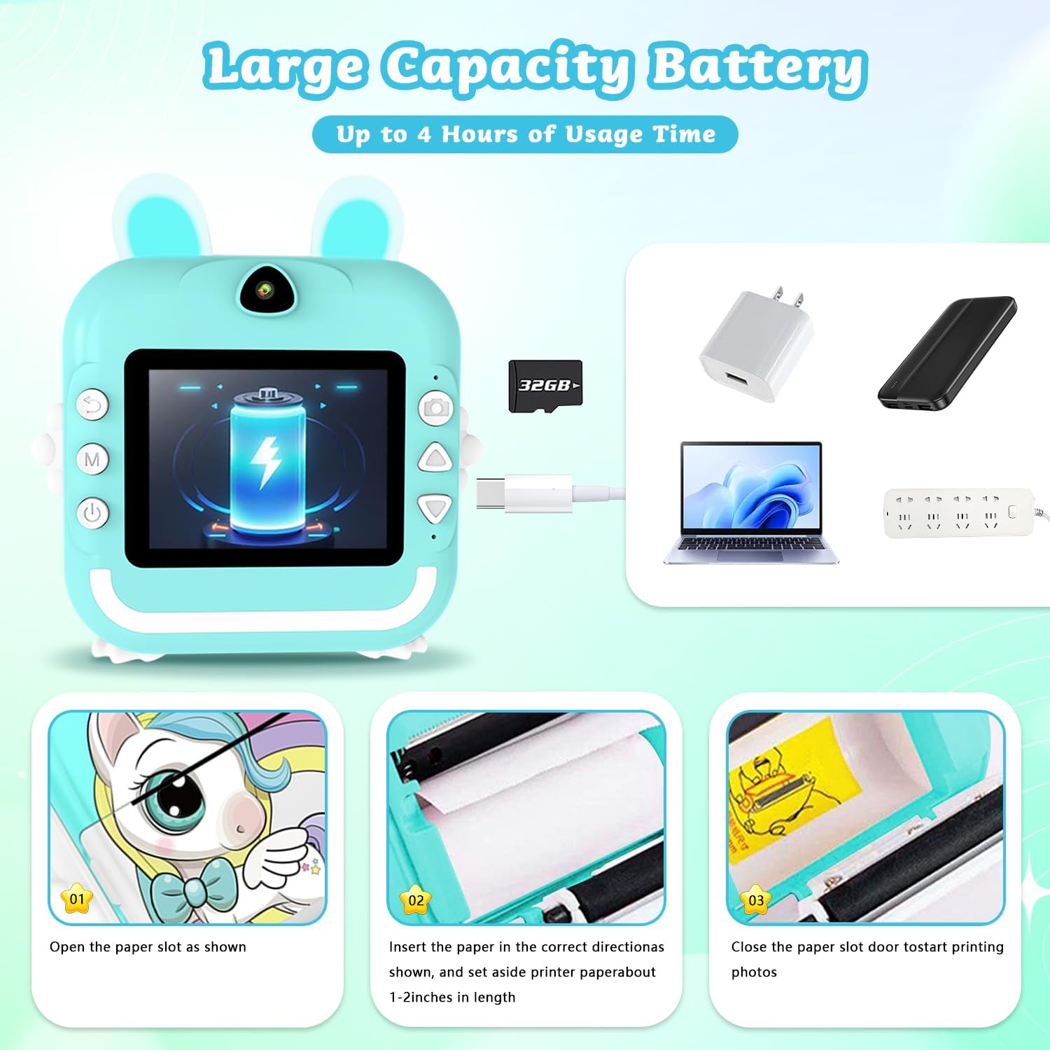 • Голям капацитет, просто: Капацитетът на батерията е 1200 mAh, а камерата за пътуване използва технология за зареждане Type C. Пълното зареждане отнема около 3 часа, което спестява време. След пълно зареждане можете да правите снимки или да слушате музика непрекъснато в продължение на 3-4 часа. Съхранявайте хиляди снимки! Правете колкото искате снимки по всяко време и навсякъде и бъдете креативни с тази преносима камера за моментални снимки!