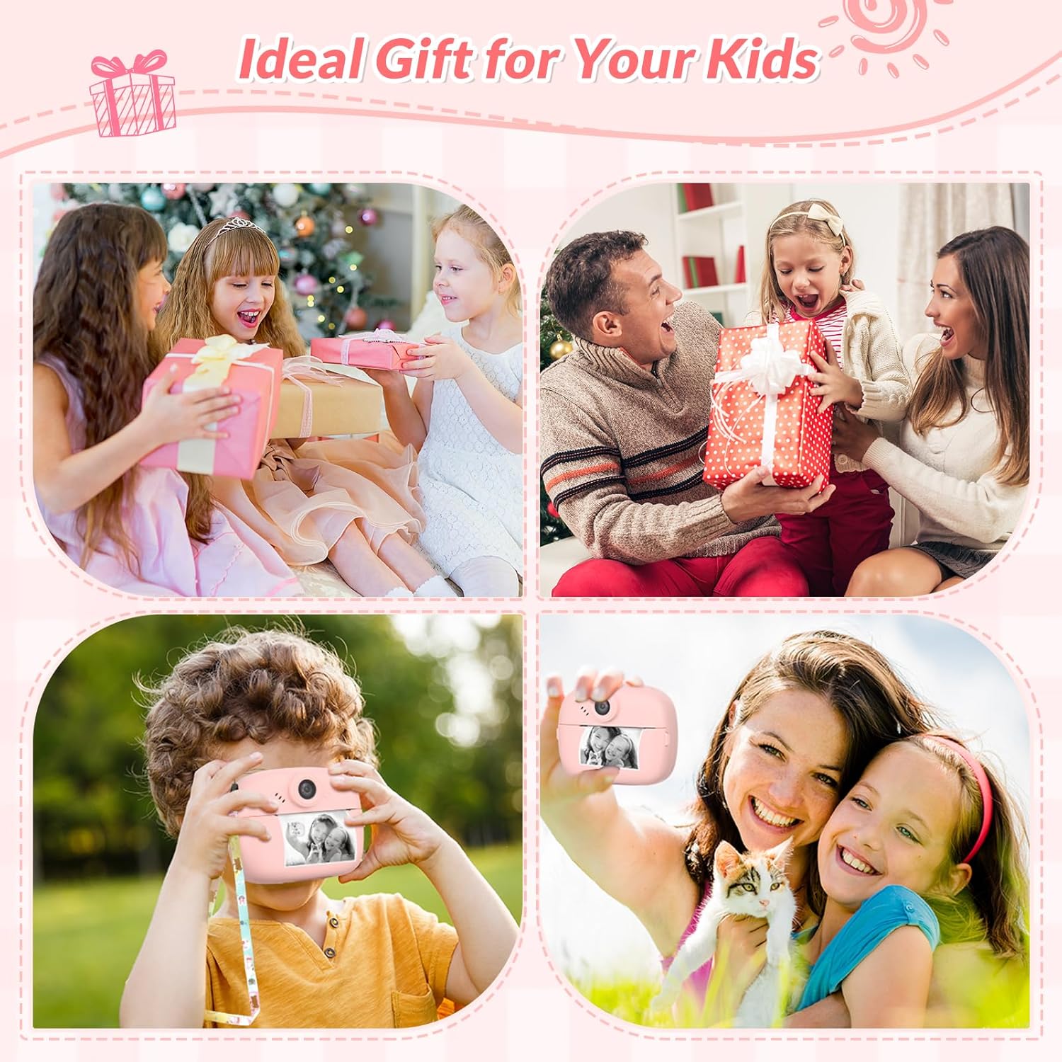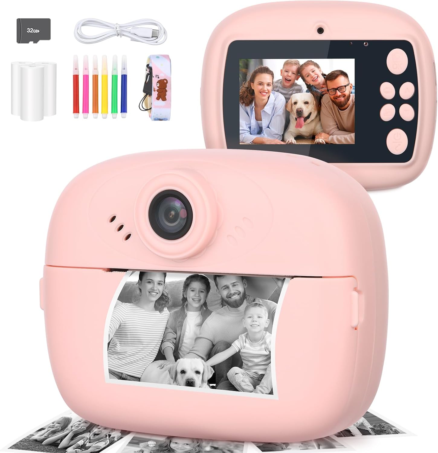 Детска камера за моментално снимане за деца, цифрова камера, детска камера за моментално снимане, 1080P 2.4-инчов екран, камера за моментално снимане за деца с хартия за печат и 32G TF карта, подарък за деца (розов)