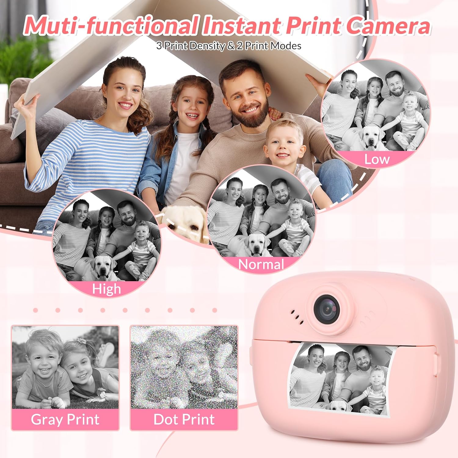 • Камера за моментално печатане с нулево мастило: детските камери използват технология за моментално заснемане, която може да отпечата снимка за една секунда (без мастило) и да избира различна плътност на печат от 1 до 7. С прост печат децата могат да замразят изображението за секунди и да го отпечатат на хартия. (Осигурени са 3 ролки хартия за печат, способни да отпечатат до 180 снимки)