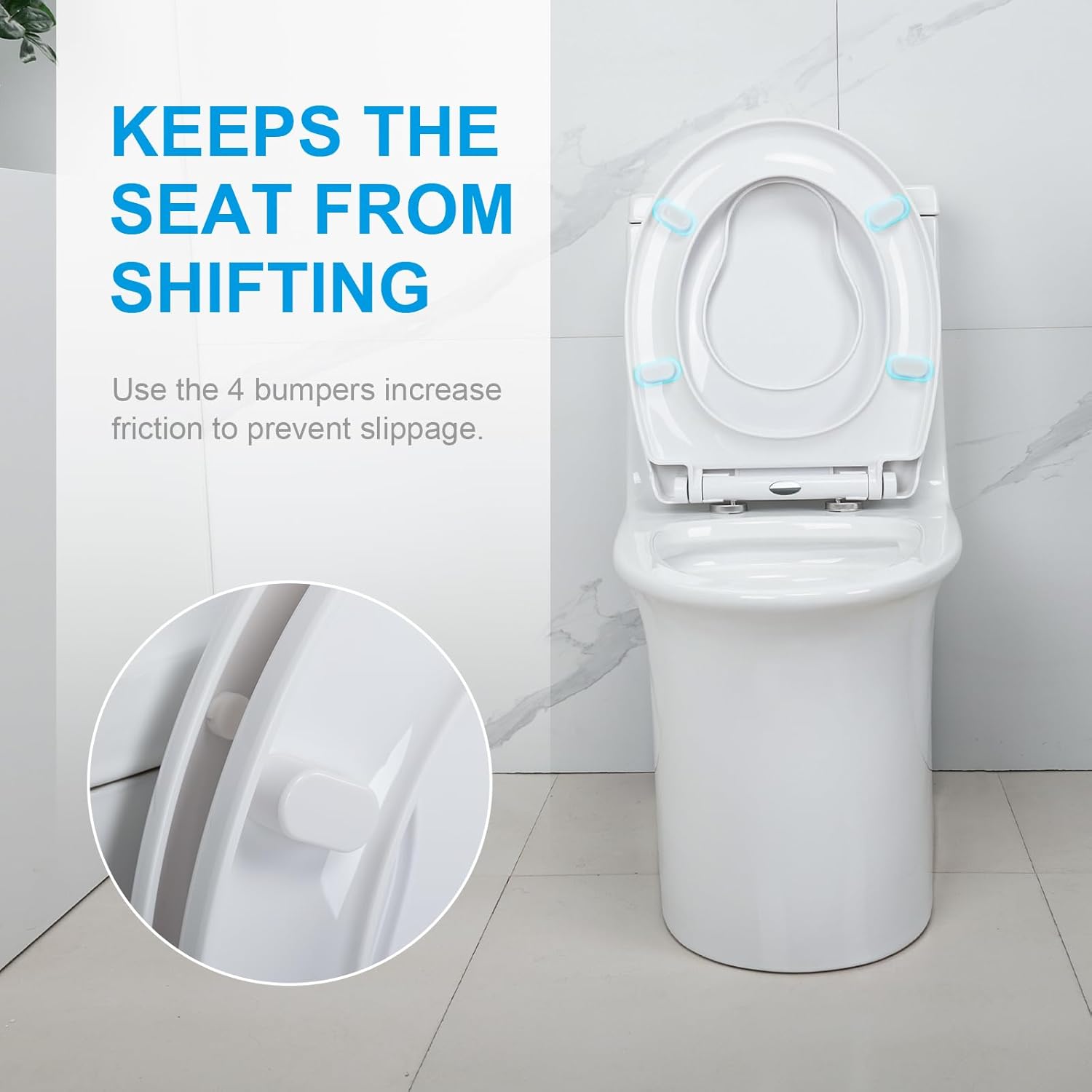В капака на тоалетната чиния има 4 вградени противоплъзгащи възглавнички, които предотвратяват изместването или разхлабването на седалката след продължителна употреба.