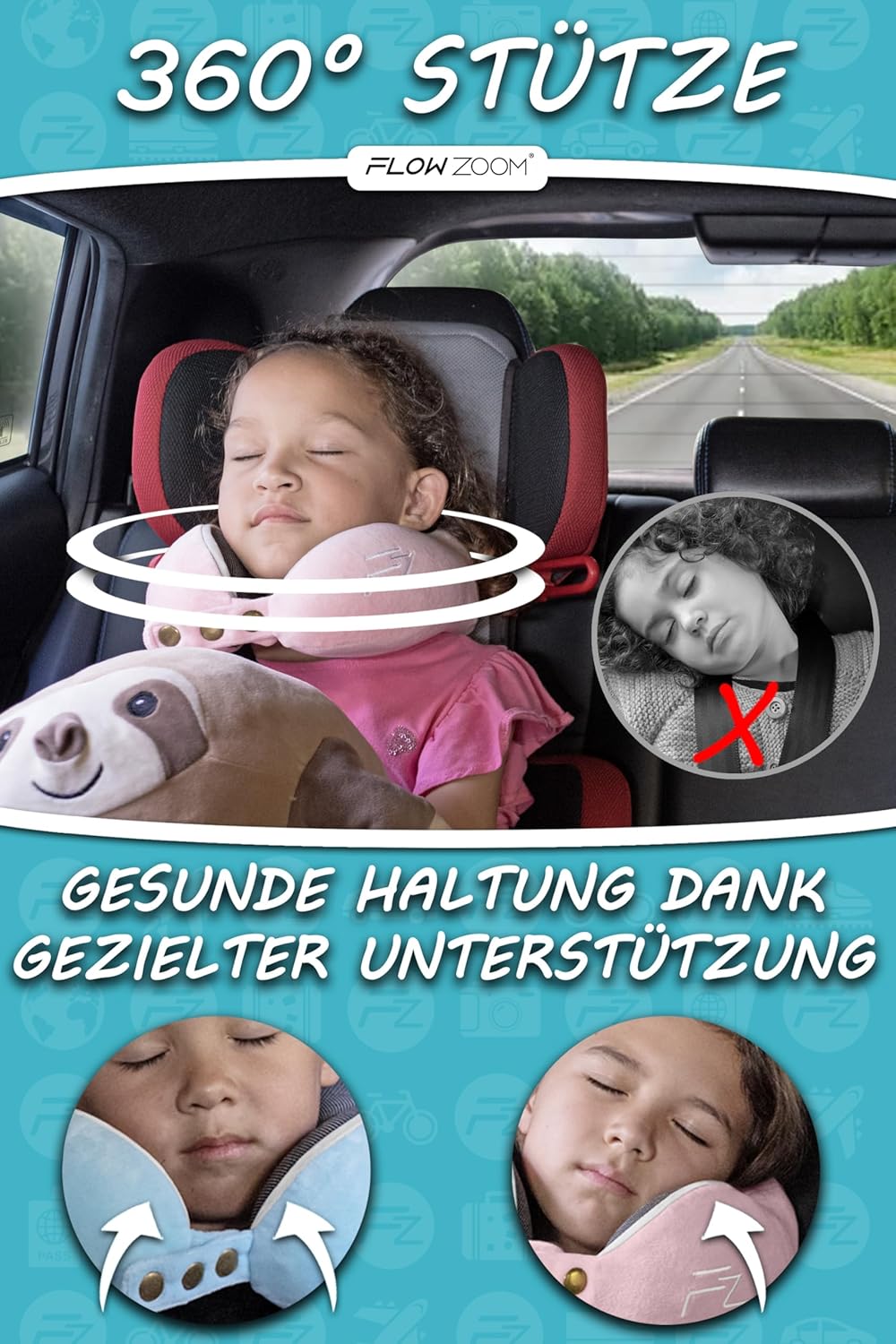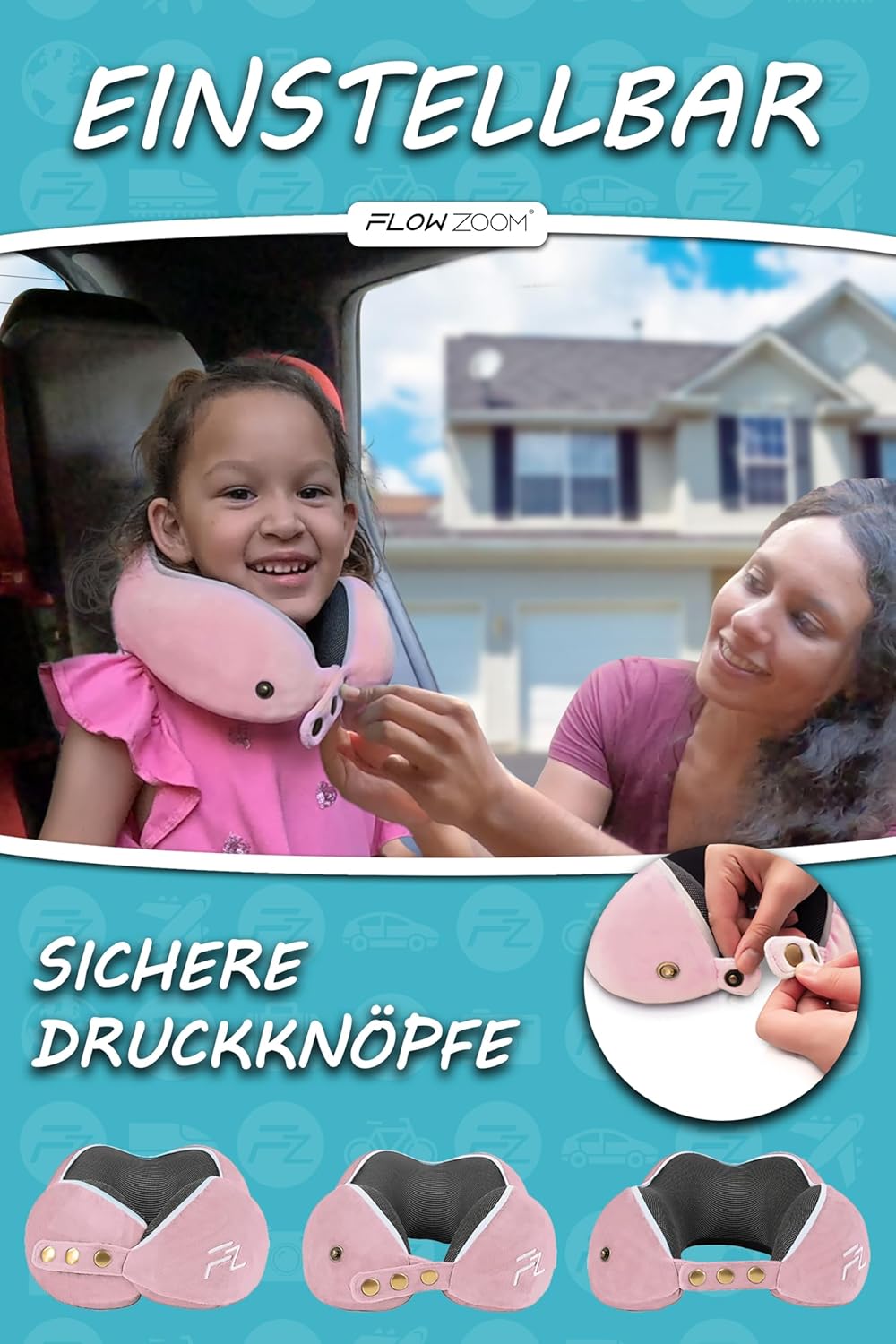 Детска възглавница за пътуване FLOWZOOM COMFY - Детски възглавници за врата за пътуване - Възглавница за кола за деца - Възглавница за пътуване от мемори пяна за самолет - За възраст 3+ години - Розова