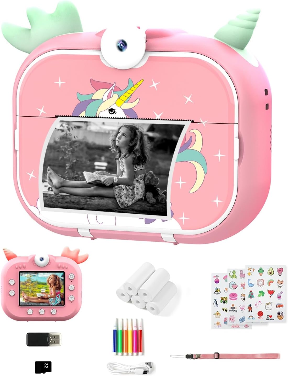 • Фотоапарат за моментално снимане: Коледен подарък за деца. Фотоапаратът за моментално снимане за деца е изработен от безопасни материали, без PBA, със сладък и издръжлив дизайн и лесен за разбиране интерфейс. Това е перфектен коледен подарък за деца. Съвет: Отпечатаните снимки са черно-бели. ПАКЕТЪТ ВКЛЮЧВА 1 x Цифров фотоапарат 32GB Micro SD карта 1 x Четец на карти 5 x Хартия за принтер (могат да се отпечатат до 400 снимки) 5 x Цветен химикал 1 x Панделка