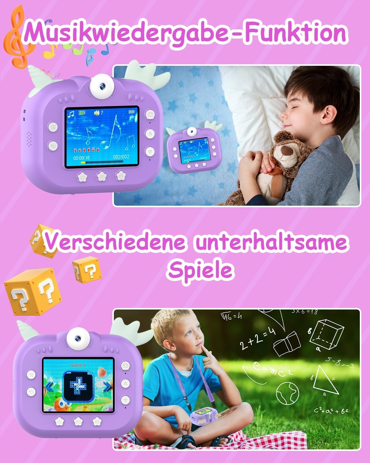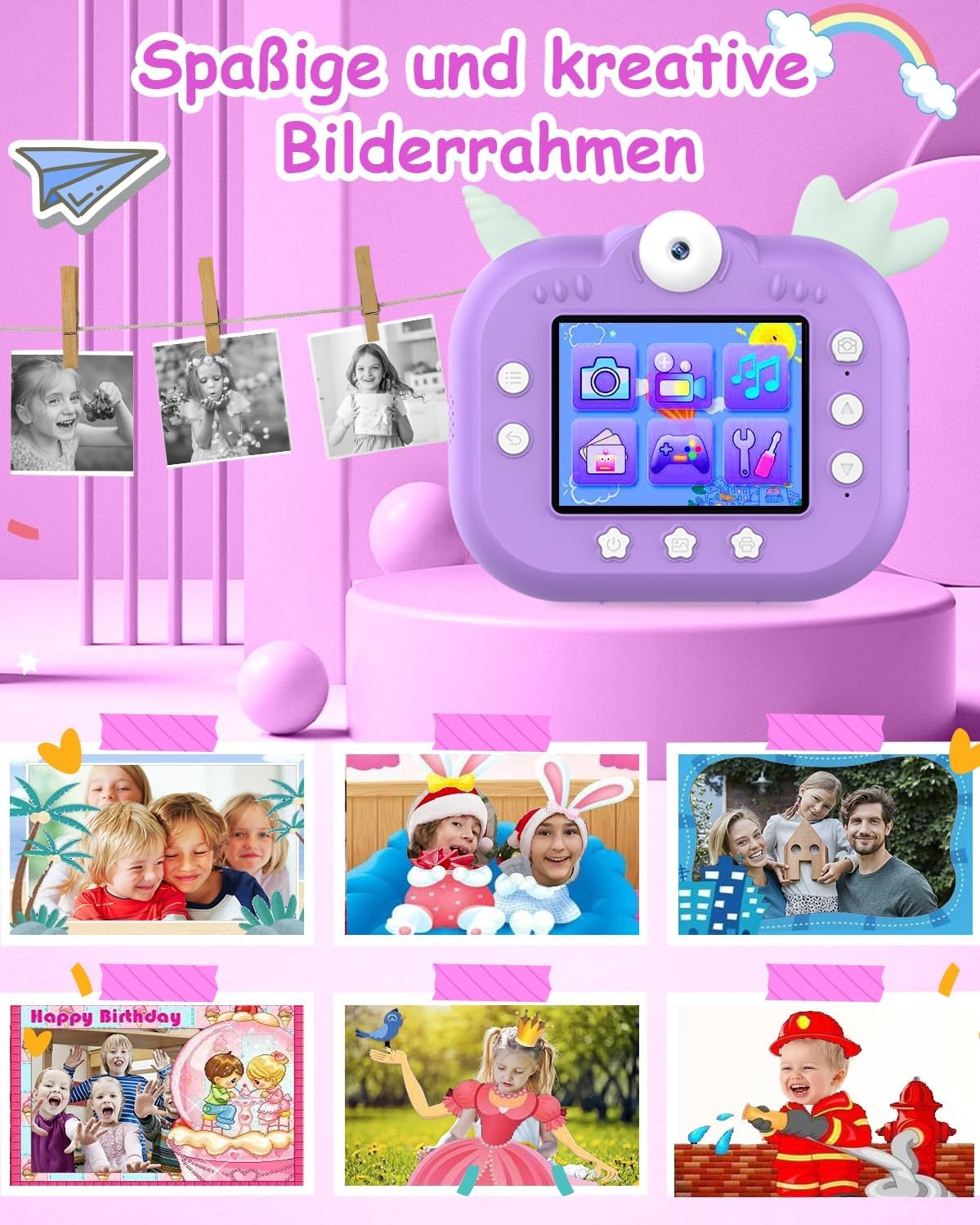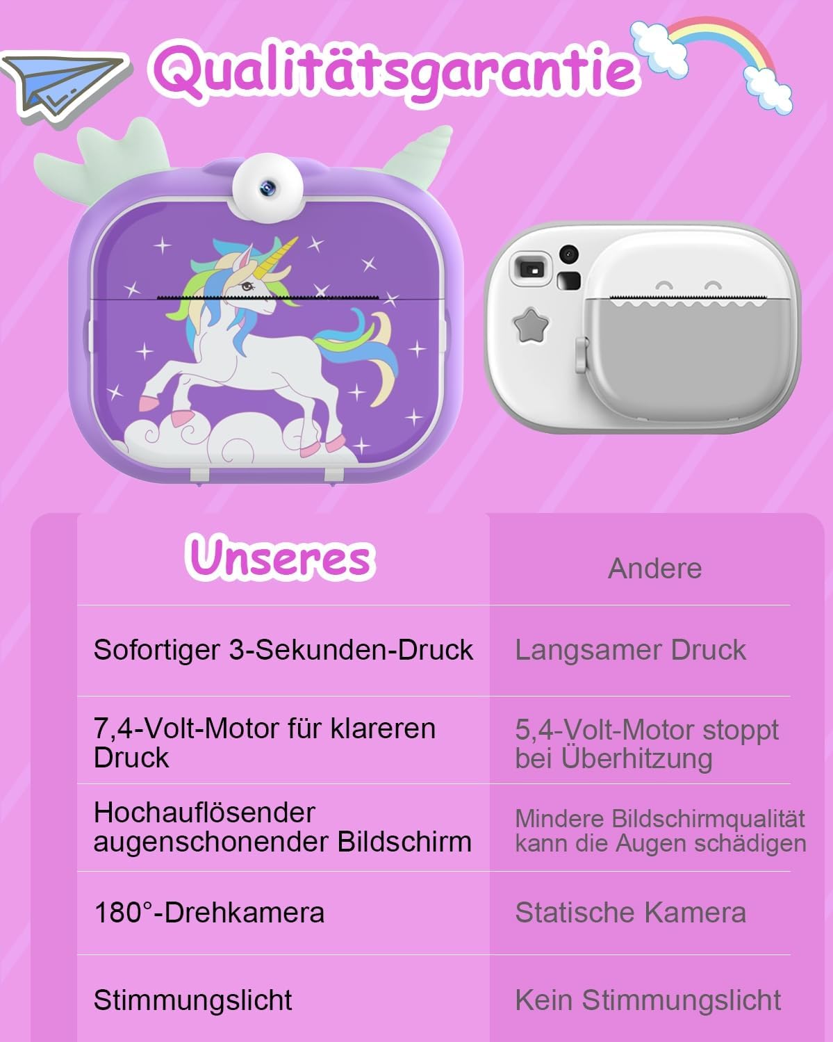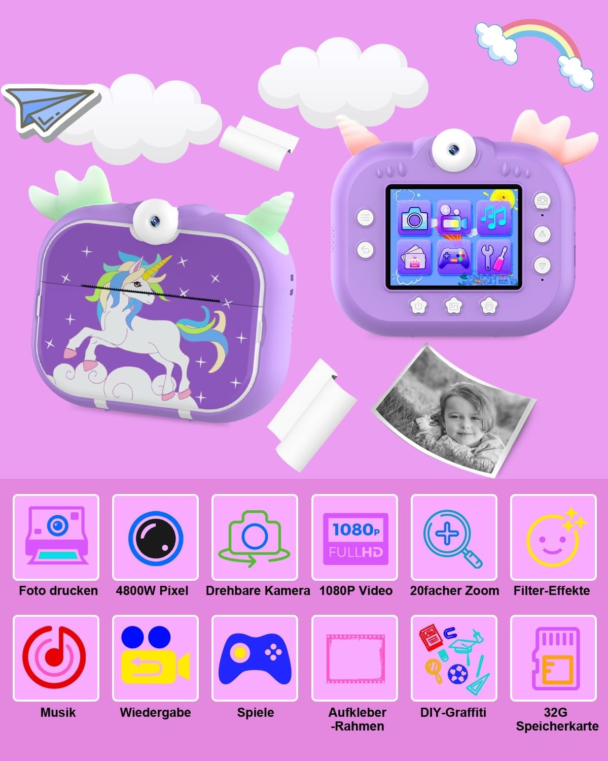 • 【Камера за моментално печатане за деца】: Тази камера за печат позволява на децата да отпечатват снимки мигновено само за три секунди, 7,4-волтовият мотор поддържа непрекъснат печат. 2,4-инчов IPS цветен дисплей, 4800W пиксела, 1080P резолюция, 7 интензитета на печат, 8 размера на снимките, 3 цвята на околна светлина, 20x увеличение, 6 филтъра, 26 рамки за снимки, поддръжка на възпроизвеждане, таймер за снимки, 12 национални езика.