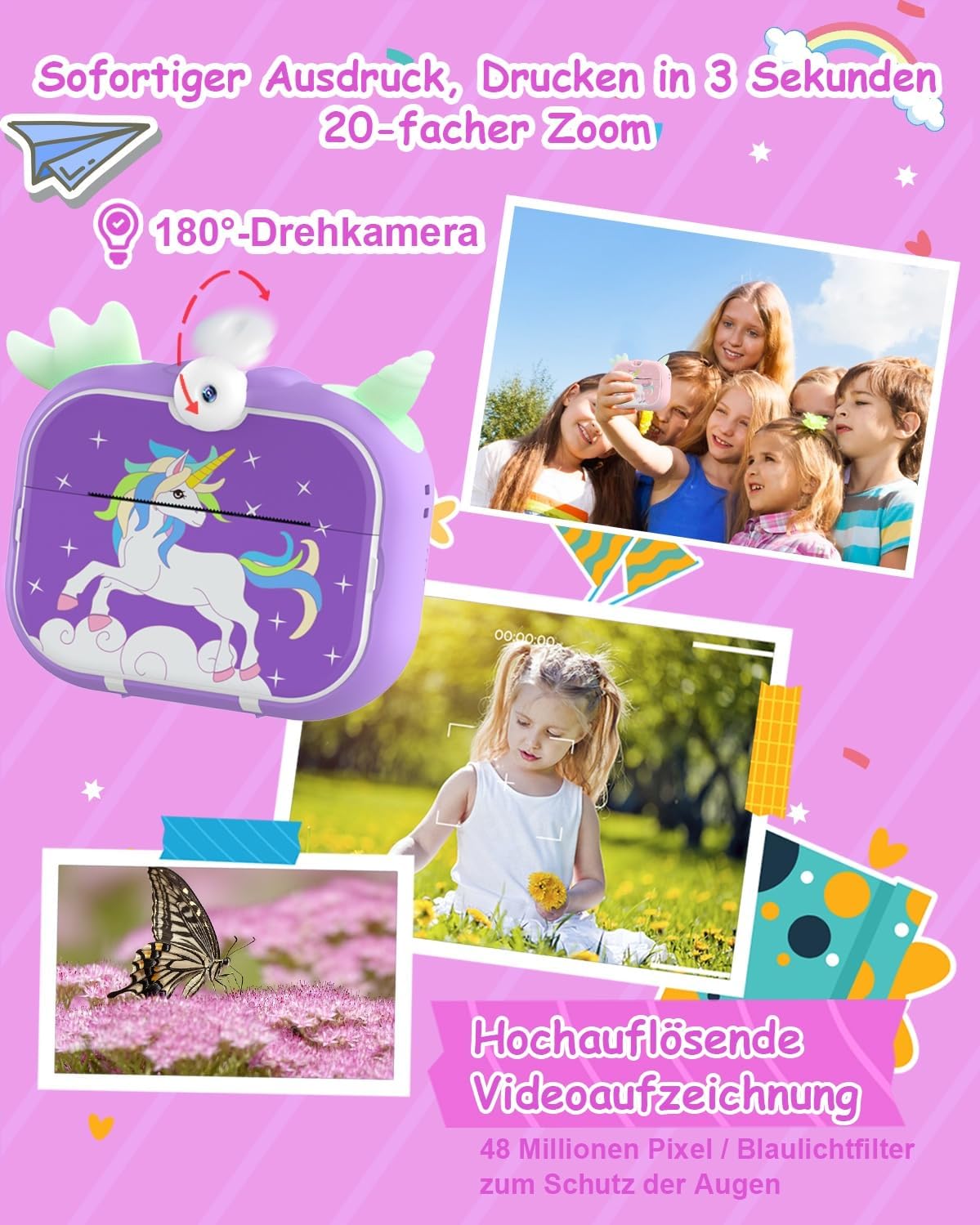 • 【24 милиона HD пиксела, защита на очите от синя светлина за деца】: цифровият фотоапарат има въртяща се на 180° камера за креативно снимане. Освен това, децата могат да използват този фотоапарат, за да записват видеоклипове с пълно HD 1080P качество. С 20x увеличение и филтърни ефекти и анти-синя светлина за защита на детските очи. Съвет: Ако отпечатъкът не е достатъчно остър, регулирайте плътността на печат!