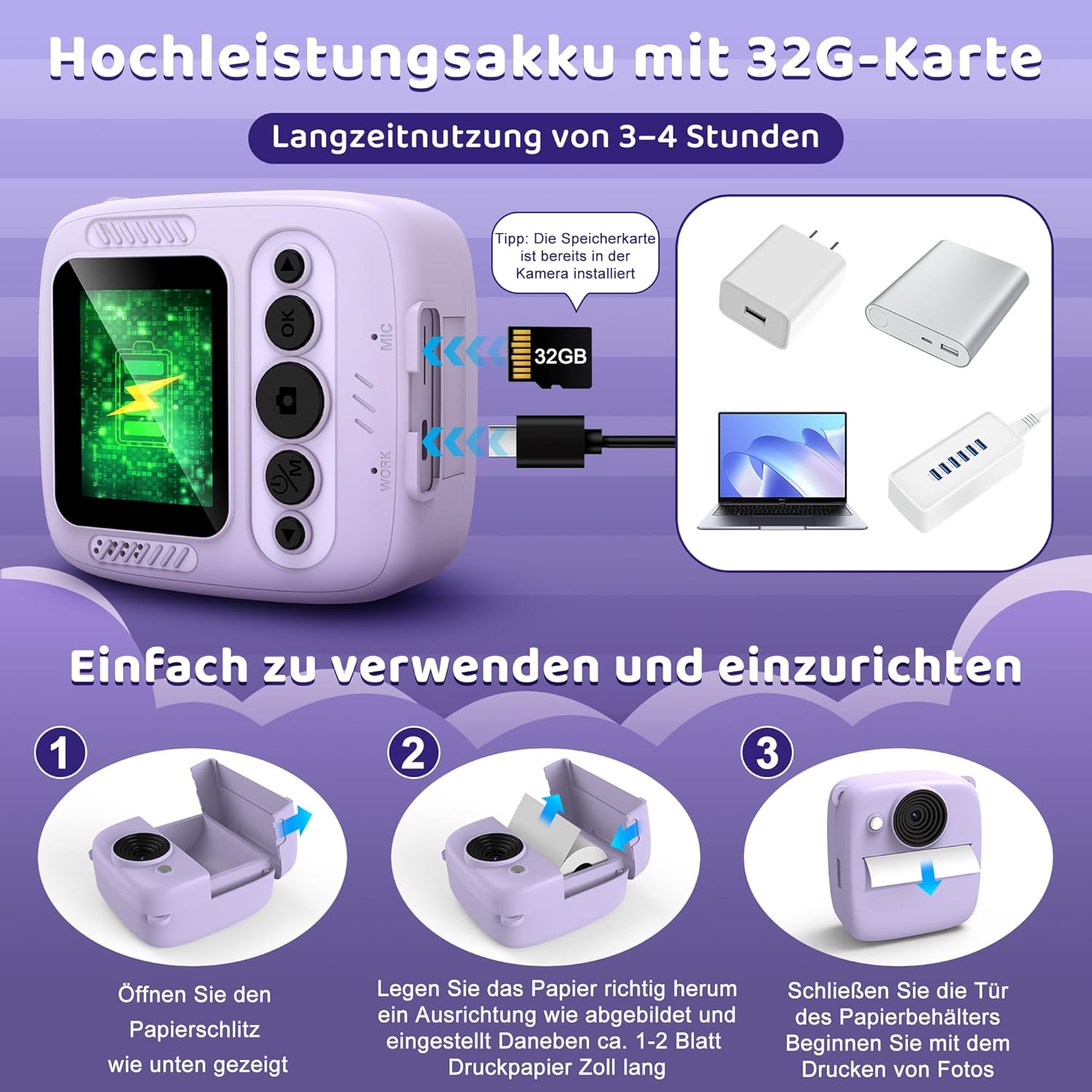 • Безопасна технология за термопечат и HD качество на изображението: използваме екологична технология за термопечат, за да гарантираме безопасността на детските фотоапарати и хартиени материали. А с висока резолюция от 48MP и 1080P видеозапис, вашите деца могат да запечатат всеки динамичен момент. Подходящо е за момчета и момичета на възраст от 3 до 12 години, за да имат ежедневни записи за срещи с приятели, училищен къмпинг, дейности на открито, училищни партита, семейни събирания и пътувания с родители с малки ръце.
