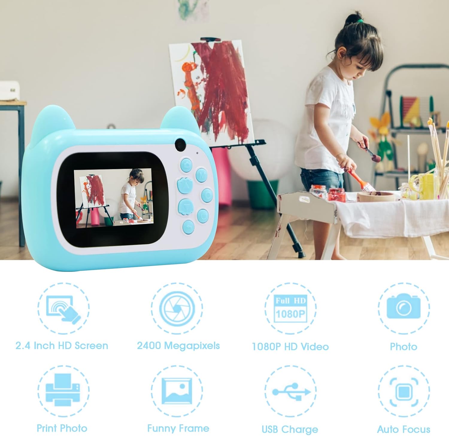 Детски фотоапарат за моментално снимане, 6,1 см LCD екран, детски фотоапарат за печат, цифров фотоапарат с 6x увеличение, 24M пиксела двоен обектив и 1080P видеорекордер, подарък за момчета и момичета (зелен)