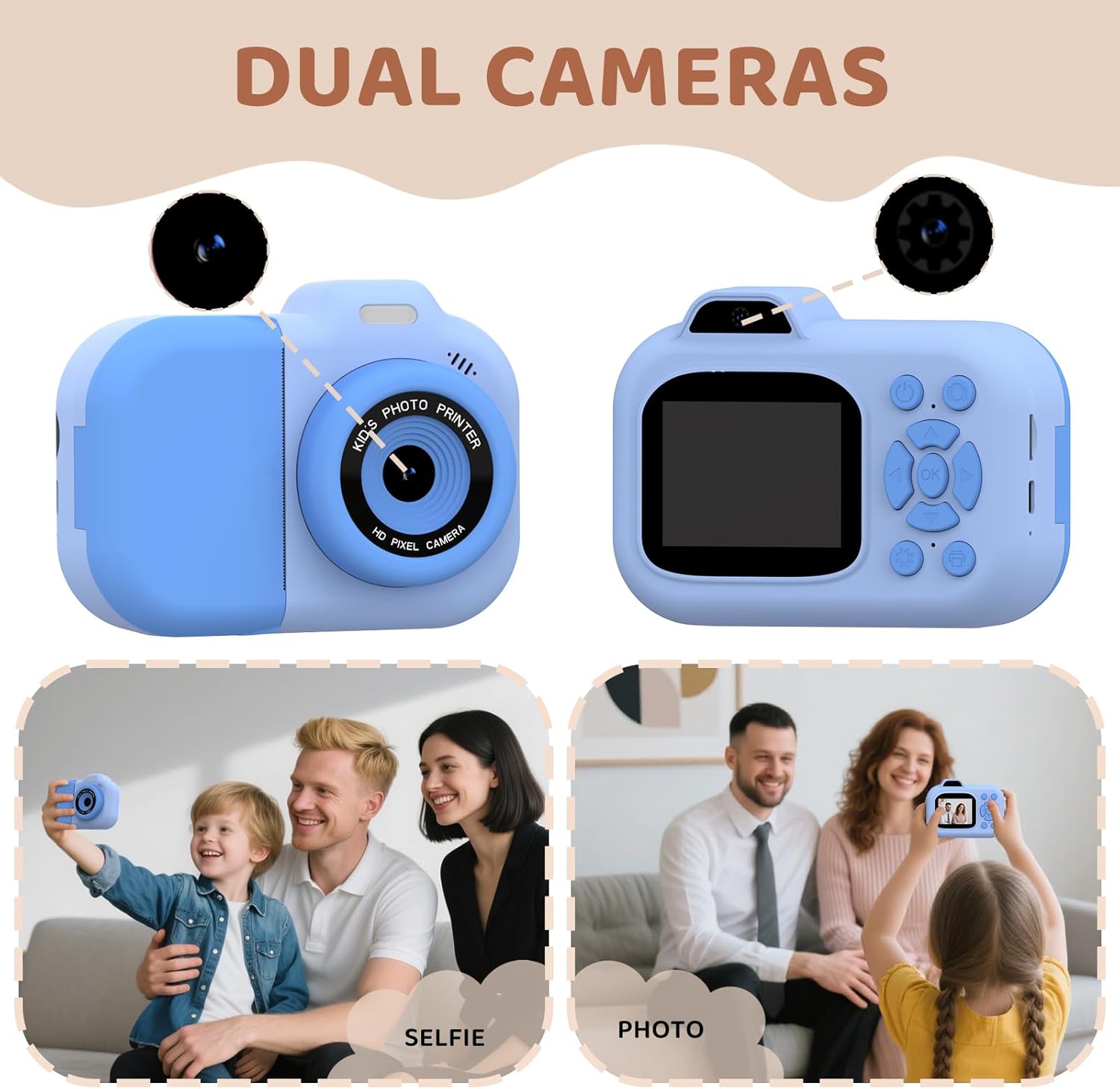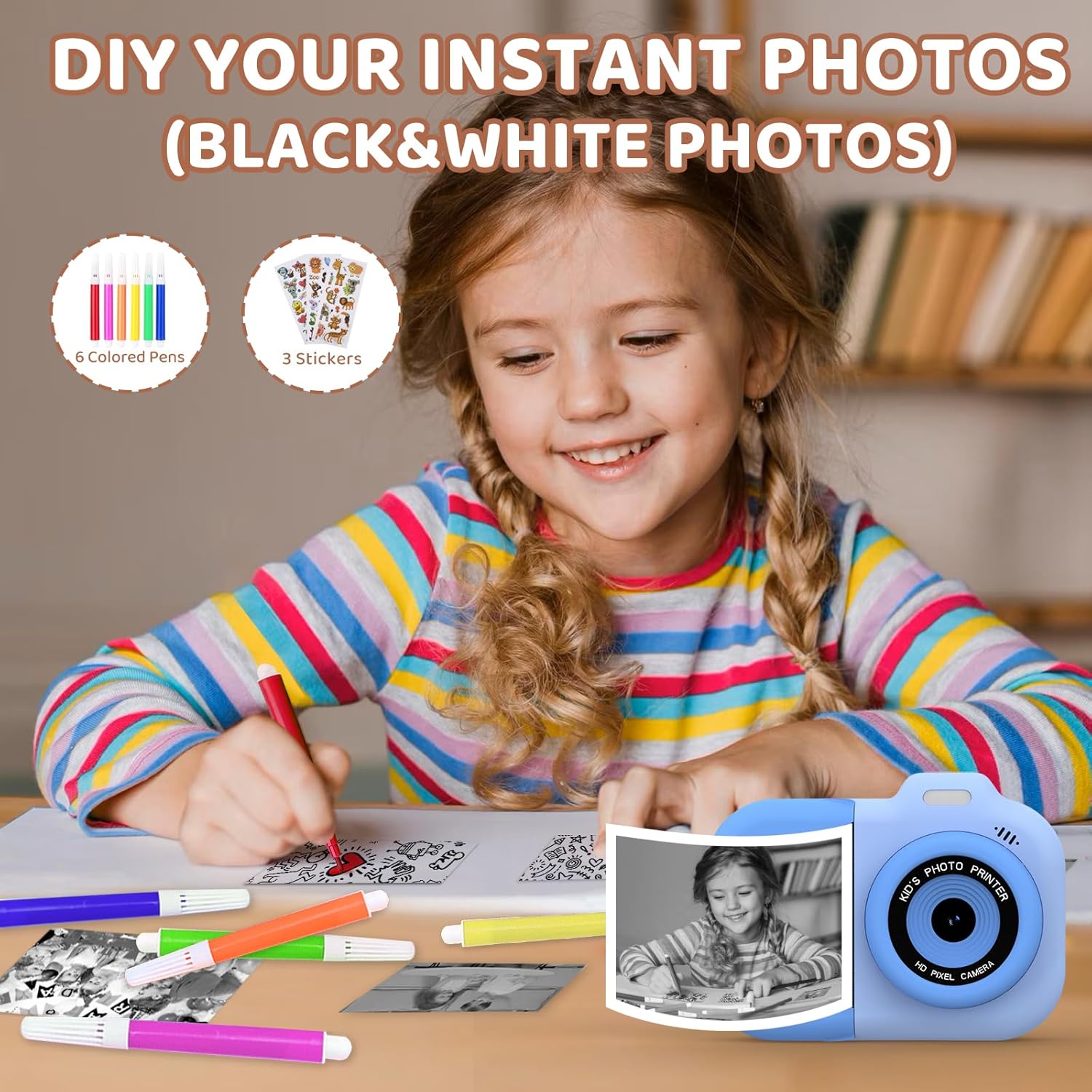• Детски фотоапарат за моментално печатане - печат без мастило. Този детски фотоапарат с термопечат не изисква мастило или тонер. С натискането на един бутон децата могат да правят черно-бели снимки и да ги разпечатват веднага. Включва 3 ролки хартия за печат за дълготрайно забавление.