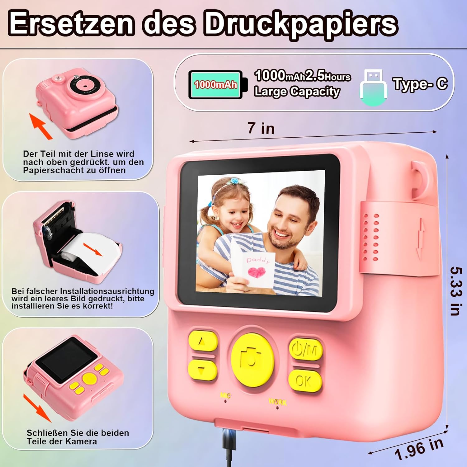 • Многофункционална детска камера: мини камера за моментално принтиране за деца, 2.4-инчов голям екран, 1080P HD видео, 16x цифрово увеличение, светкавица, time lapse, непрекъснато снимане, игри, филтър, рамка за снимки, MP3, множество функции, за да отговорят на различните нужди на децата. Това е добър избор да придружите децата си, за да растат щастливи. Запишете красивите моменти на вас и вашето семейство.
