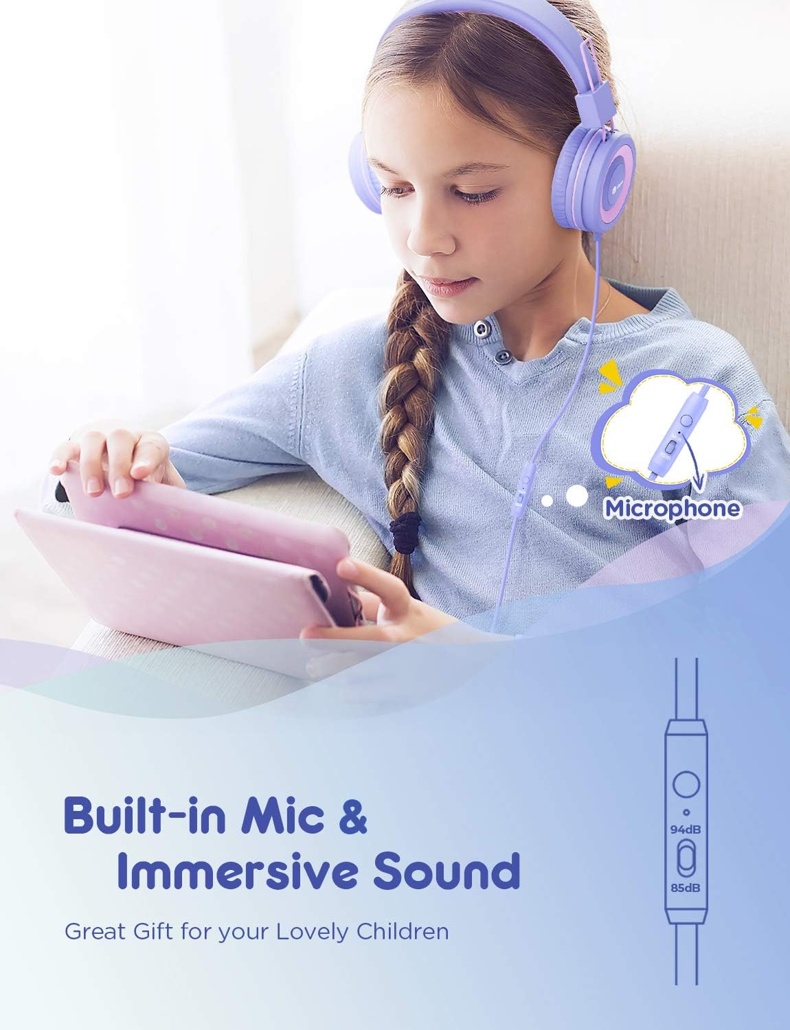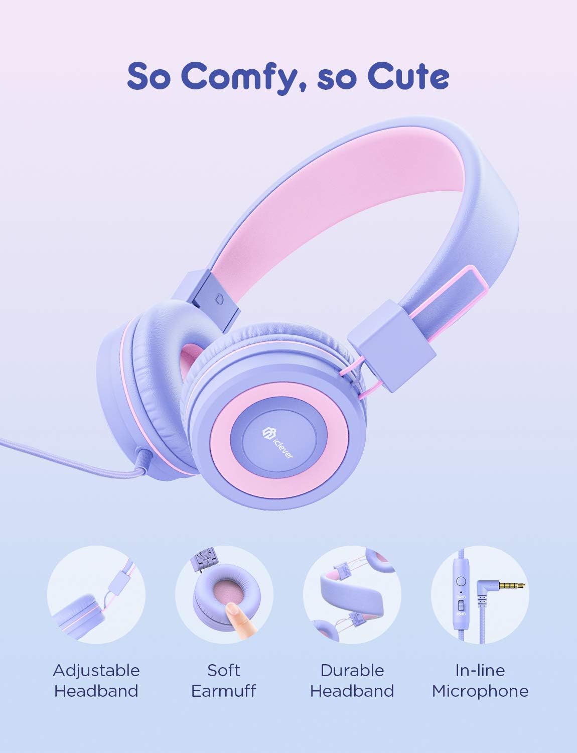 • По-безопасни слушалки за деца: Детските слушалки iClever са разработени, за да предотвратят увреждане на слуха. Те се характеризират с технология от второ поколение с безопасен лимит на силата на звука от 85 dBA, което е в съответствие с препоръките на CDC. Децата могат да слушат музика до 8 часа, без да превишават дневното ниво на шум. Това означава, че са в здравословна среда за слушане, независимо дали учат или се забавляват.